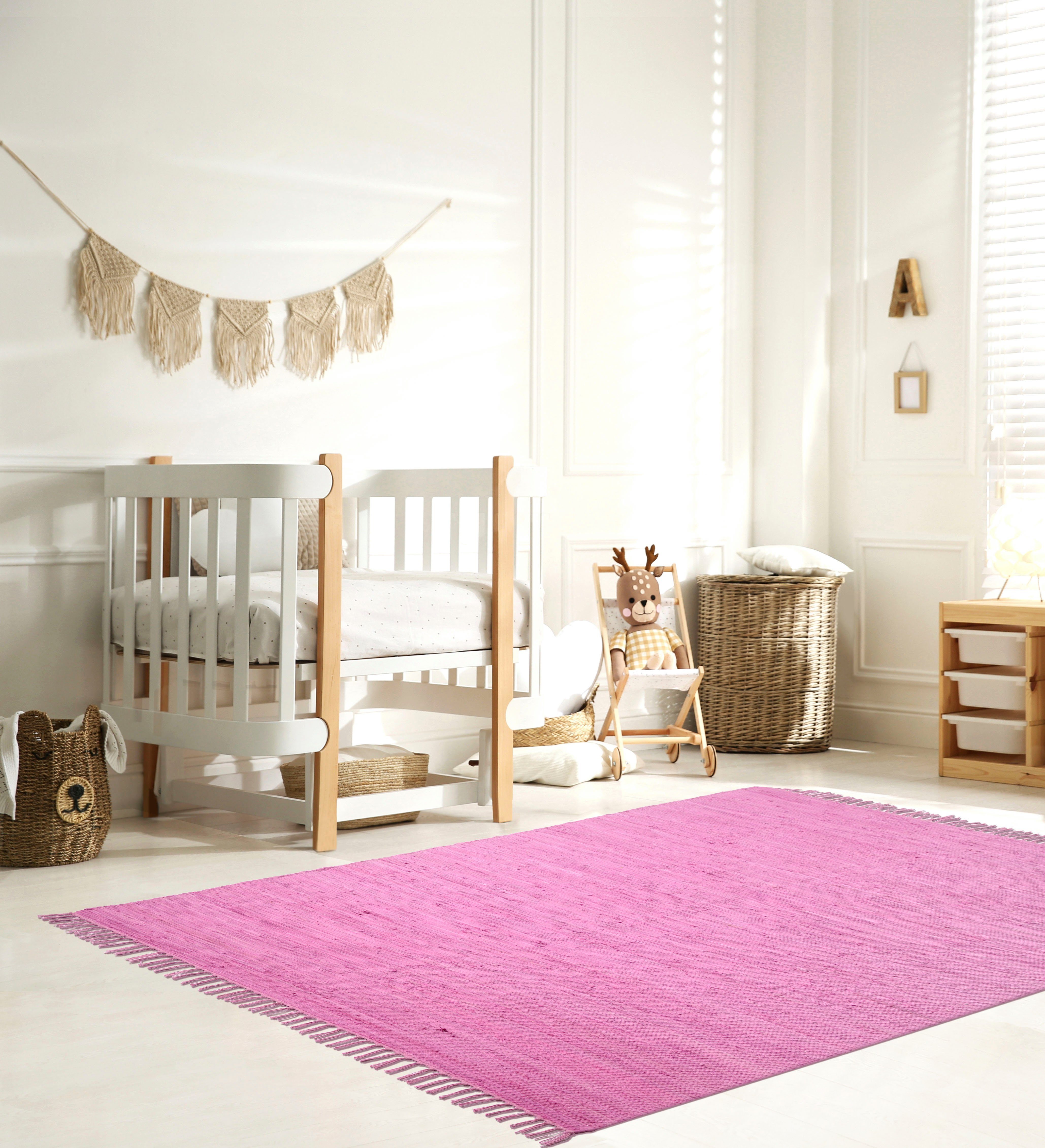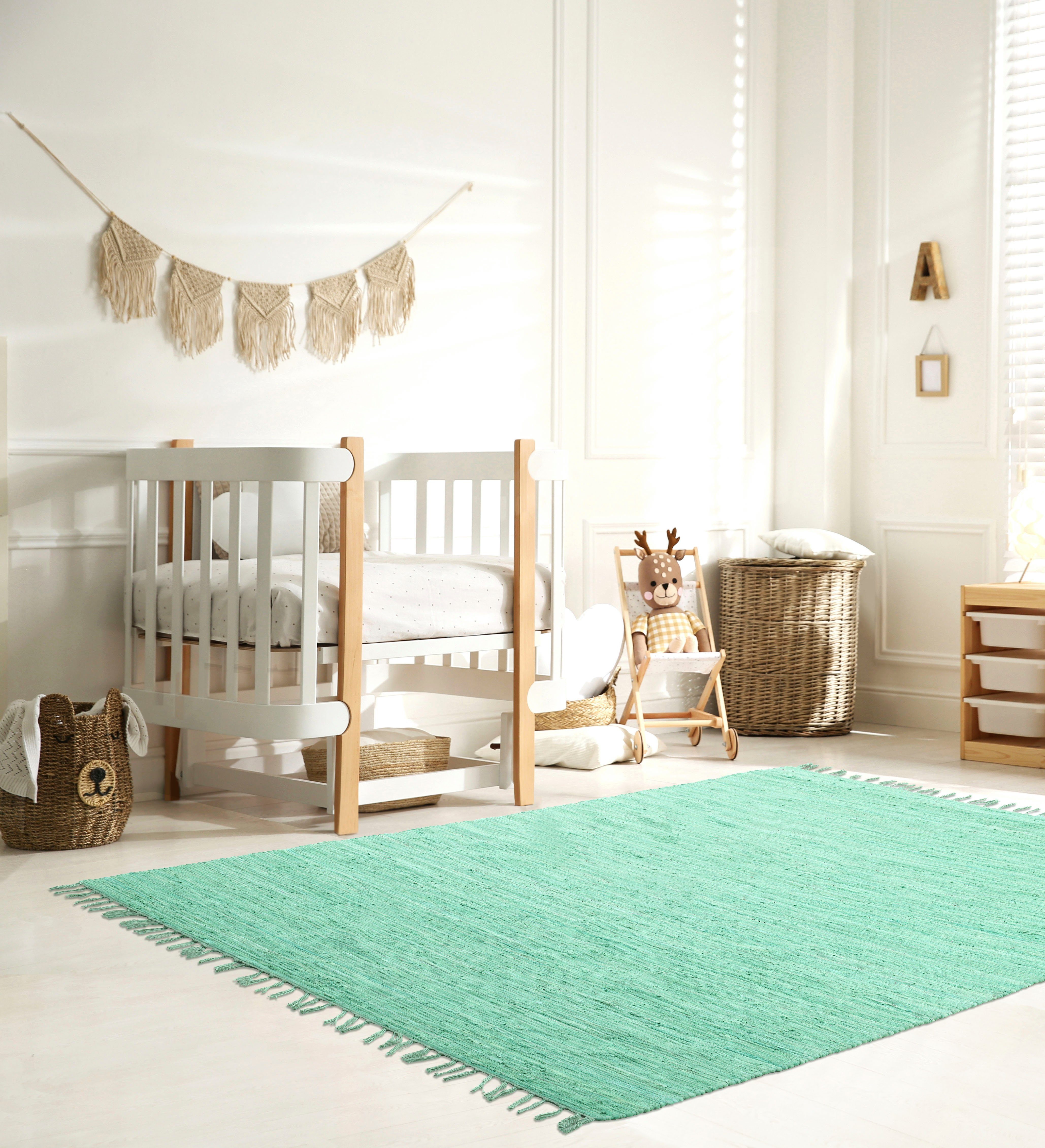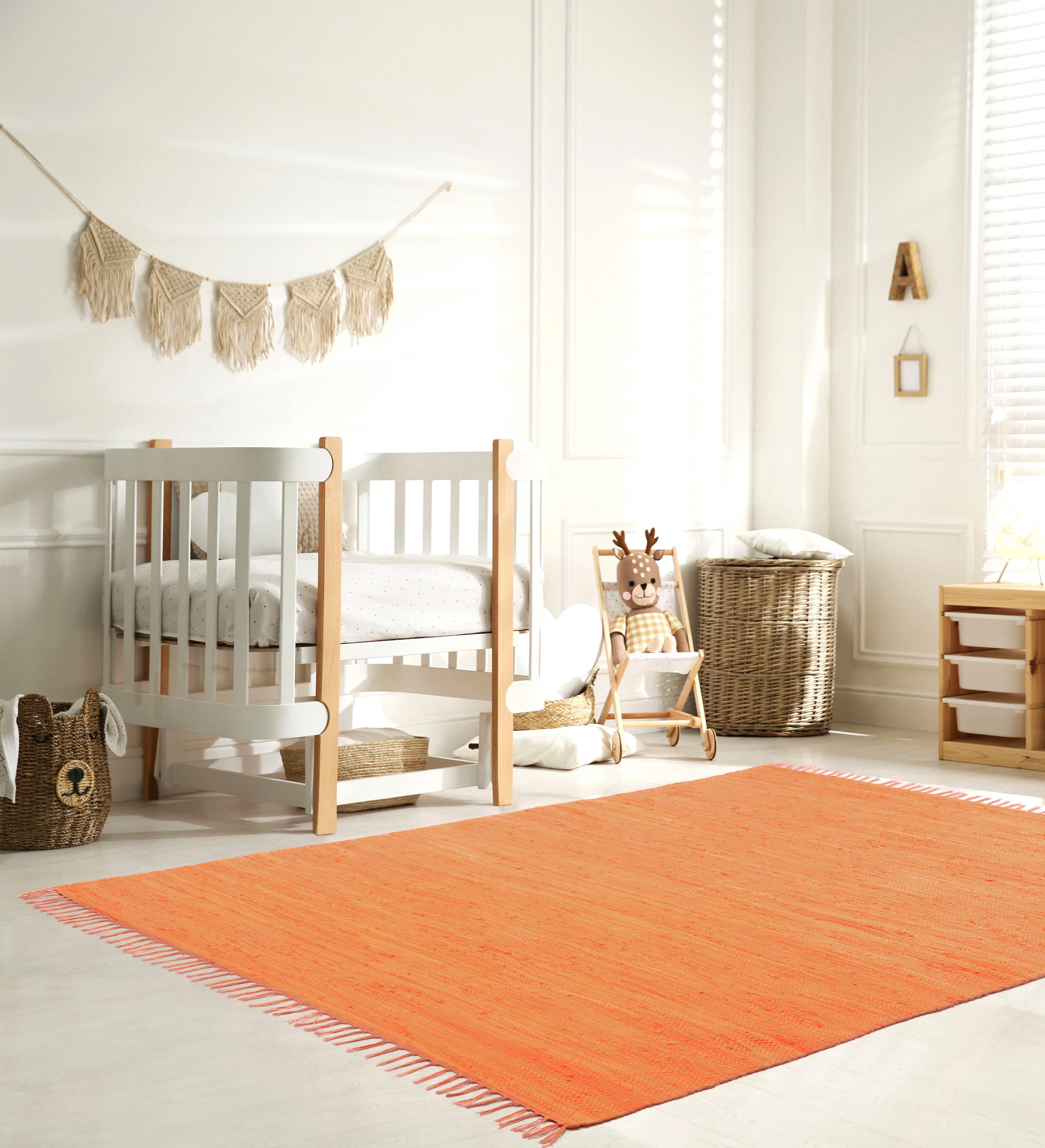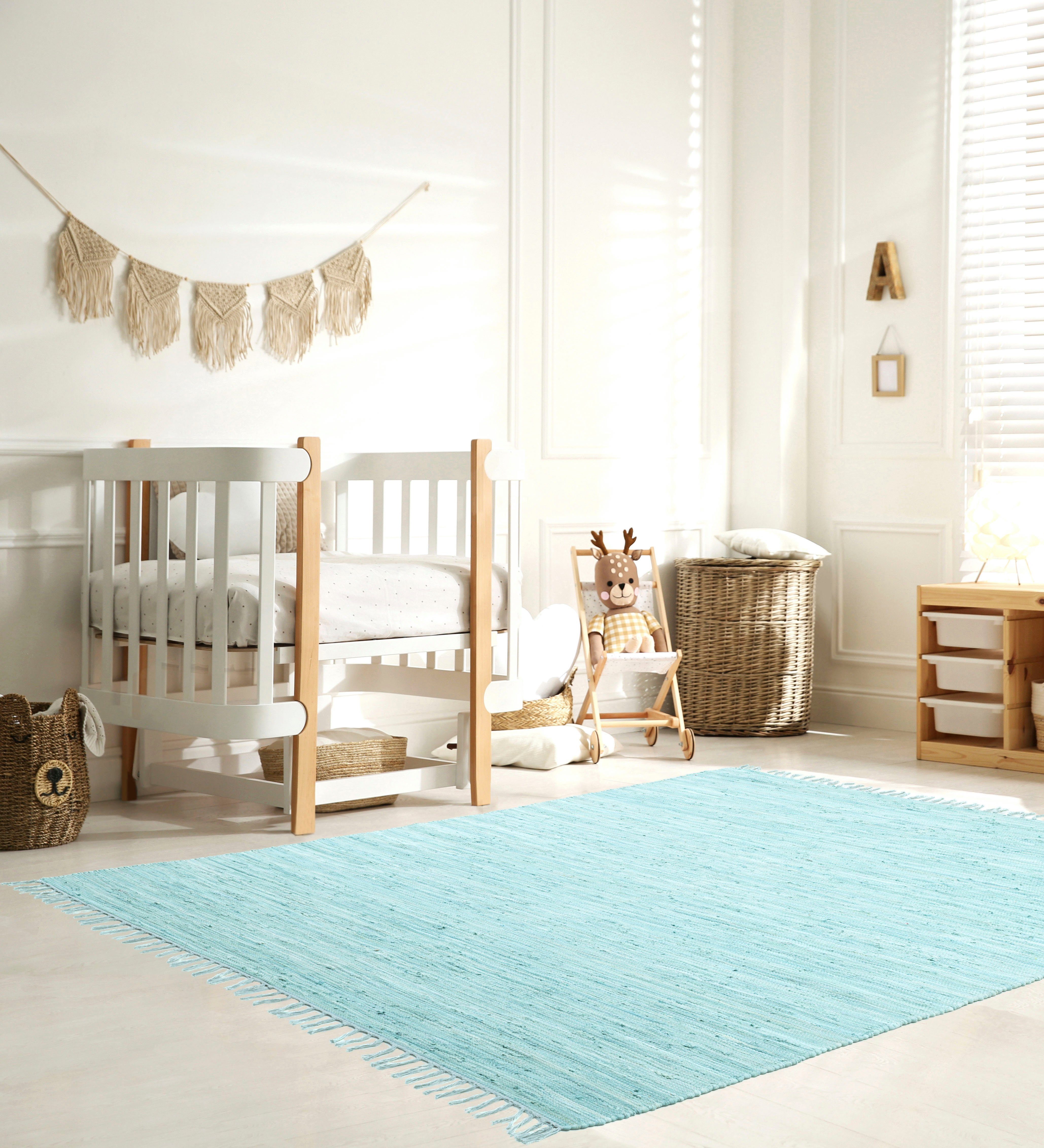 Er hat eine hohe Materialqualität dank der strapazierfähigen Baumwolle. Dadurch kannst du ihn als eine ebenso hübsche wie praktische Dekoration einsetzen. Das Material ist darüber hinaus auch strapazierfähig (waschbar bis 30°C). Die Bodendeko ist nämlich dank ihrem Flor von 5 mm wenig anfällig für Schmutz oder Staub. So bringt der Wendeteppich bei Laminat oder Fliesenboden an den richtigen Stellen eine wärmende Unterlage besonders für die, die gern am Boden liegend lesen. Vor allem für die Kleinen ist er toll, da er für Fußbodenheizung geeignet ist.