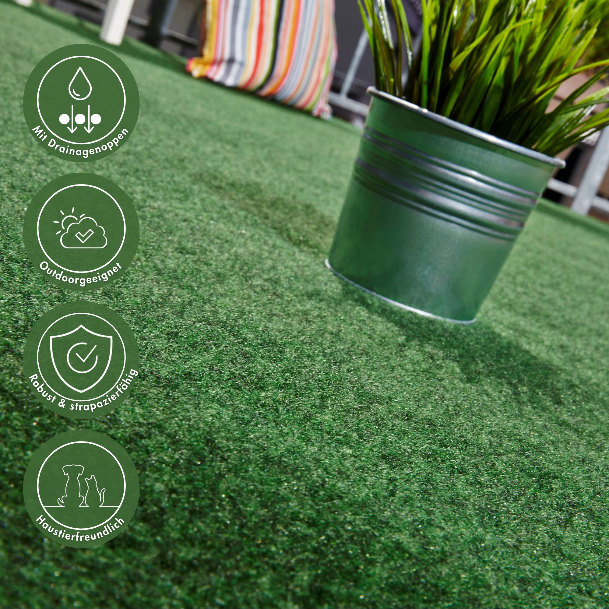 Entdecken Sie die Annehmlichkeiten eines gepflegten Rasens – ganz ohne Mähen, Bewässern oder Unkrautjäten! Unser Kunstrasen ist robust und strapazierfähig, outdoorgeeignet und überzeugt mit einer Gesamtstärke von ca. 4 mm. Er ist haustierfreundlich, kinderfreundlich und bietet durch seine dichte Struktur ein angenehmes Barfußgefühl – perfekt für Spiel und Entspannung im Freien für die ganze Familie. Die Rückseite ist mit Drainagenoppen ausgestattet und sorgt für eine zuverlässige Wasserdurchlässigkeit, sodass Regenwasser effizient abfließen kann. Dank seiner UV-Beständigkeit bleibt der Kunstrasen dauerhaft farbstabil und sorgt für eine frische Optik, selbst bei starker Sonneneinstrahlung. Ob im Garten, auf der Terrasse, dem Balkon, als Unterlage für Pools oder als eleganter Schmutzfang – dieser Kunstrasen ist vielseitig einsetzbar. Er ist leicht zu verlegen und kann individuell zugeschnitten werden, um sich jeder Fläche optimal anzupassen. Die nahtlose Oberfläche minimiert das Verletzungsrisiko und ist damit besonders für Kinder und Haustiere geeignet. Die pflegeleichte Oberfläche lässt sich im Handumdrehen von Schmutz und Laub befreien – ganz ohne Aufwand. Zudem ist das Material allergenfrei und somit ideal für Всеrgiker. Verleihen Sie Ihrem Außenbereich ein dauerhaft grünes, gepflegtes Erscheinungsbild – mit unserem hochwertigen Kunstrasen, der Funktionalität und Komfort vereint. Jetzt bestellen und sofort loslegen!