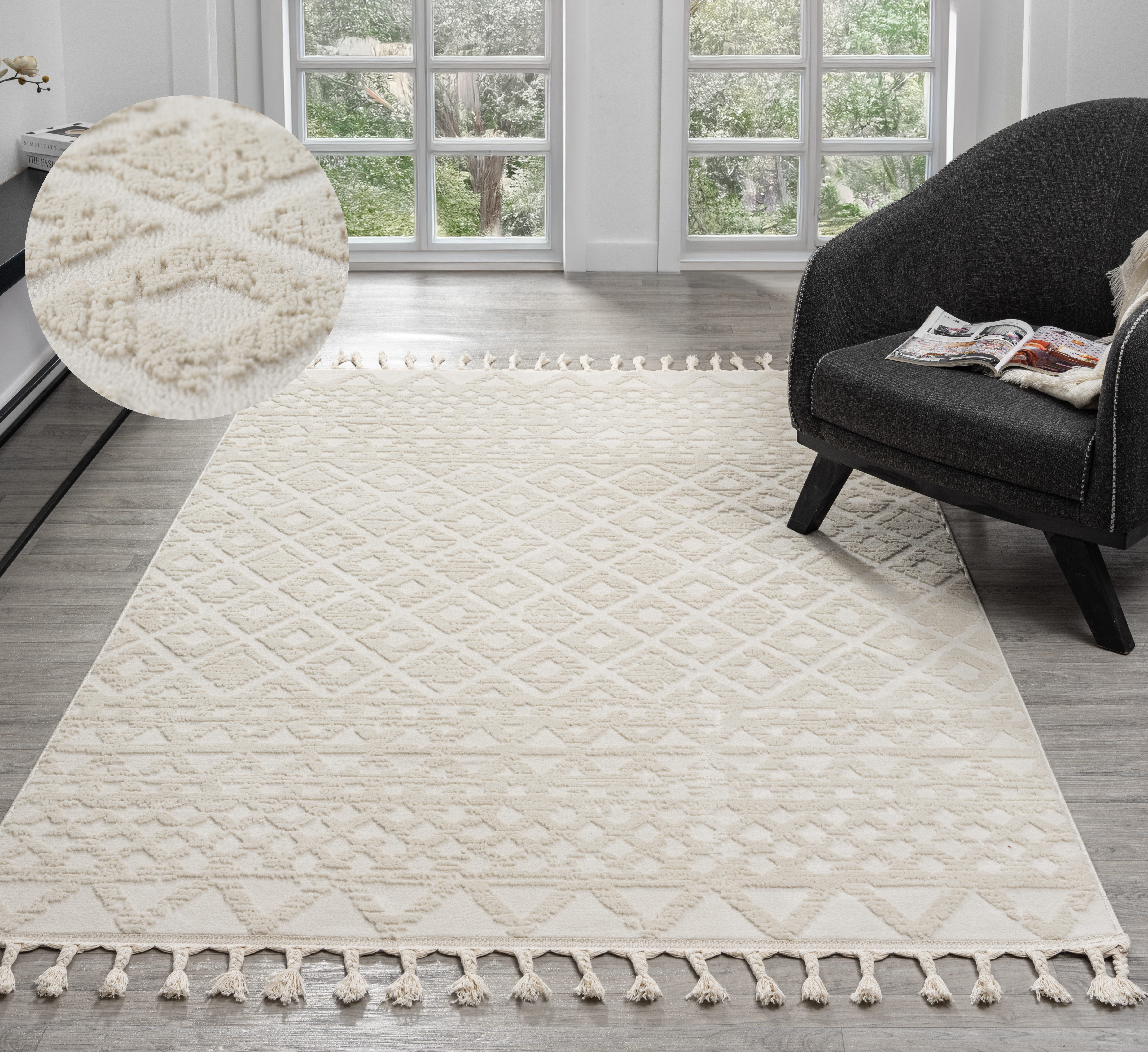 Er hat eine geringe Schmutzhaftung dank der strapazierfähigen Kunstfaser. Dadurch kannst du ihn als ein attraktives Multi-Talent nutzen. Außerdem ist das Material unempfindlich. Wenn es dir darum geht, deine Räume wohnlich zu gestalten, aber gleichzeitig einen einfach zu handhabenden Bodenbelag zu wählen, ist dieser Style mit 11 mm Flor eine gute Wahl. Zudem bringt der gewebte Teppich bei Laminat oder Fliesenboden an den richtigen Stellen eine wärmende Basis in deinen Raum. Er verringert den Trittschall, was auf vielen Böden einen hörbaren Unterschied macht.