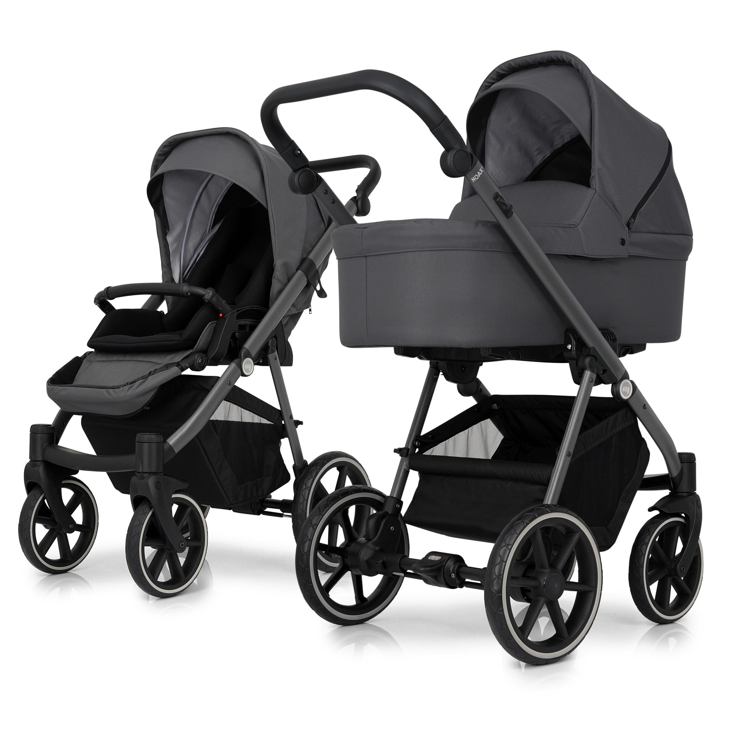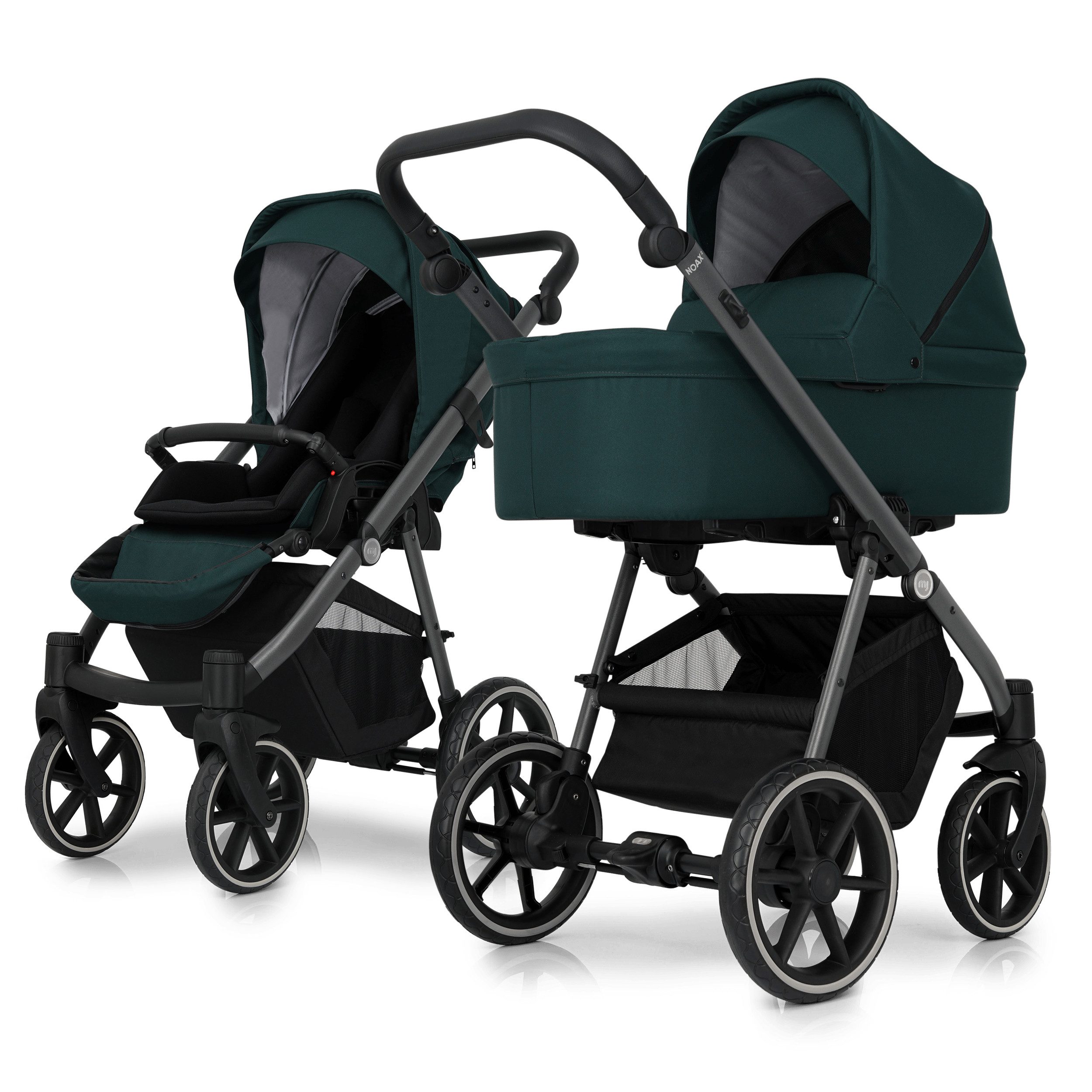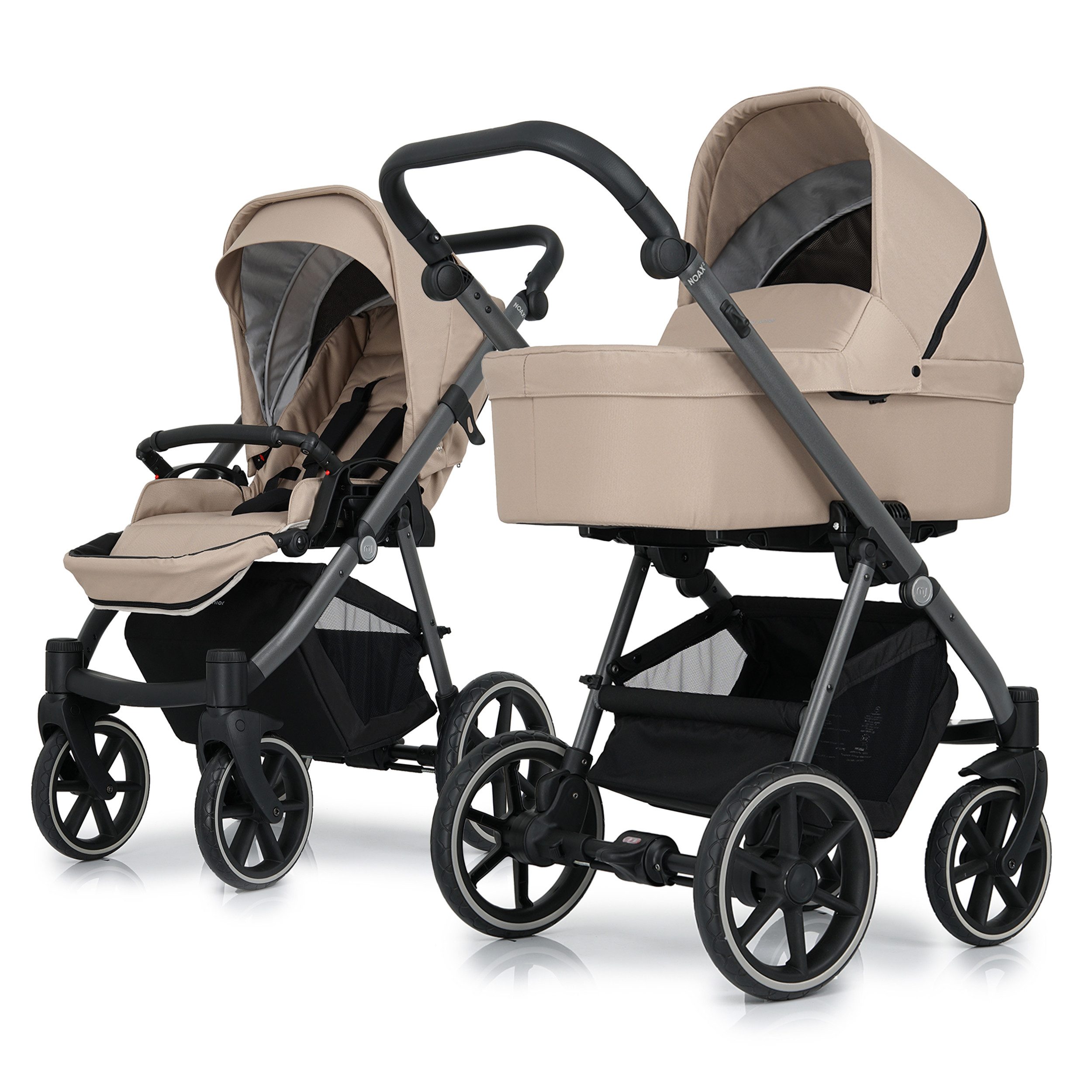 Ausstattung | Kick-Down-Bremse Memory-Klick-Funktion große Sonnenverdecke mit UV-Schutz 50+ für Babywanne & Sportsitz Sportwagensitz mit flacher Liegeposition 5-Punkt Gurtsystem am Sportsitz einstellbare Federung umsetzbarer Sportsitz höhenverstellbarer Schiebegriff Belüftungsfenster an Babywanne & Sportsitz Babywanne mit Wippfunktion AirSafe Luftkammerreifen |