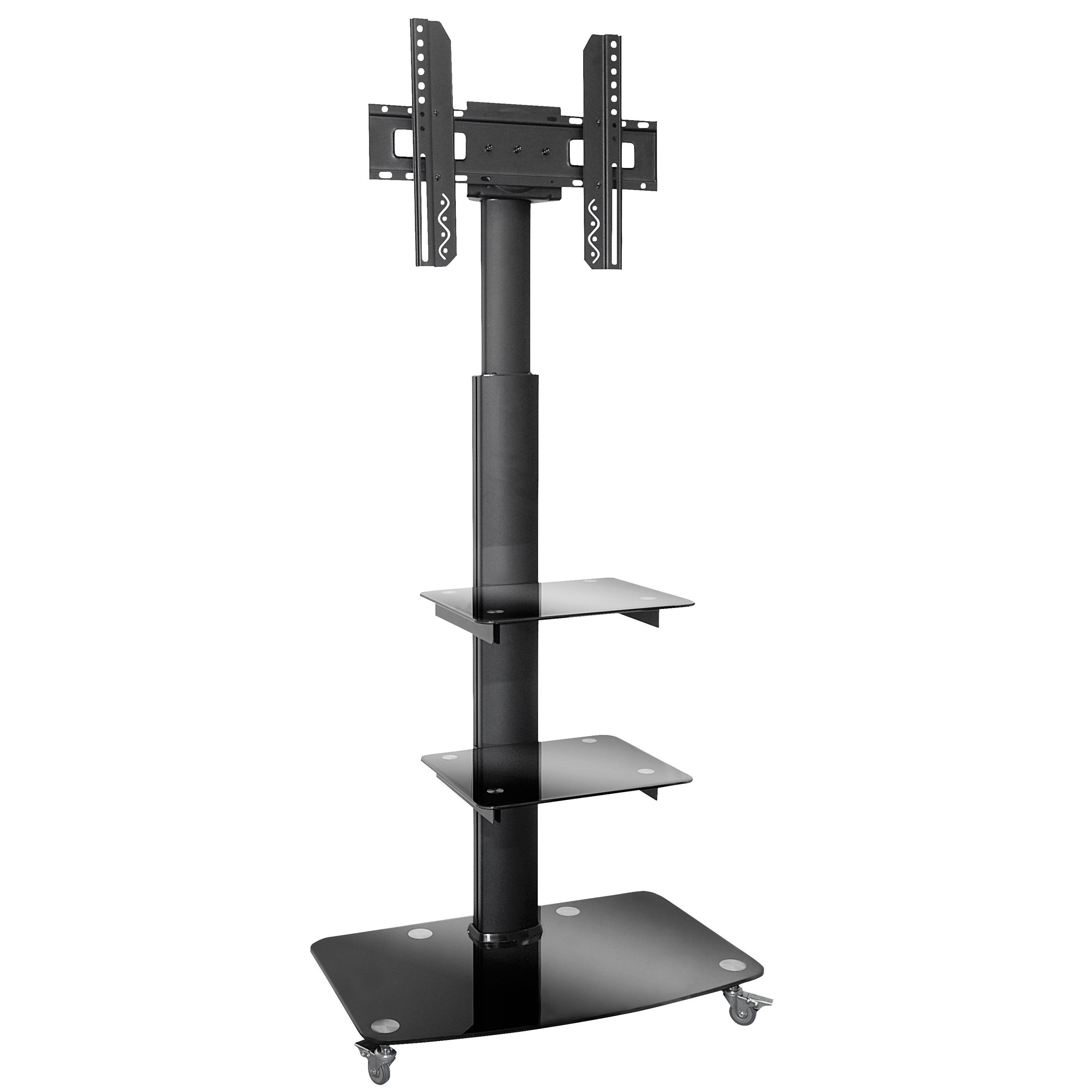 Der rollbare TV-Ständer bietet maximale Flexibilität für professionelle Präsentationen. Dank seiner Höhenverstellbarkeit lässt sich der Bildschirm optimal an die gewünschte Sicht anpassen. Die leichtgängigen Rollen ermöglichen einen mühelosen Transport, sodass Sie den perfekten Standort für Ihre Präsentation frei wählen können. Sobald die ideale Position gefunden ist, sorgen feststellbare Räder für sicheren Stand. Ein weiteres praktisches Detail: Zwei elegante Glasablagen aus robustem Sicherheitsglas bieten Platz für AV-Geräte oder Zubehör. So bleibt alles an einem Ort und lässt sich bequem bewegen.
