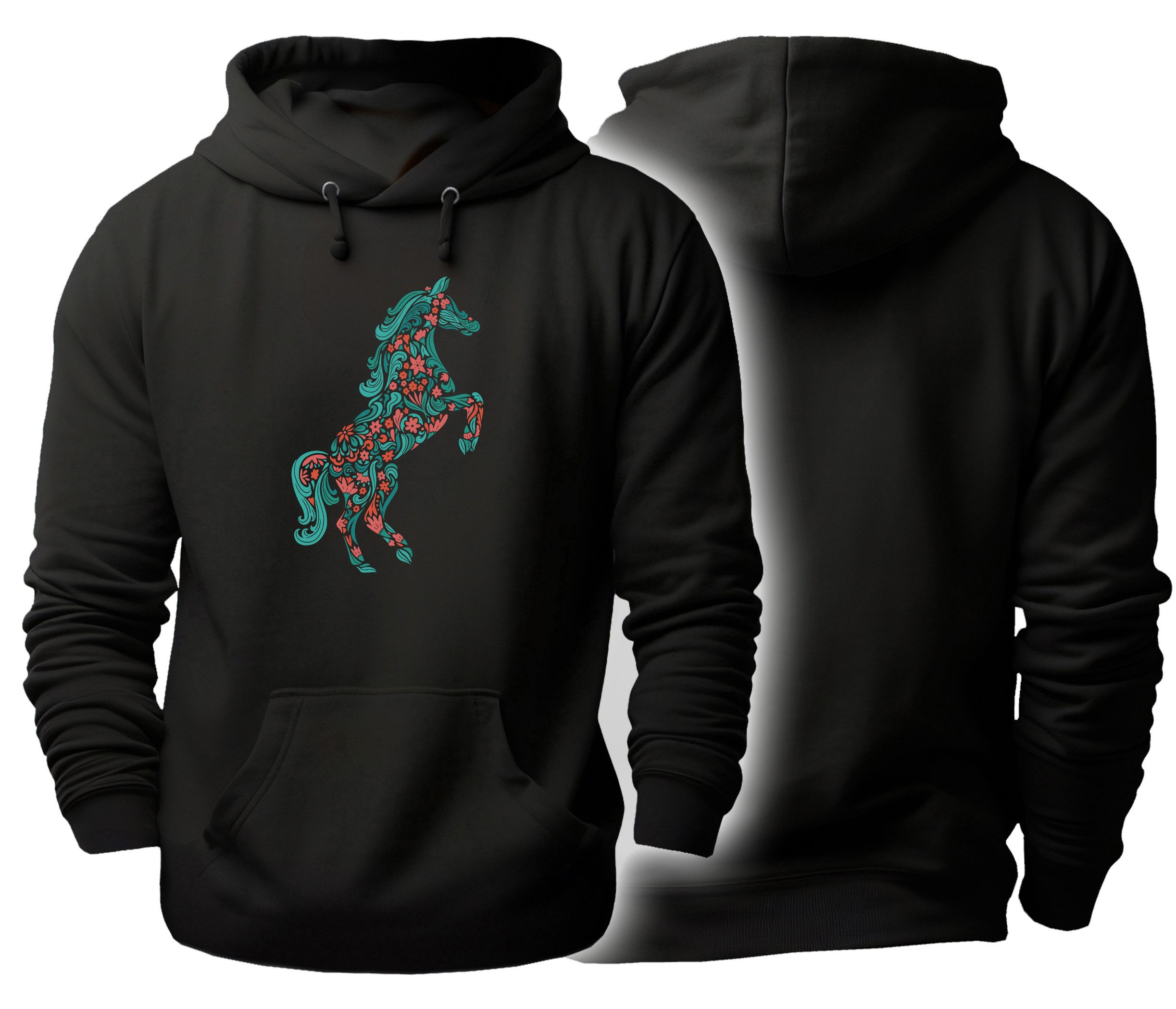 Dieser Hoodie ist mehr als nur ein Kapuzenpulli – er ist ein Statement für alle, die Pferde lieben und gleichzeitig Wert auf Stil und Komfort legen. Auf der Brust prangt ein einzigartiges Motiv: ein aufbäumendes Pferd, kunstvoll gestaltet aus floralen Mustern in kräftigem Türkis und warmem Korallrot. Damit wird der Kapuzensweater zu einem echten Hingucker, der sofort alle Blicke auf sich zieht. Ob als sportlich-lässiger Sweater zum Überziehen nach dem Training, als stylisch-wärmender Begleiter für kühle Tage oder als gemütlicher Kapuzenpullover für entspannte Abende – dieser Pferde Hoodie vereint Mode und Leidenschaft auf besonders kreative Weise. Dank der hochwertigen Baumwoll Polyester Mischung überzeugt der Hoodie mit hohem Tragekomfort, einer weichen Oberfläche und atmungsaktiven Eigenschaften. Die praktische Kängurutasche bietet Platz für kalte Hände oder kleine Dinge, die man unterwegs griffbereit haben möchte, während die gemütliche Kapuze mit Tunnelzug für zusätzlichen Schutz sorgt. So wird aus einem einfachen Herren Hoodie oder Damen Hoodie ein echter Lieblingspullover, den man gar nicht mehr ausziehen möchte. Auch als Geschenkidee macht der Kapuzenpulli richtig Eindruck: Ob als originelles Geburtstagsgeschenk, persönliche Überraschung für Pferdefans oder als besonderes Weihnachtsgeschenk – mit diesem detailverliebten Motiv liegst du garantiert richtig. Der Pferde Hoodie vereint alles, was man sich wünscht: wärmend, bequem, sportlich, stylisch und voller Charakter. Ein Sweater, der Mode und Leidenschaft verbindet und dabei sowohl im Alltag als auch in der Freizeit eine großartige Figur macht.