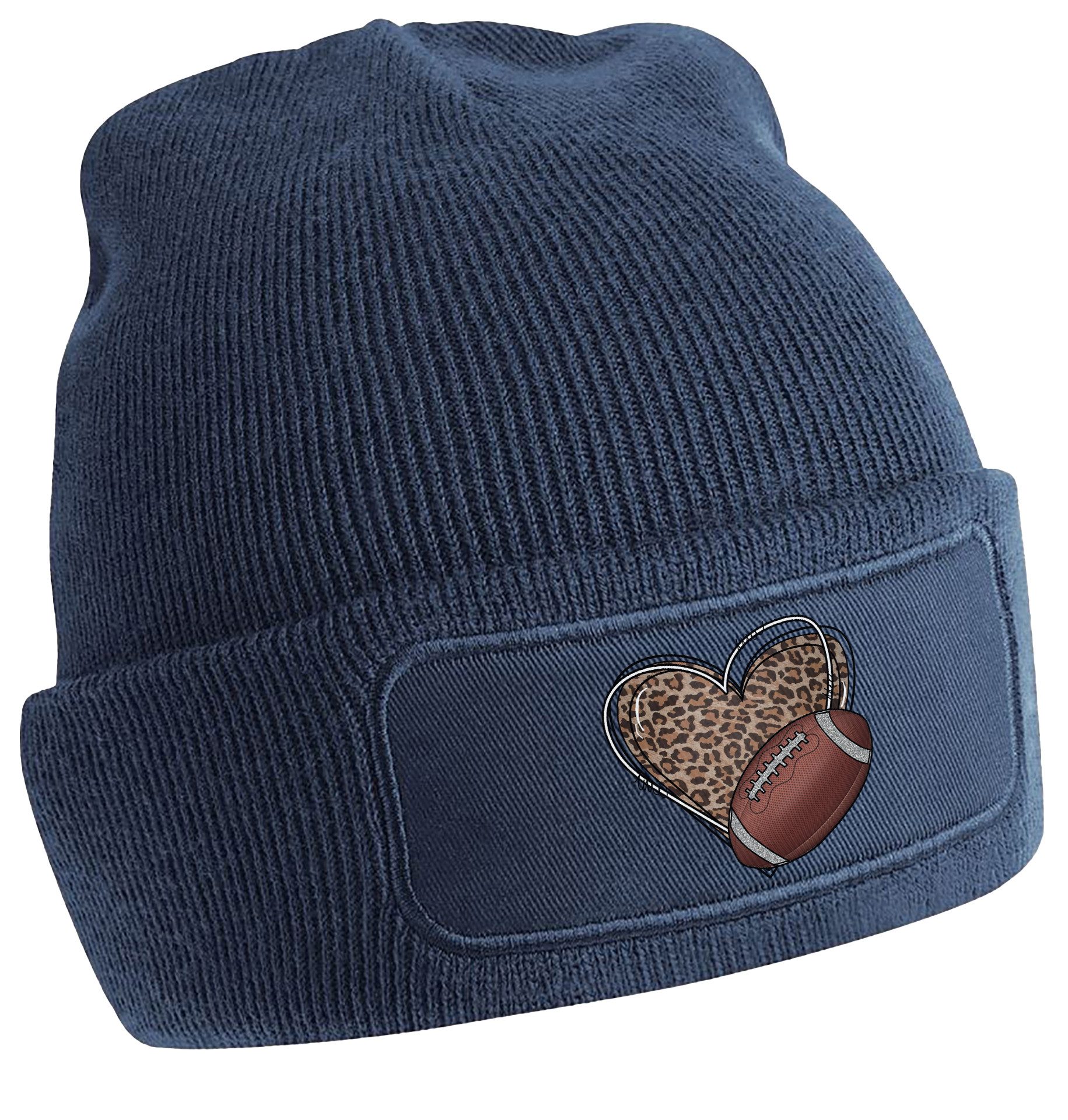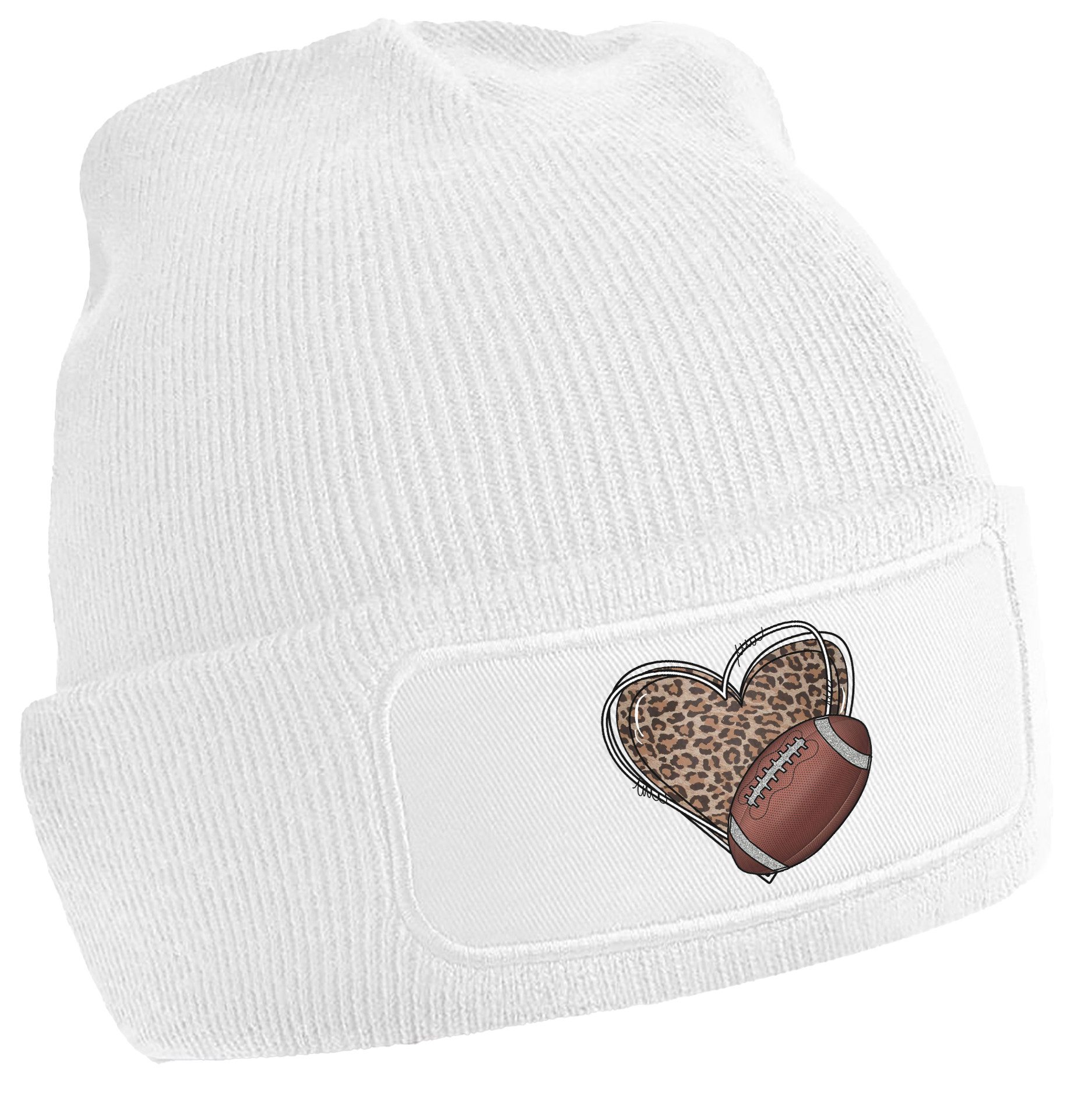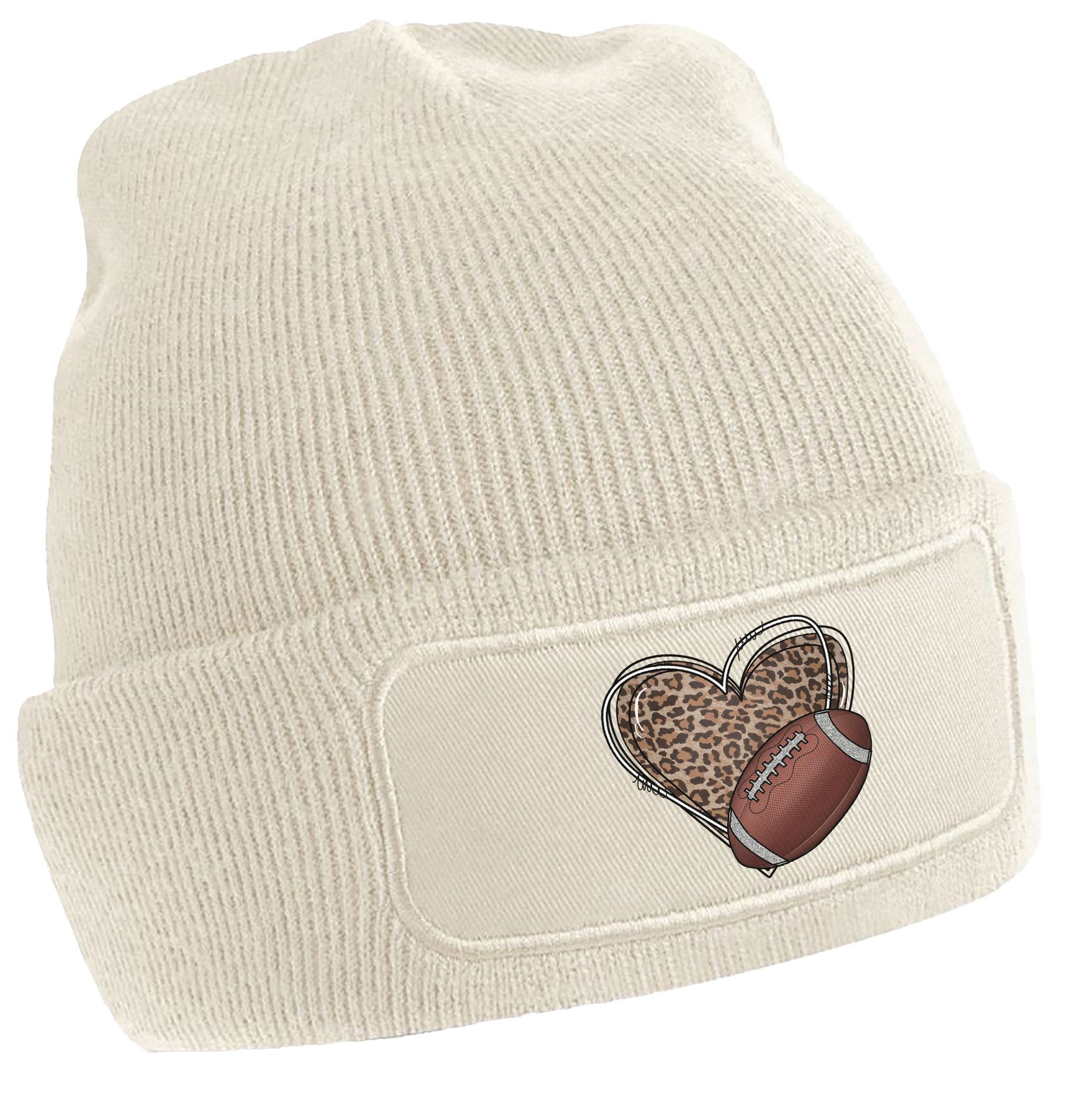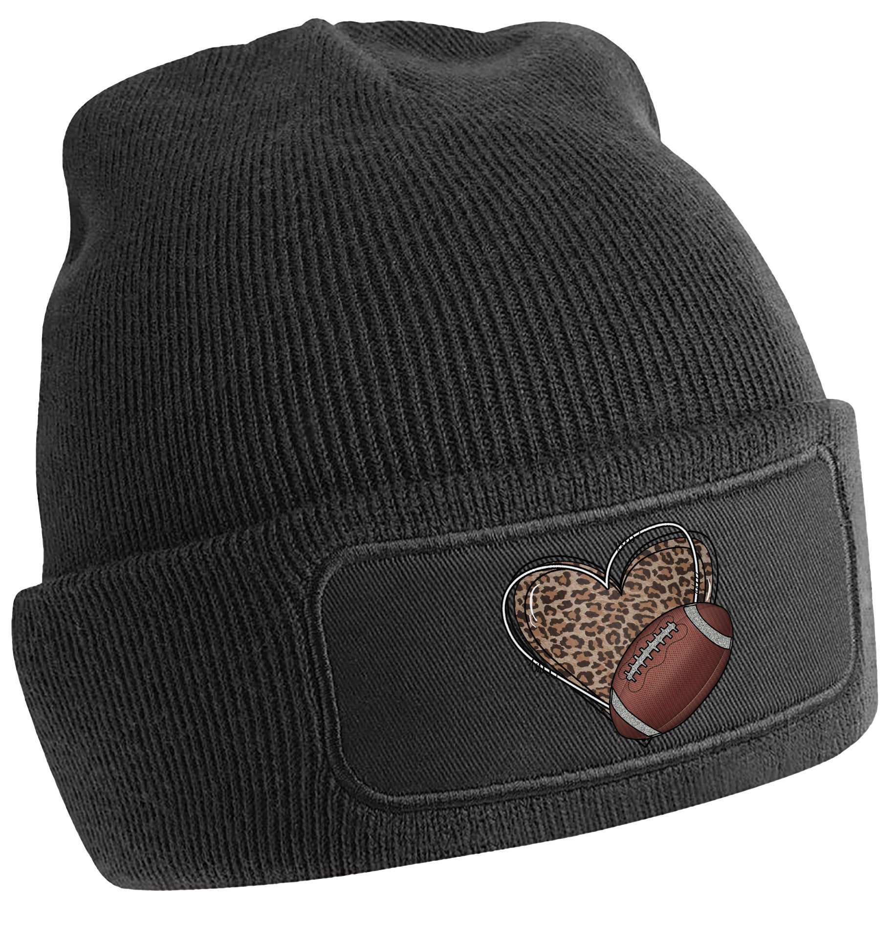 Stylische Strickmütze mit coolem Football-Print und markantem Wildmuster-Herz – ein perfektes Accessoire für Sportfans und Modeliebhaber gleichermaßen.