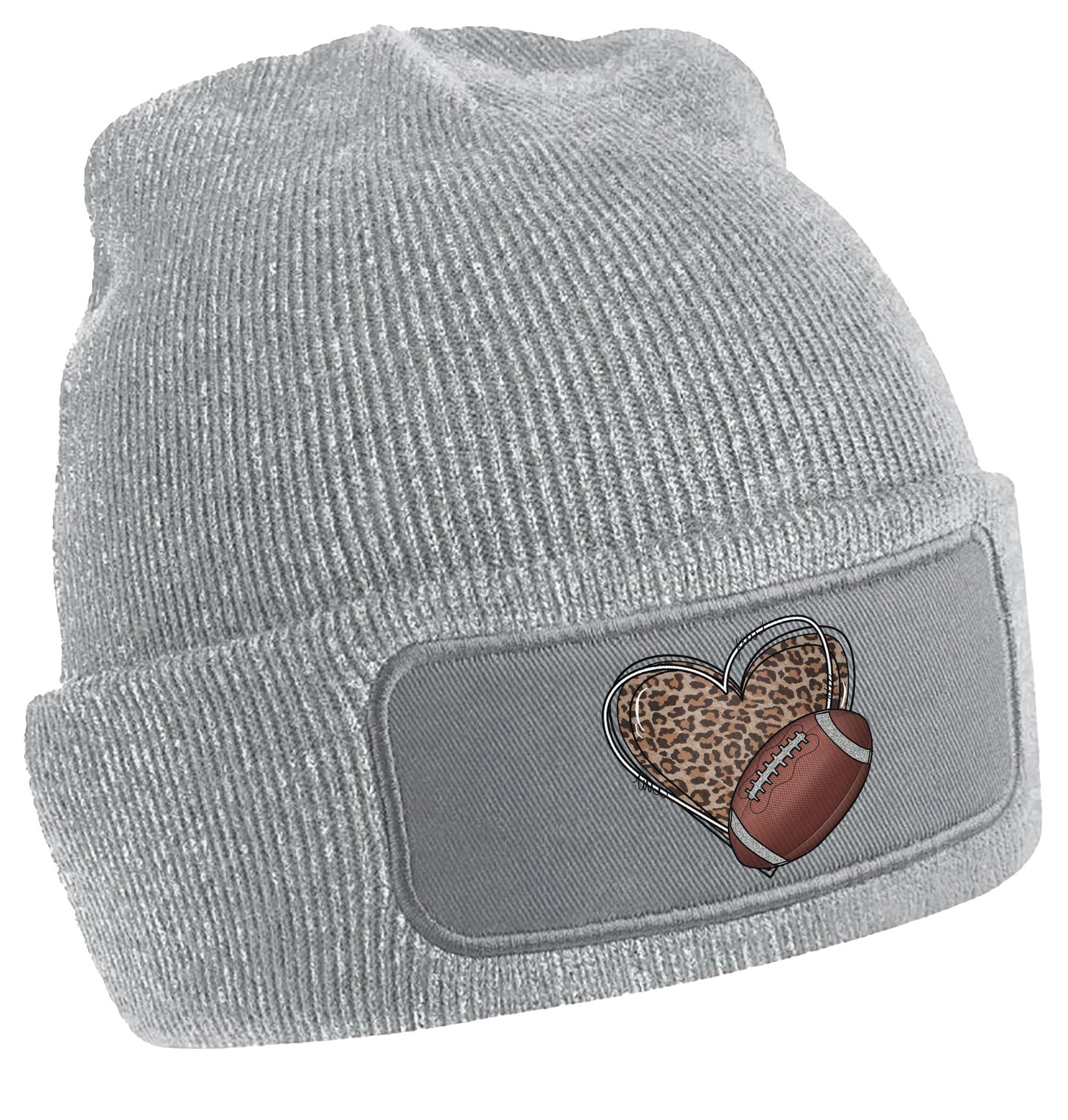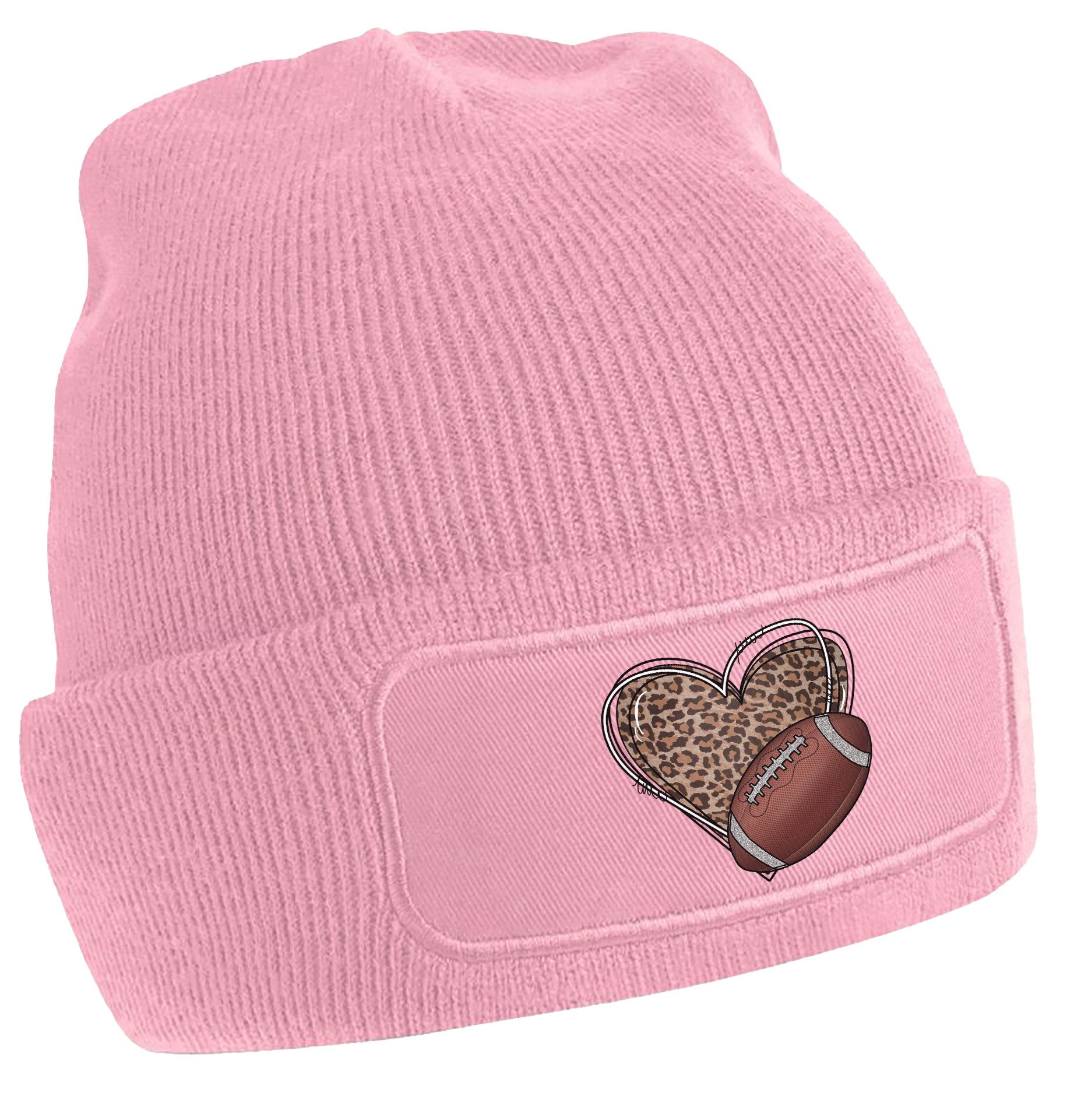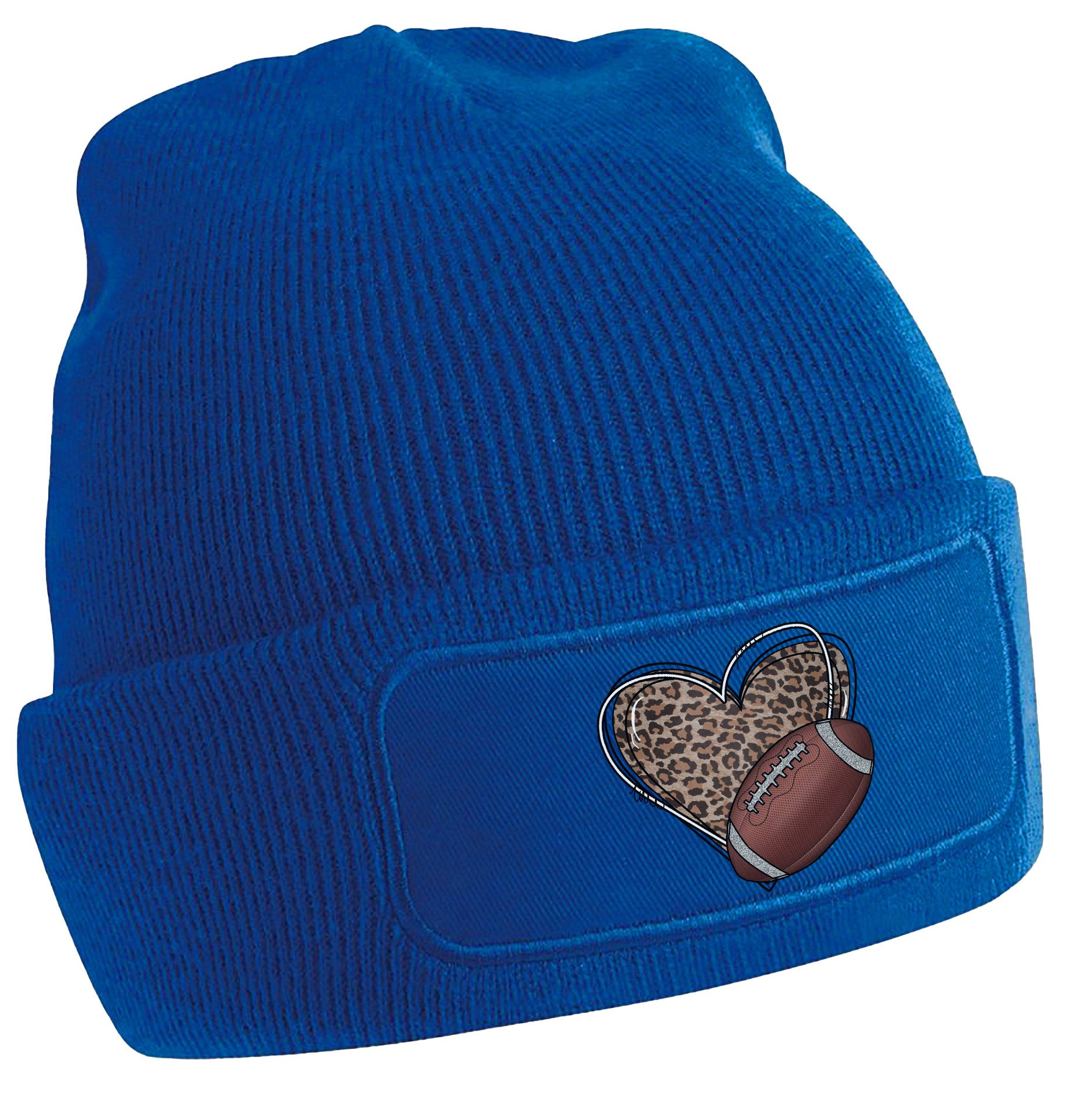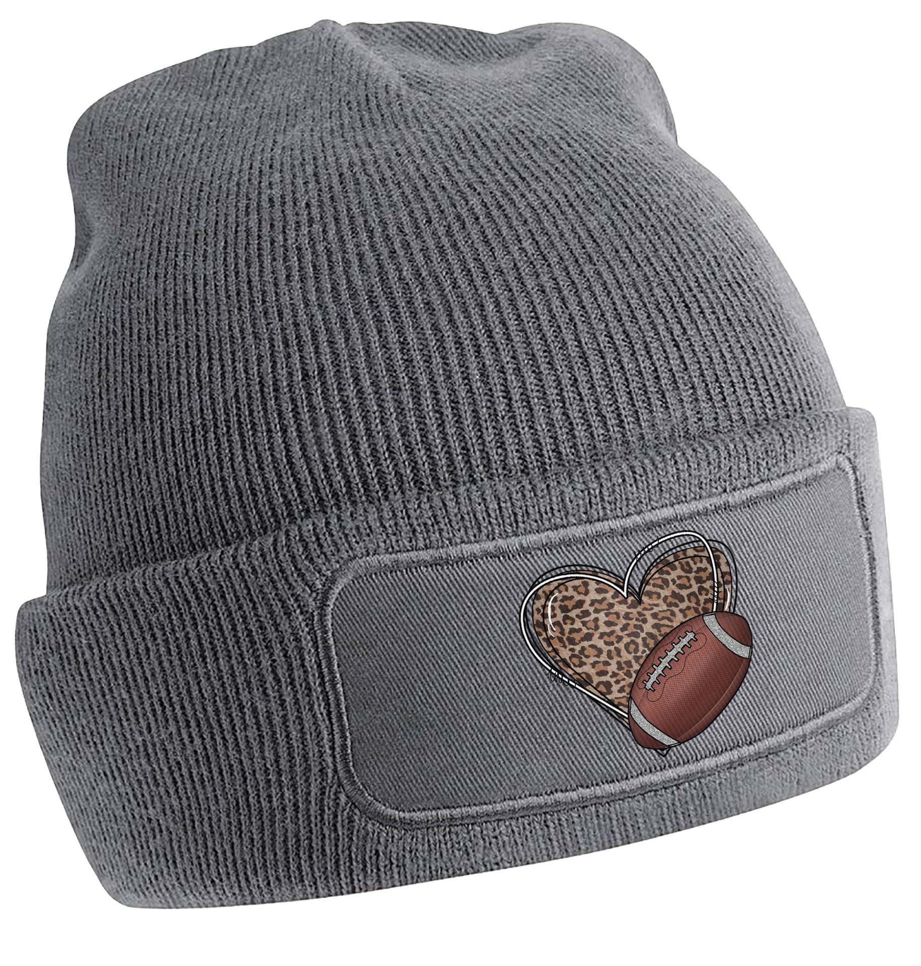 Stylische Strickmütze mit coolem Football-Print und markantem Wildmuster-Herz – ein perfektes Accessoire für Sportfans und Modeliebhaber gleichermaßen.