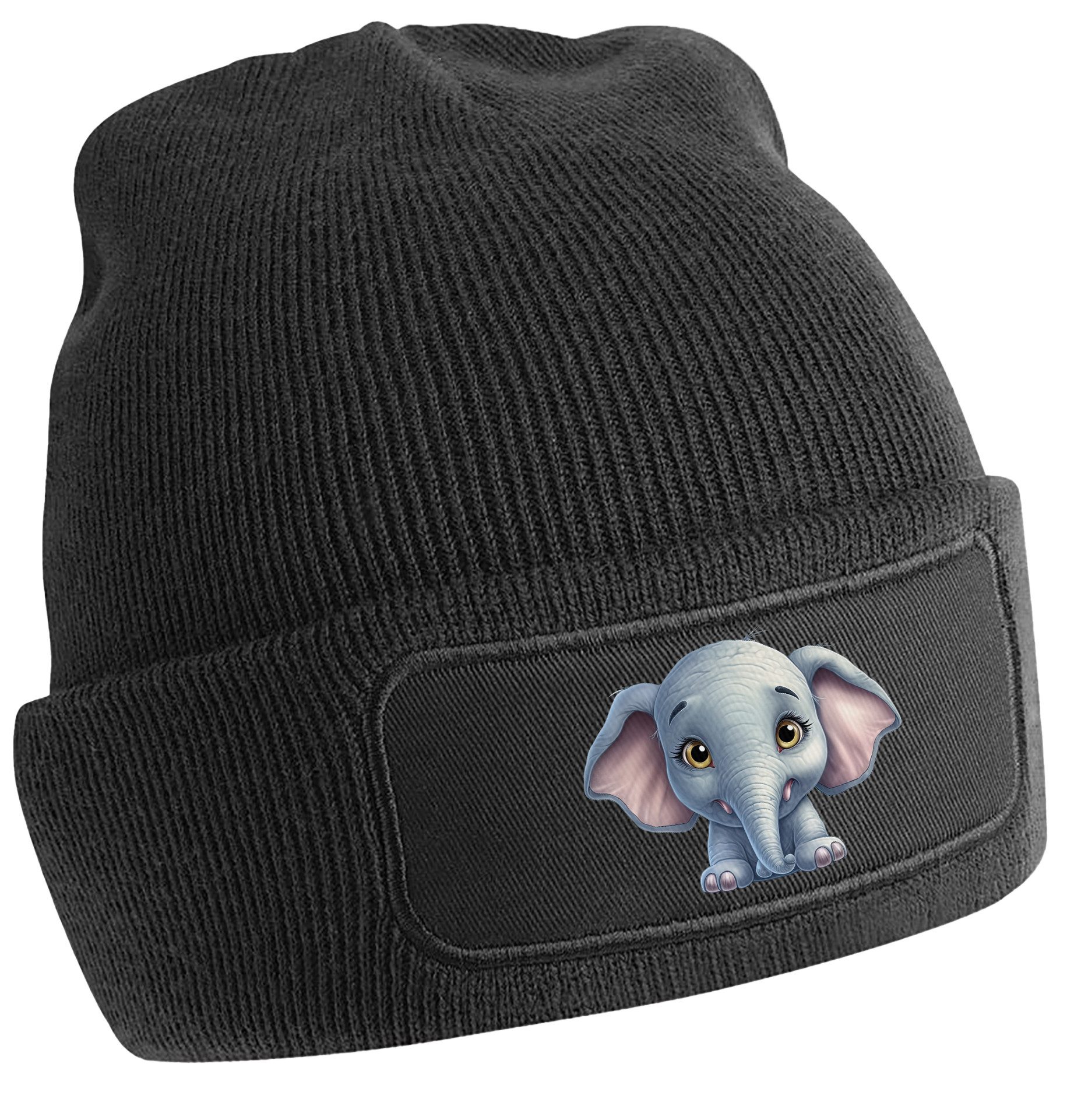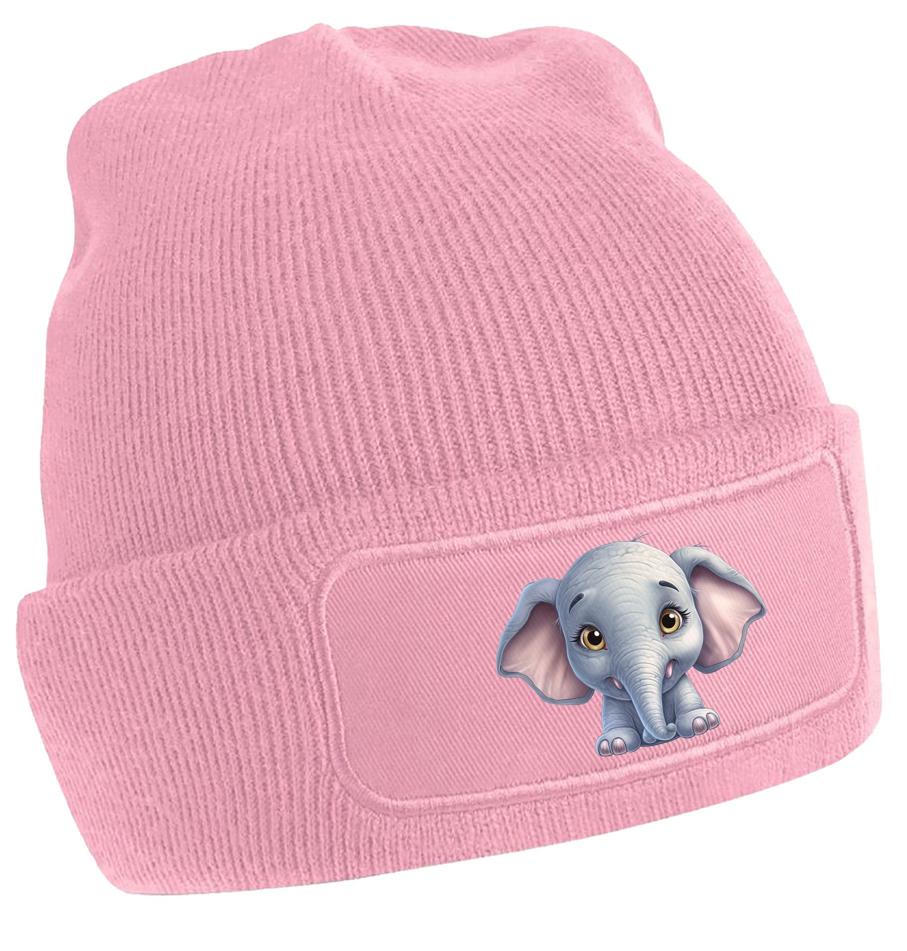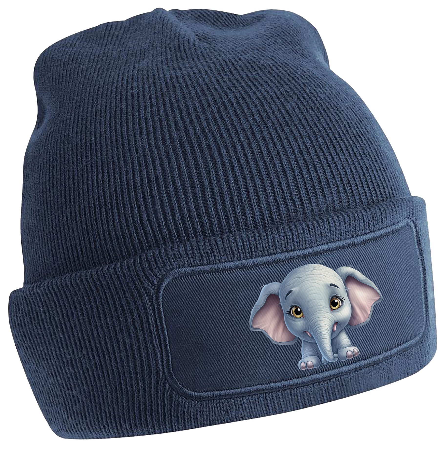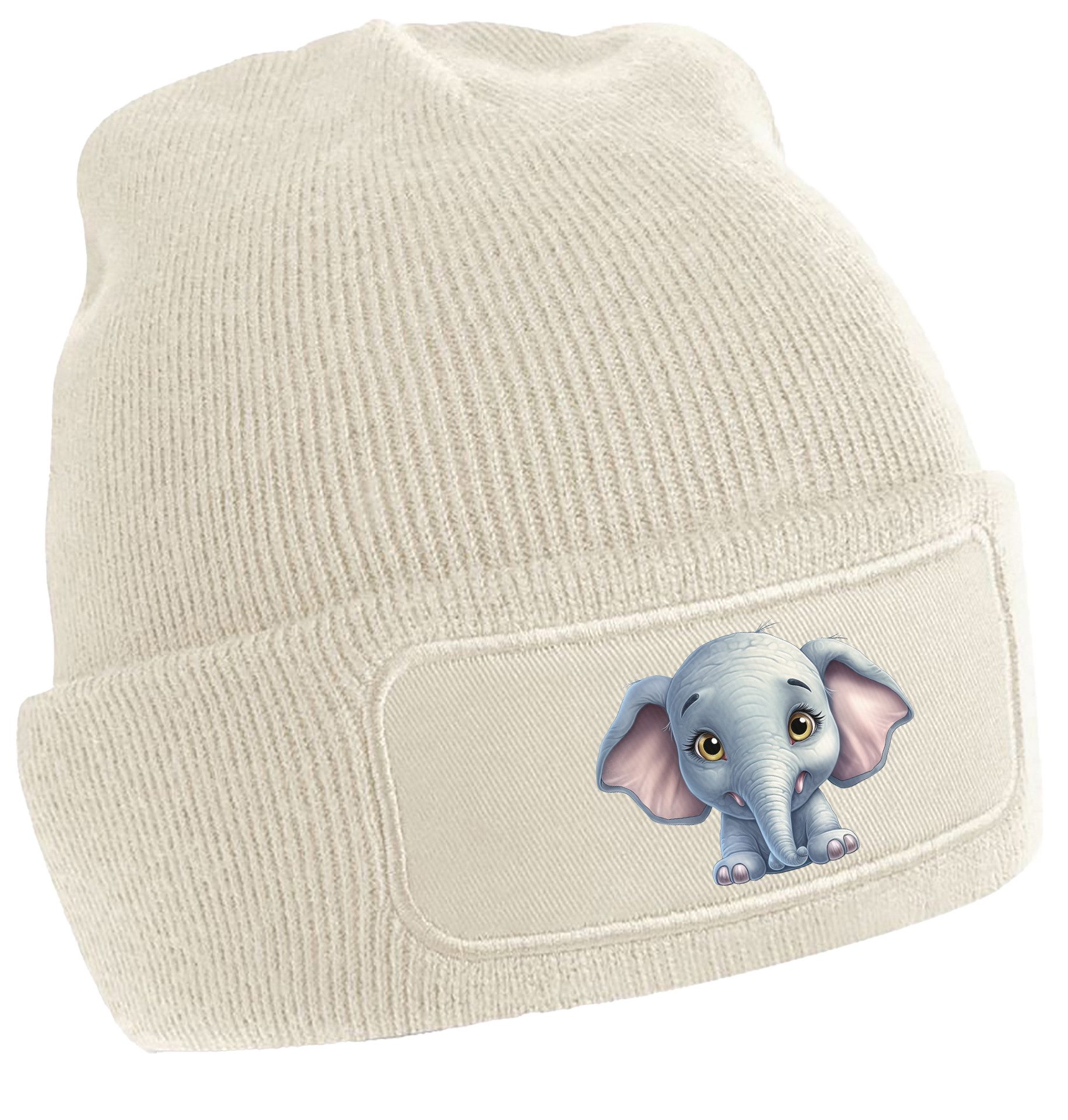 Wärmende Strickmütze mit süßem Baby-Elefanten-Print, doppelt gestrickt für extra Wärme und mit breitem Umschlag für eine bequeme Passform an kalten Tagen.