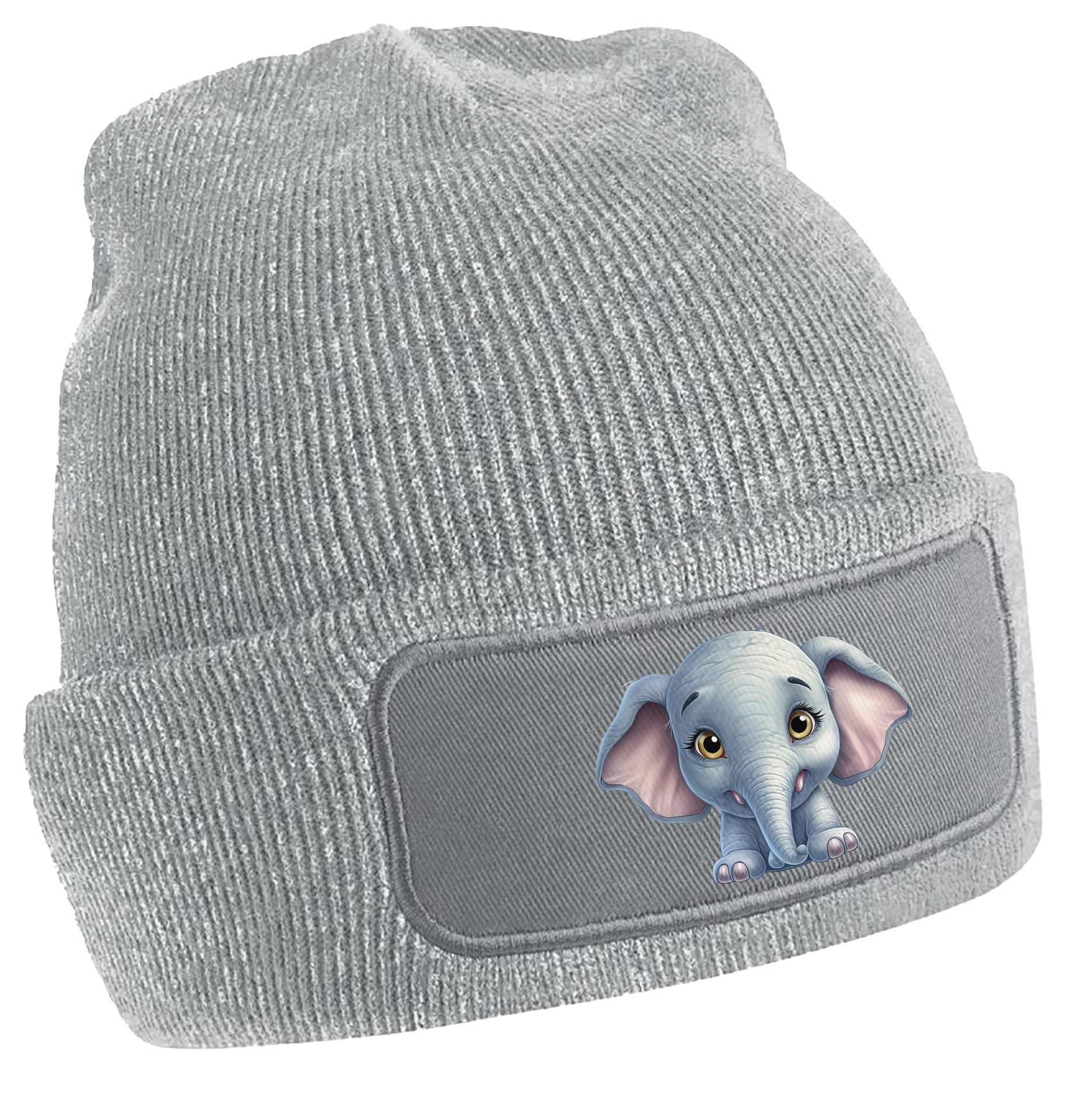 Niedliches Design trifft Funktion – Die grobe Strickoptik liegt im Trend, der Patch aus Baumwolltwill sorgt für ein edles Detail, und der Elefant macht die Mütze zum Hingucker.
