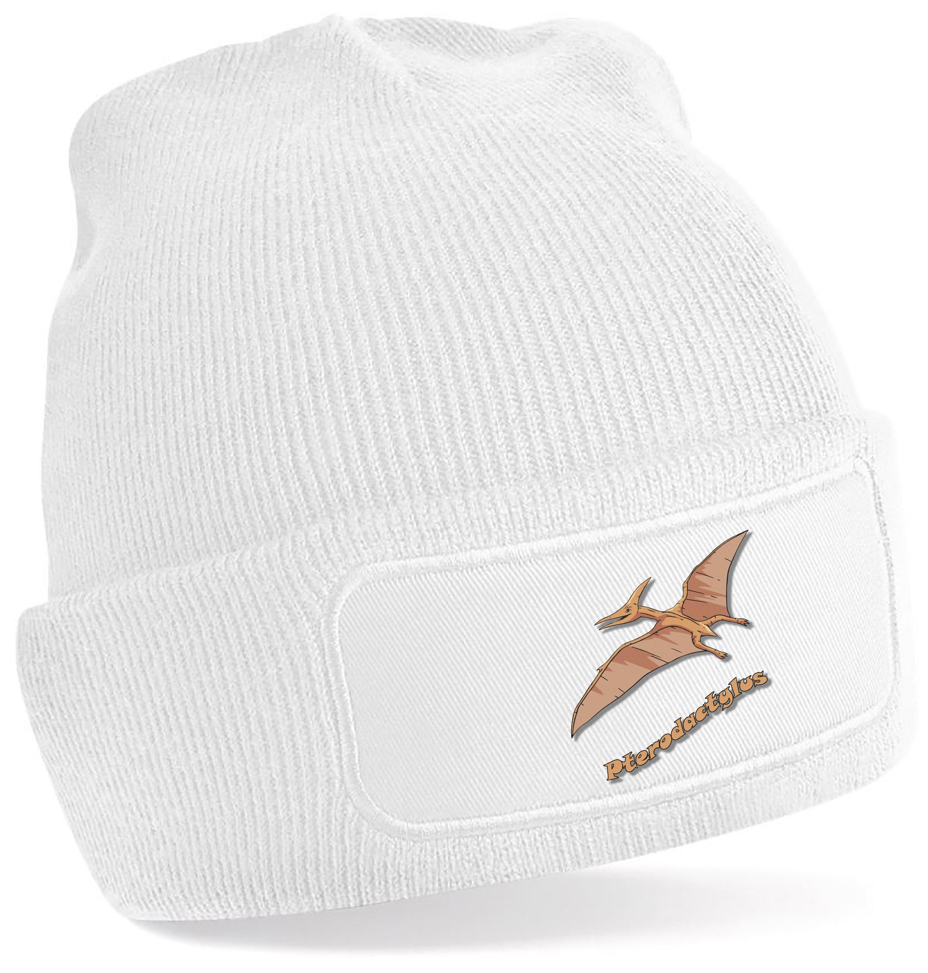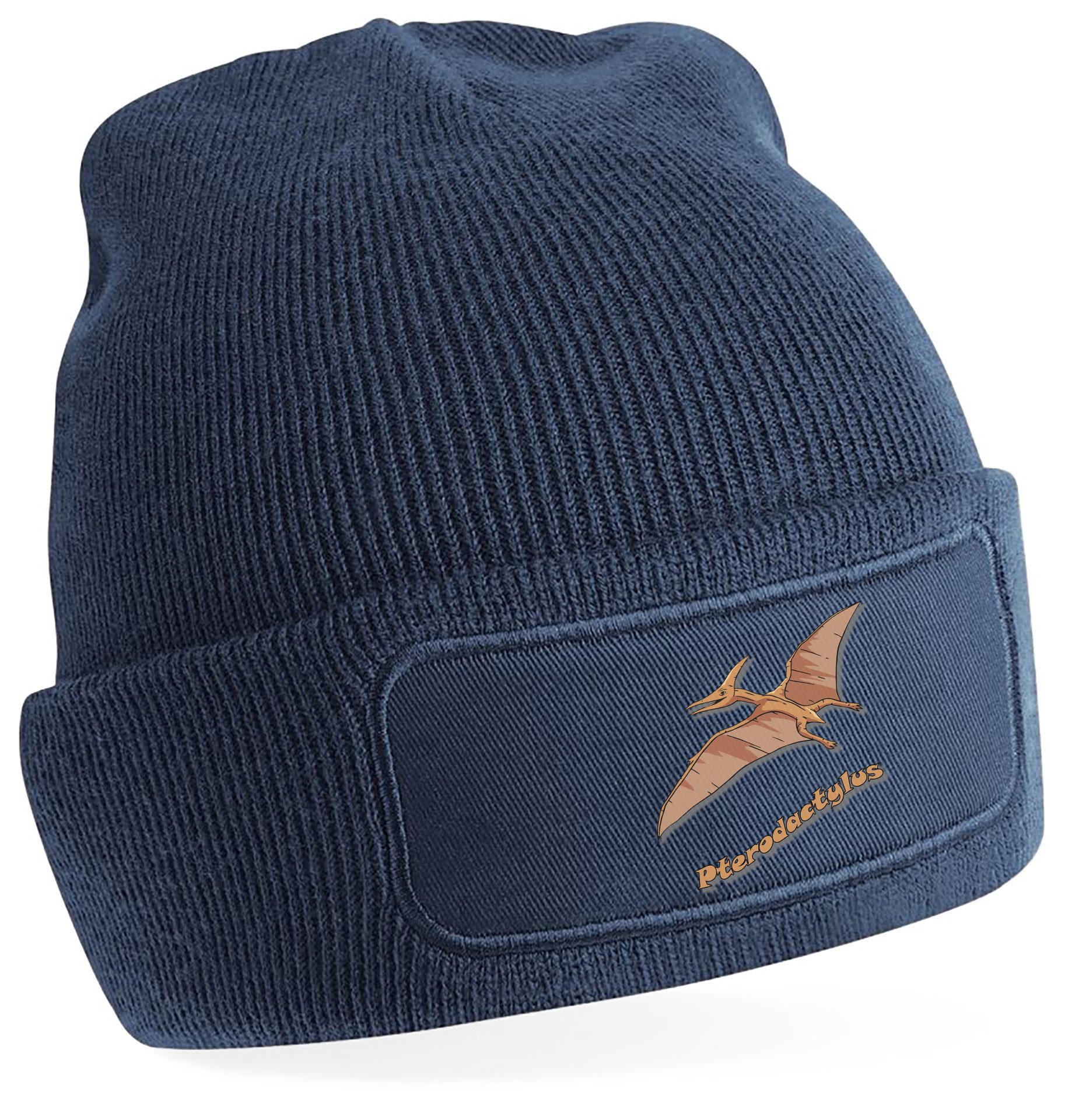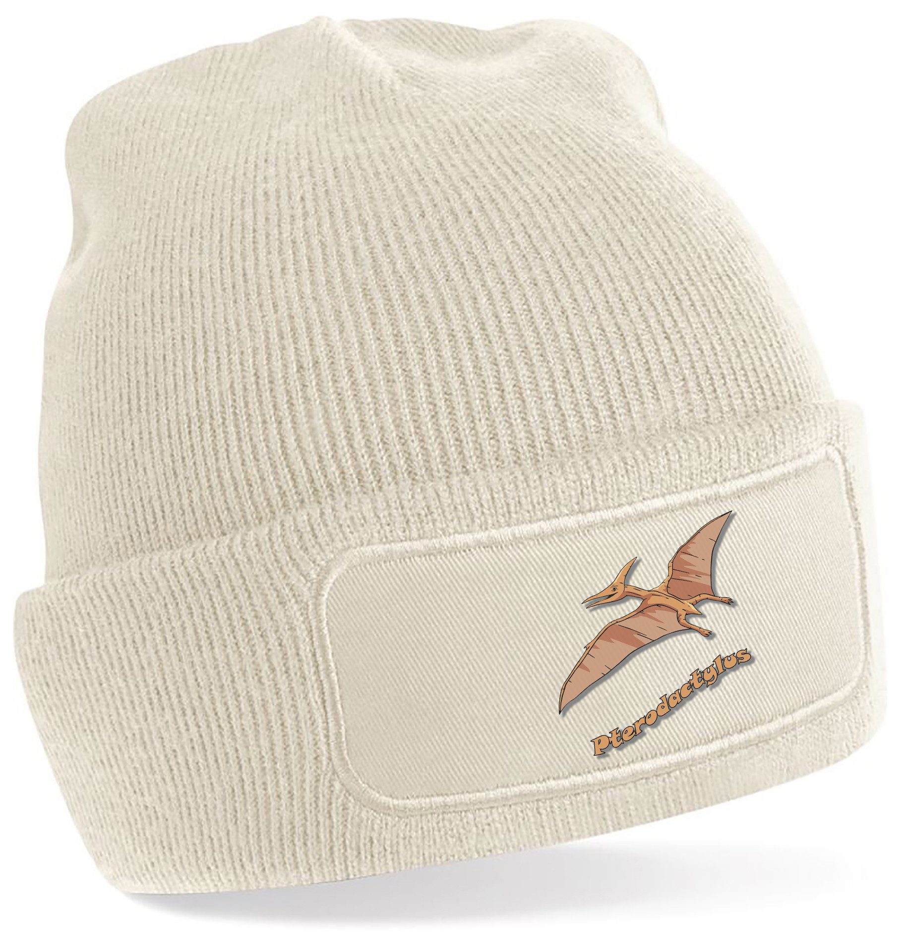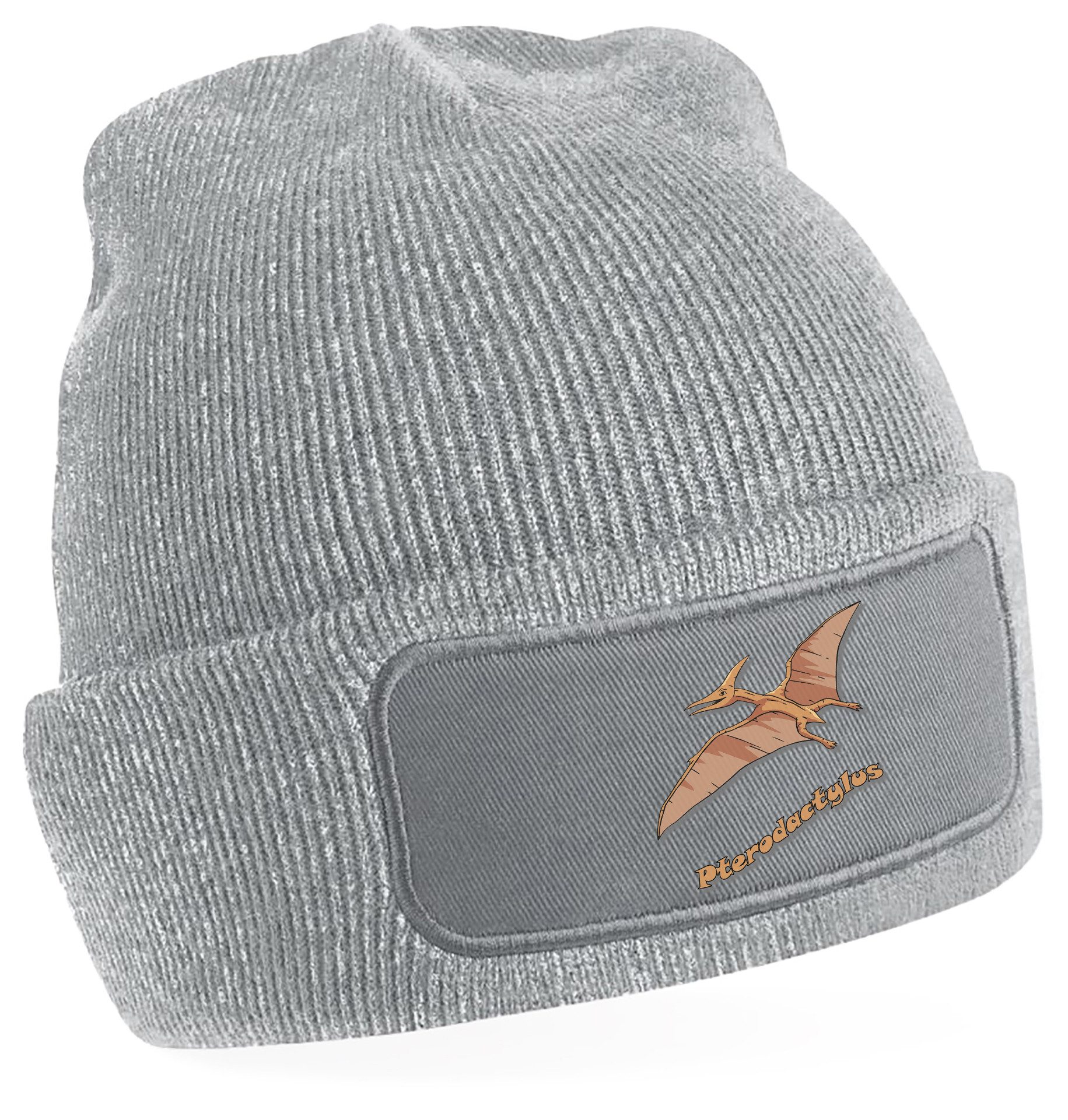 Perfekt für kalte Tage: Wärmende Strickmütze mit robustem Design, weicher Haptik und detailreichem Pterodaktylus-Patch – ideal als Geschenk oder Modeaccessoire.