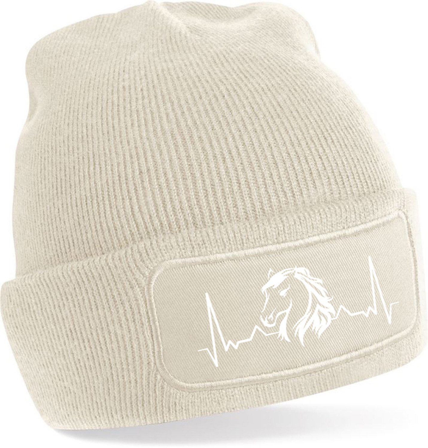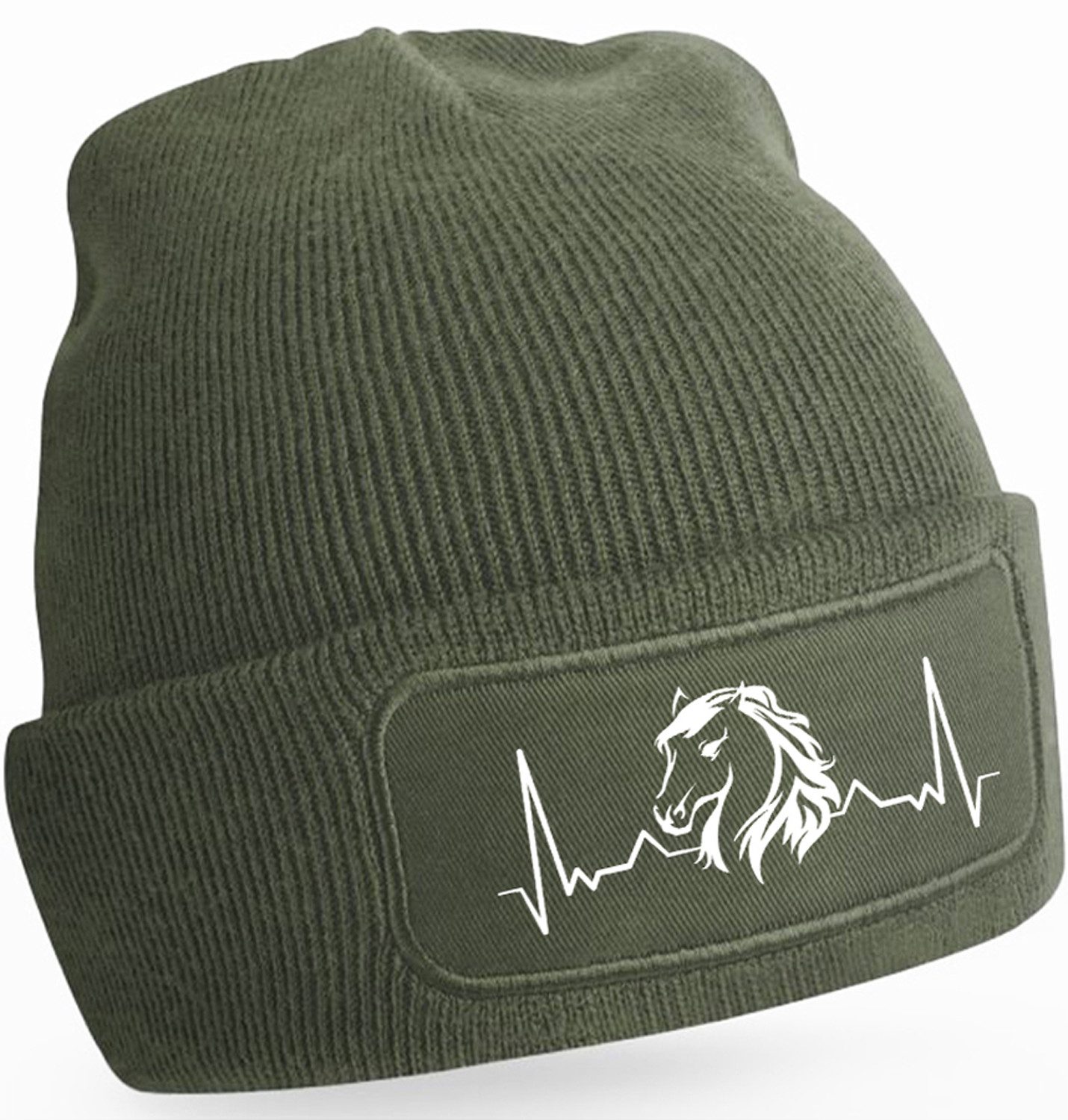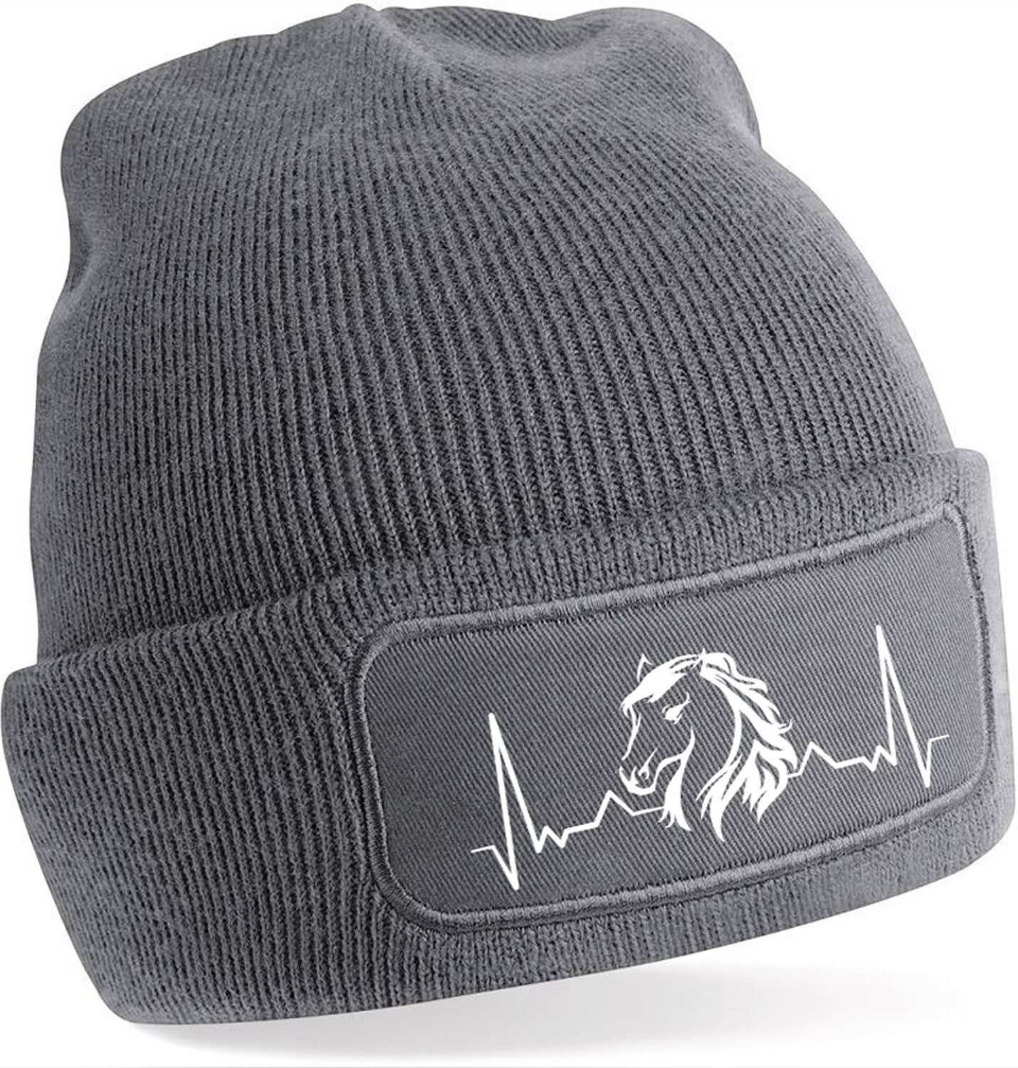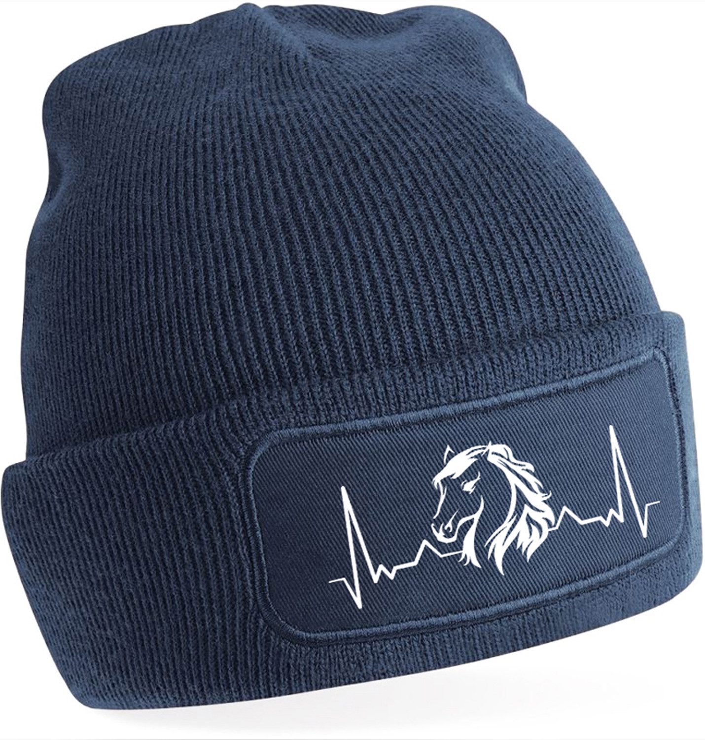 Ausdrucksstarke Winter-Strickmütze mit Herzschlag-Pferdemotiv, grober Strickoptik und breitem Umschlag – ein wärmendes Accessoire für die ganze Familie.