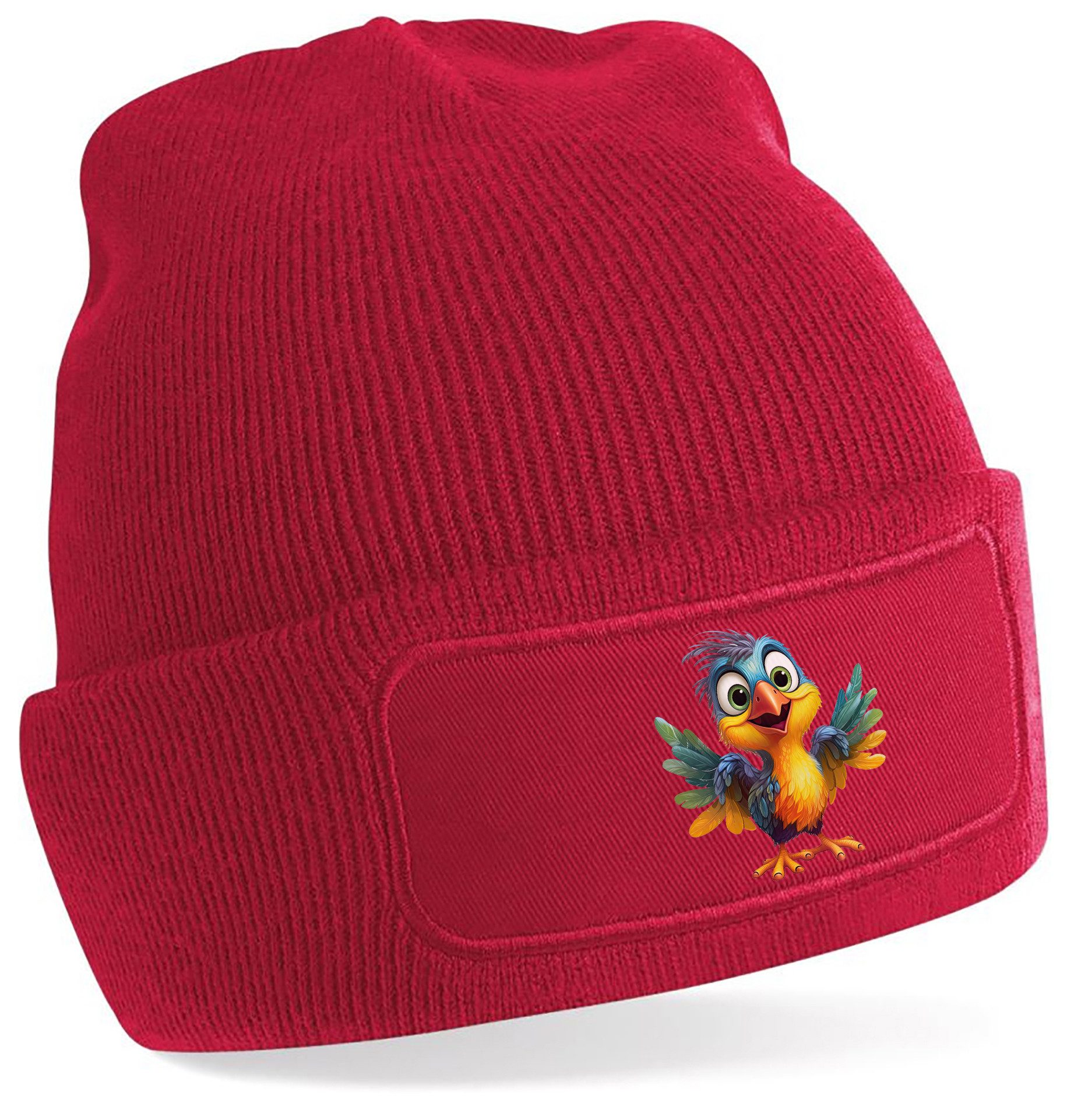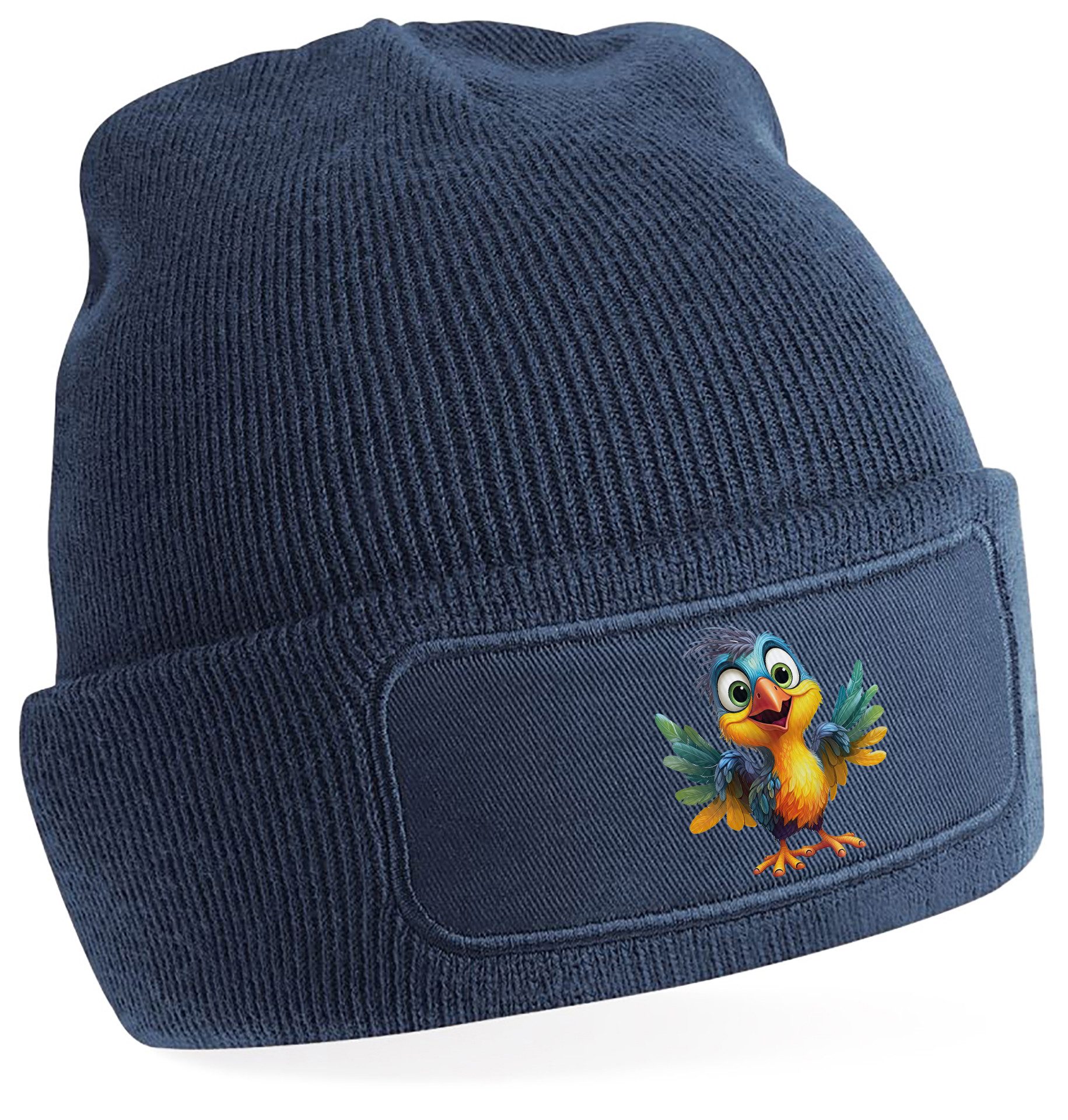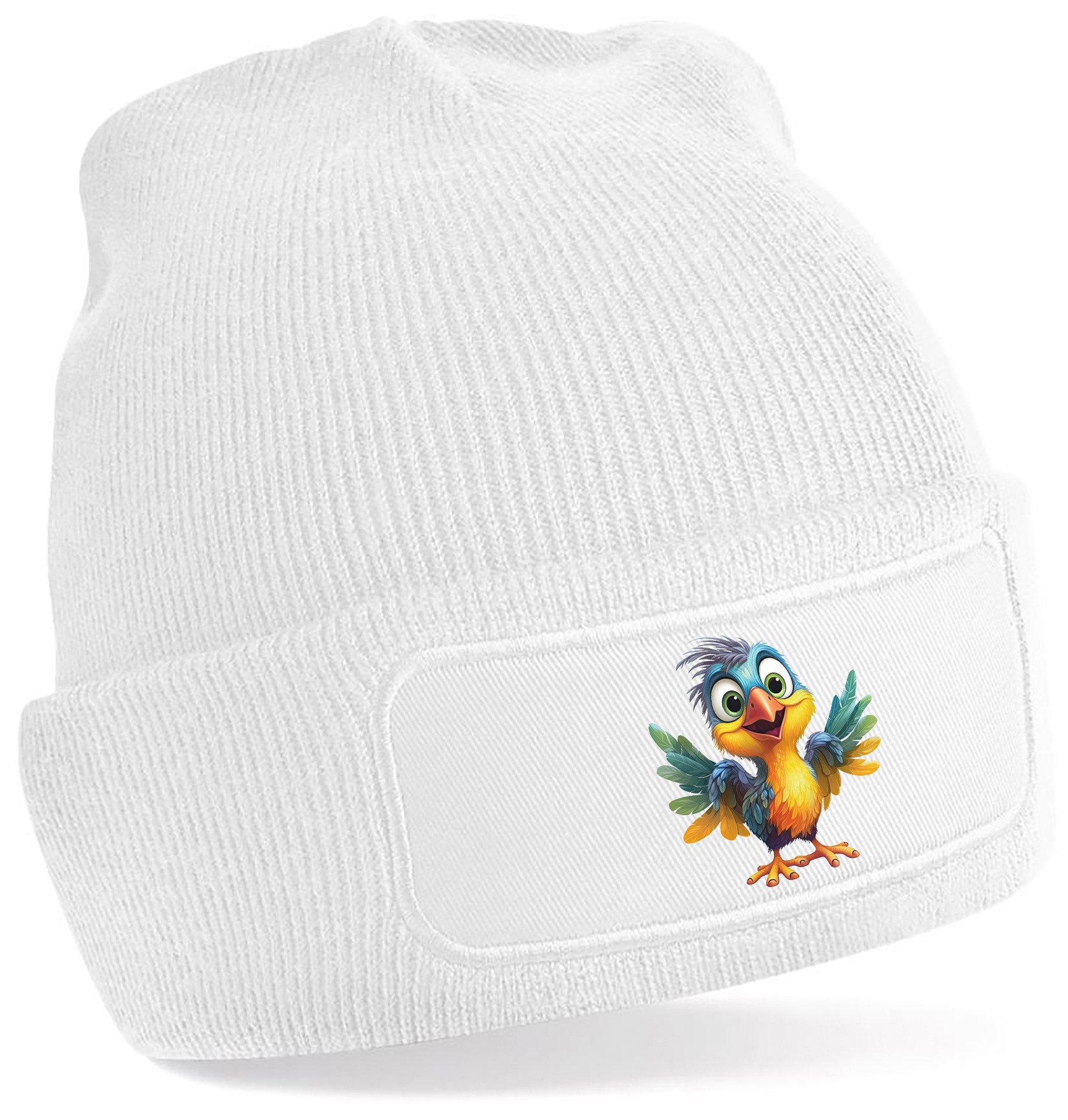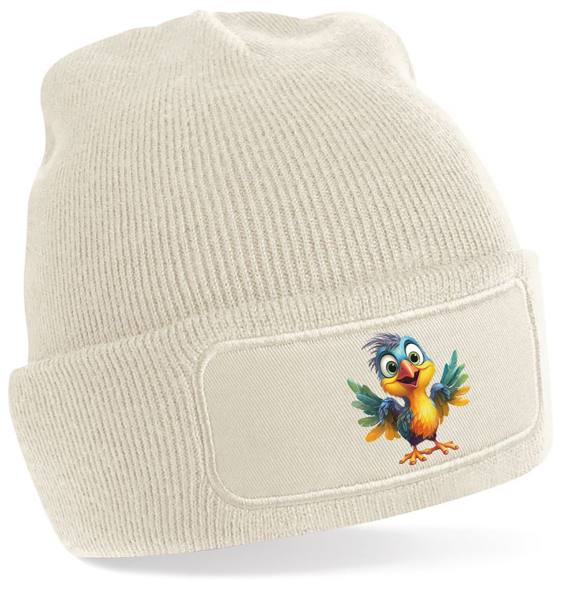 Fröhlicher Vogelprint mit lebendigen Details – ein einzigartiges Design, das die Mütze zu einem echten Blickfang macht und an kalten Tagen für gute Laune sorgt.