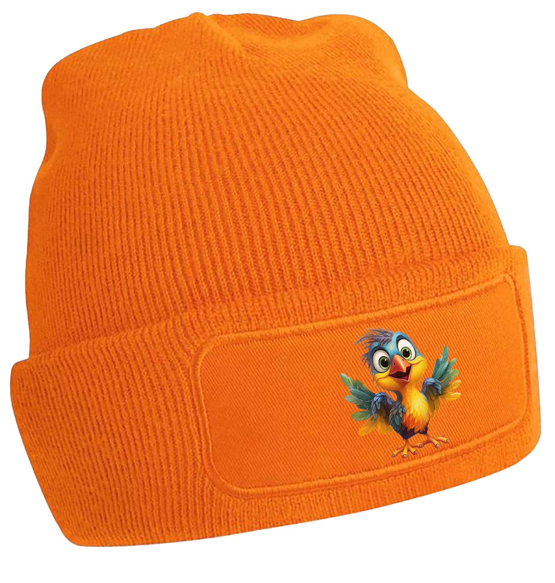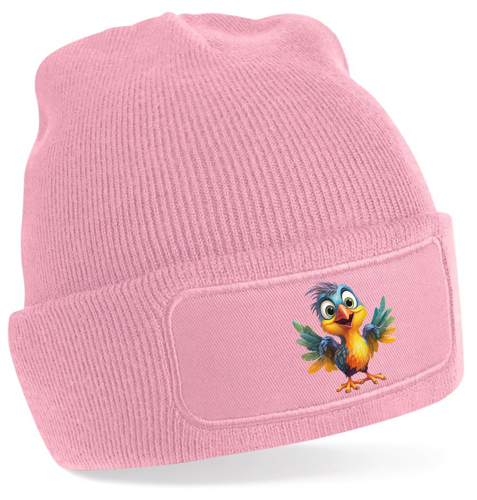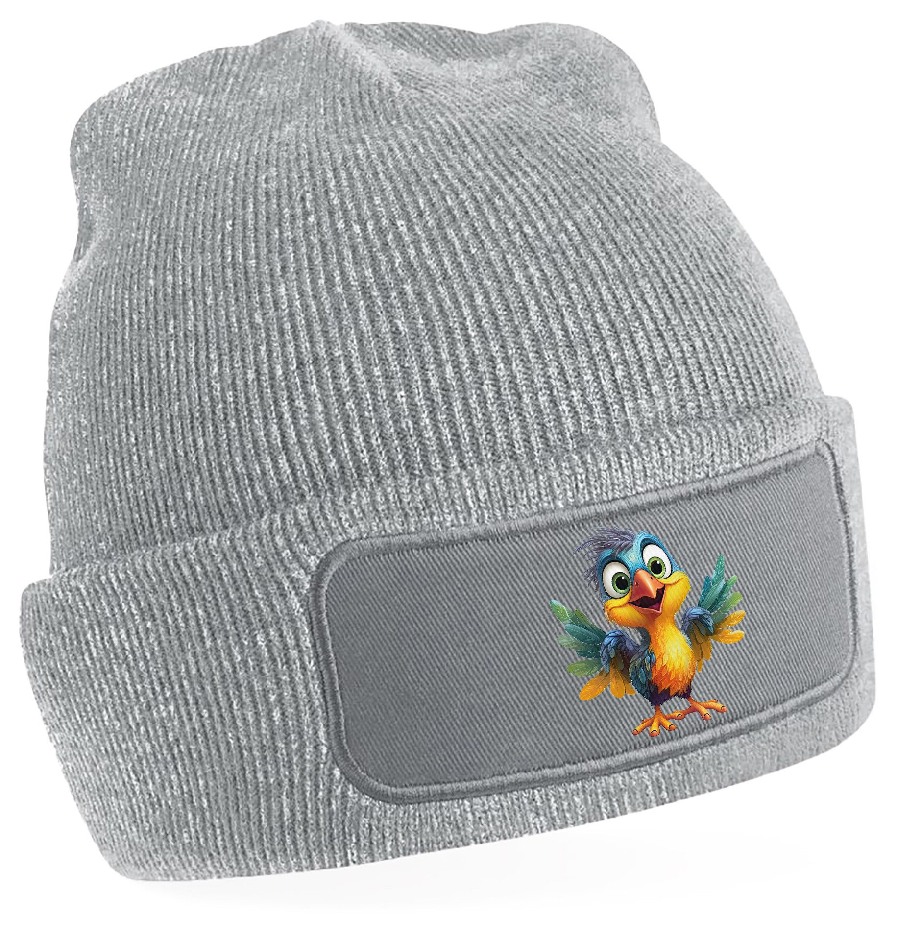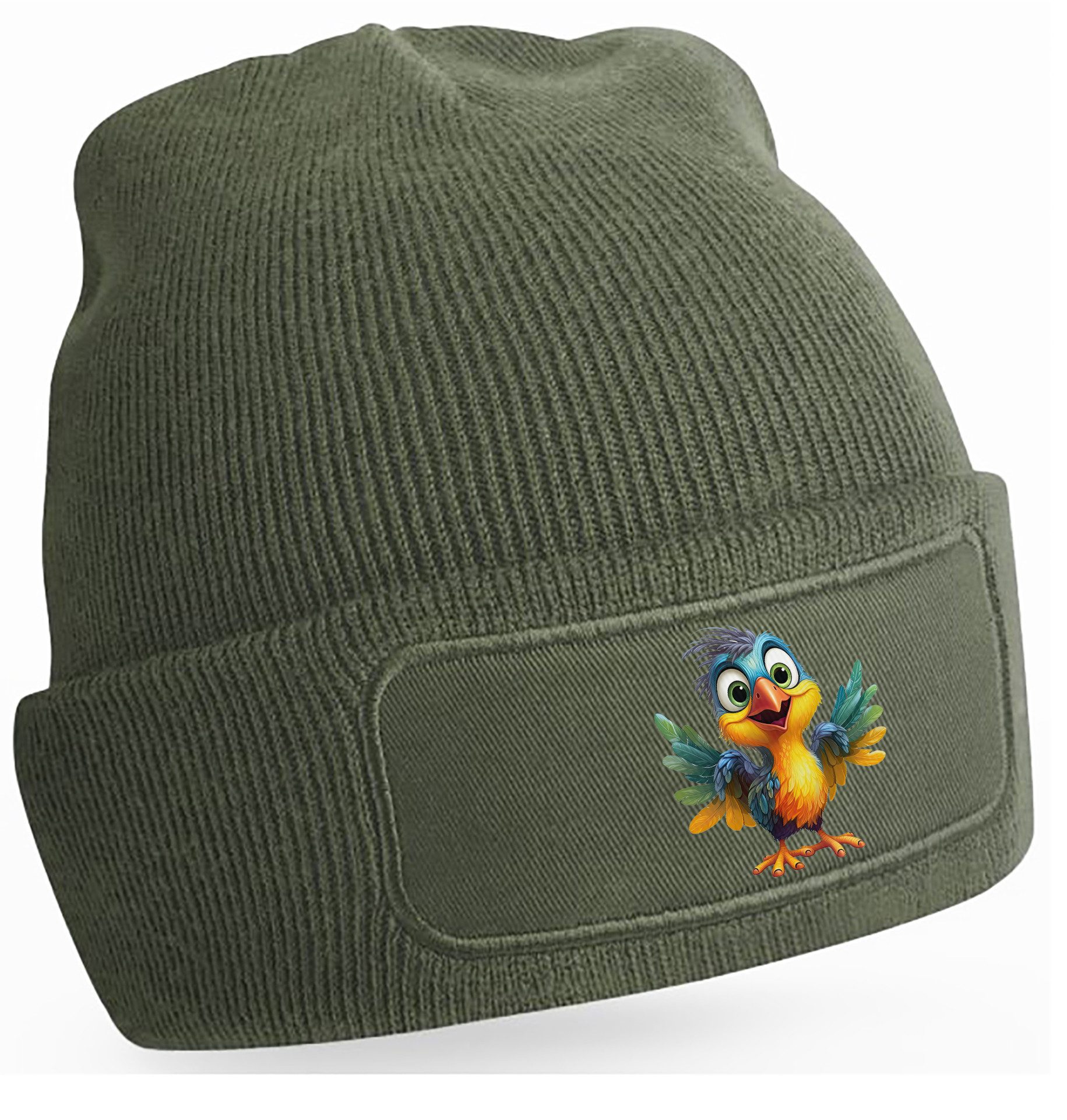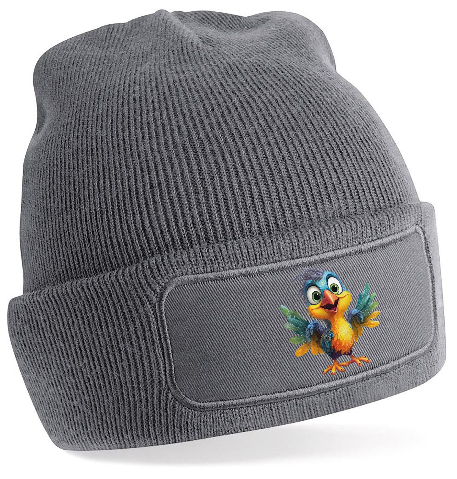 Fröhlicher Vogelprint mit lebendigen Details – ein einzigartiges Design, das die Mütze zu einem echten Blickfang macht und an kalten Tagen für gute Laune sorgt.