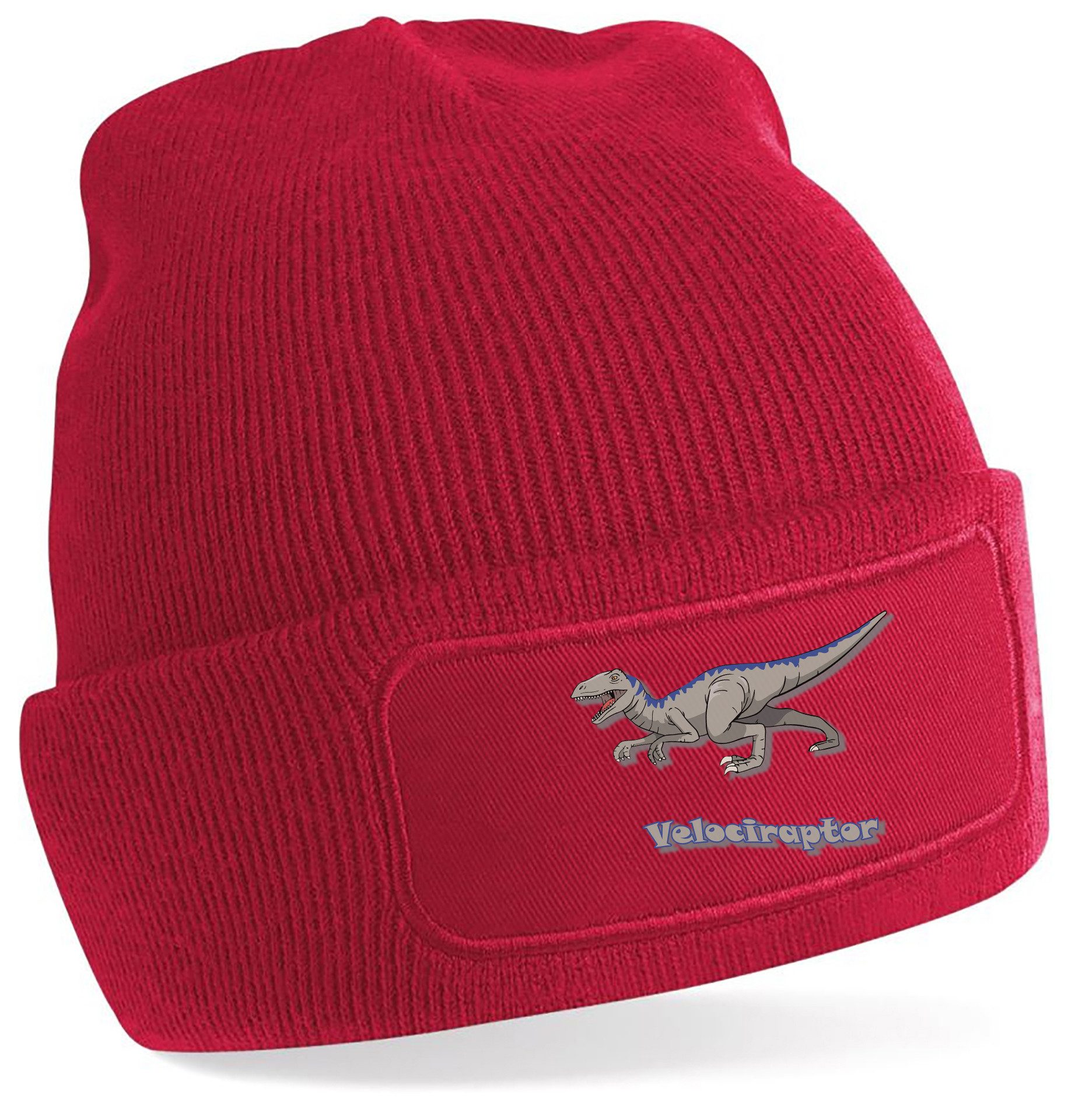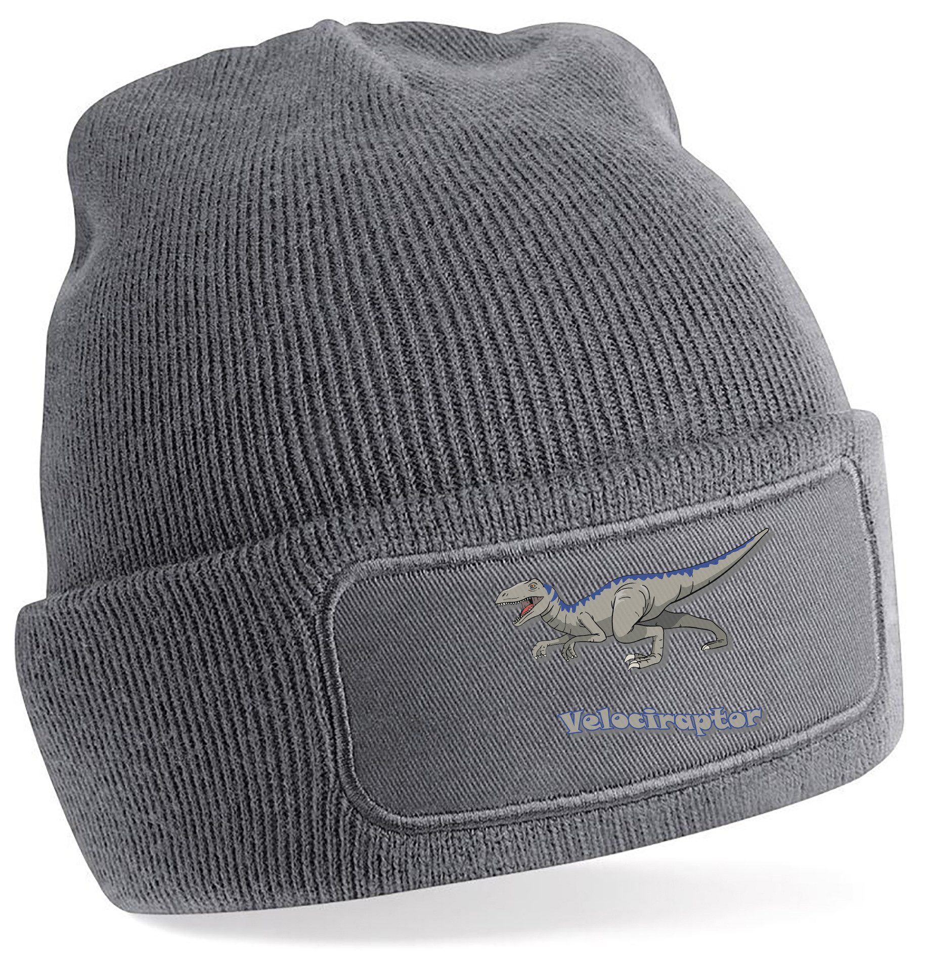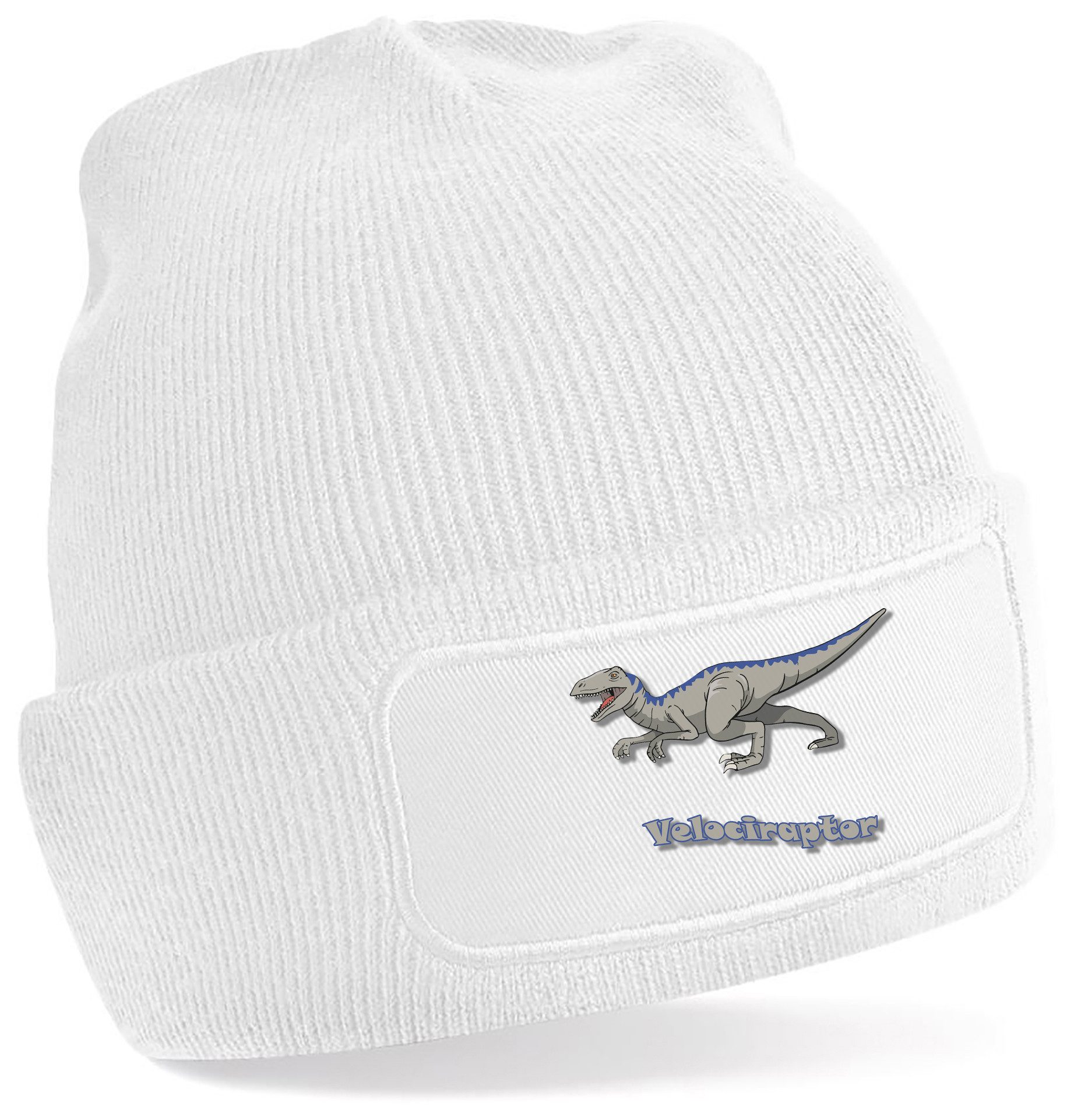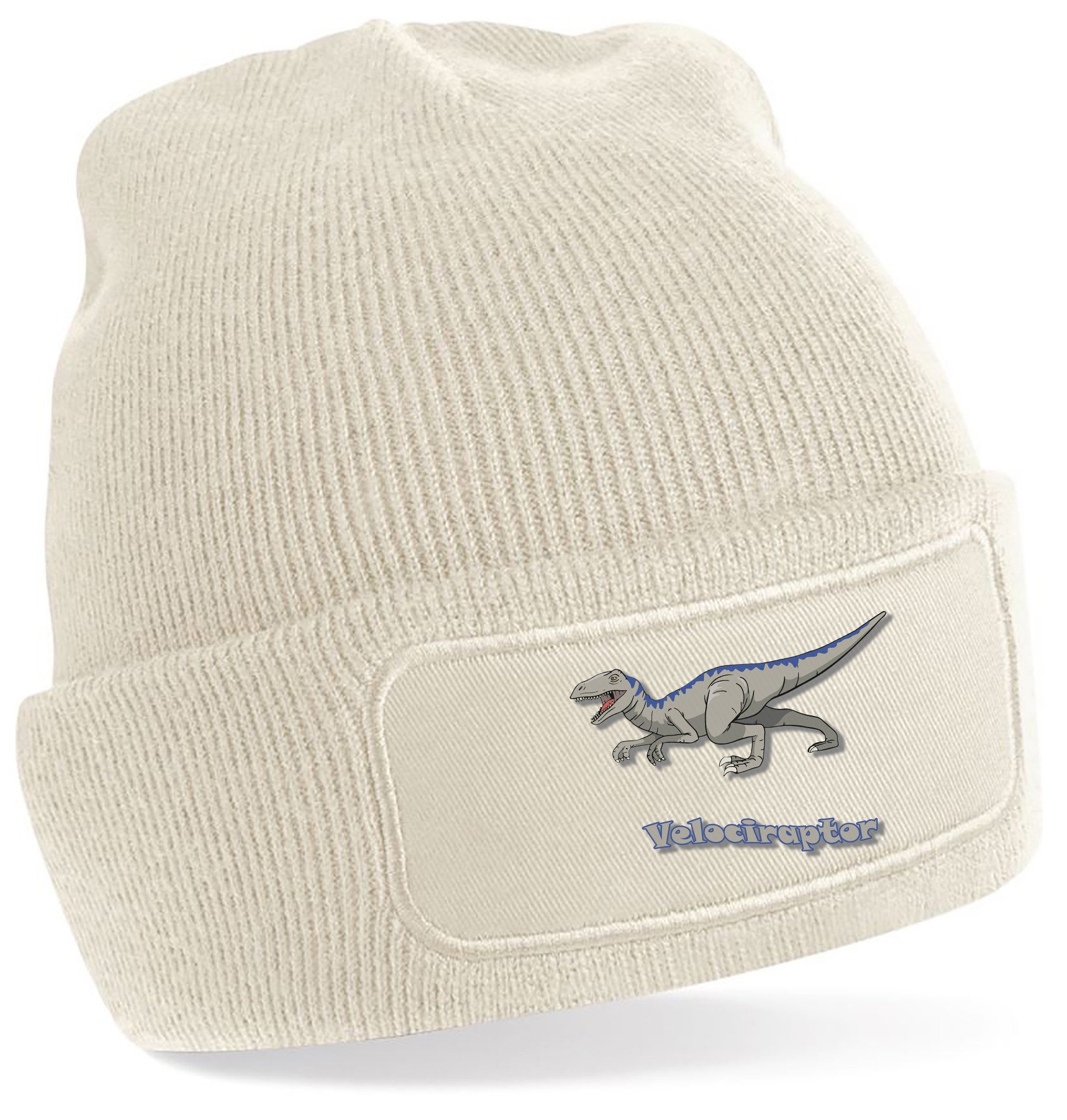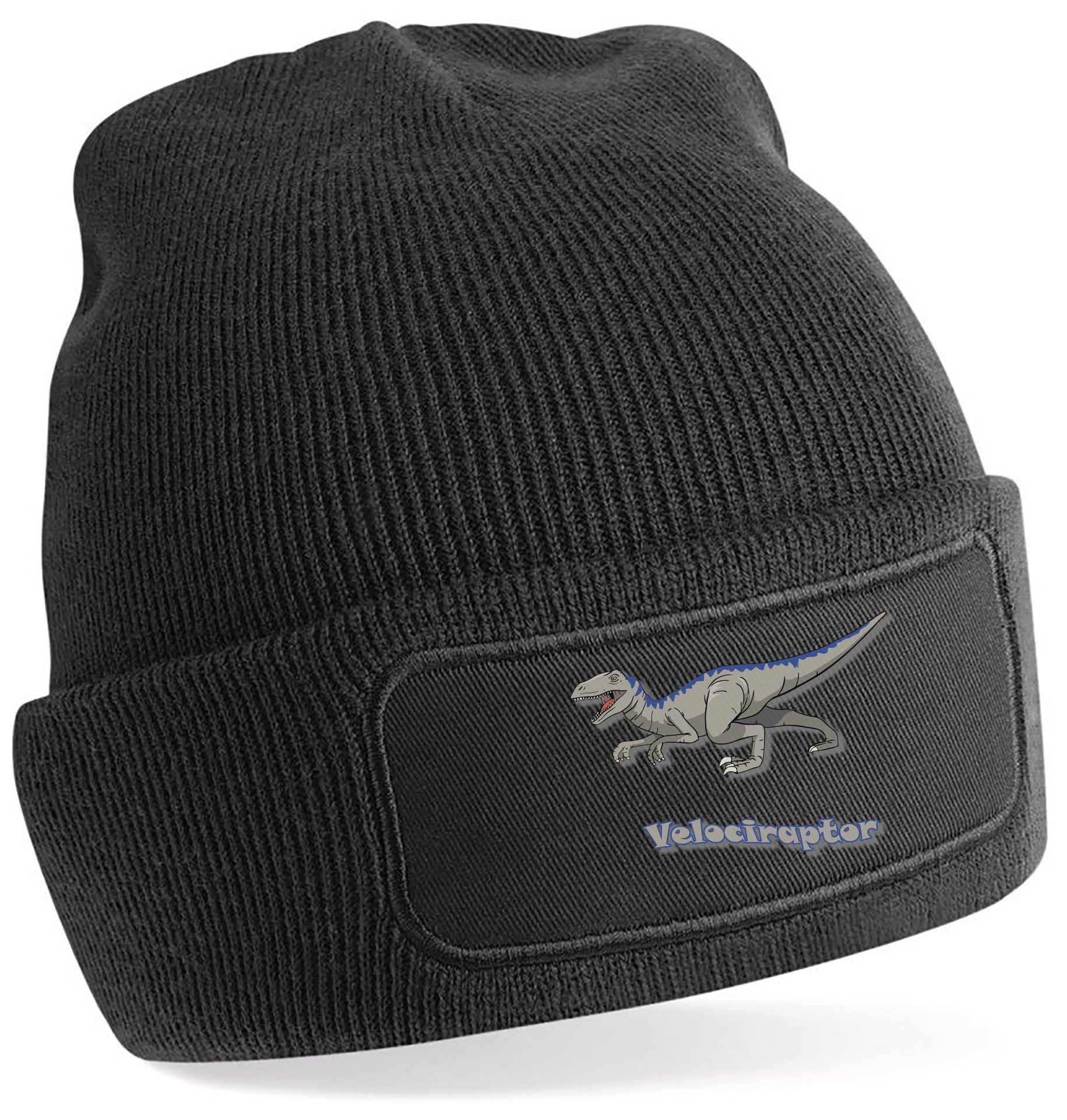 Winter-Strickmütze mit beeindruckendem Velociraptor-Aufdruck: Dynamisches Design mit kraftvollen Details und Schriftzug, perfekt für Dinosaurierfans aller Altersklassen.