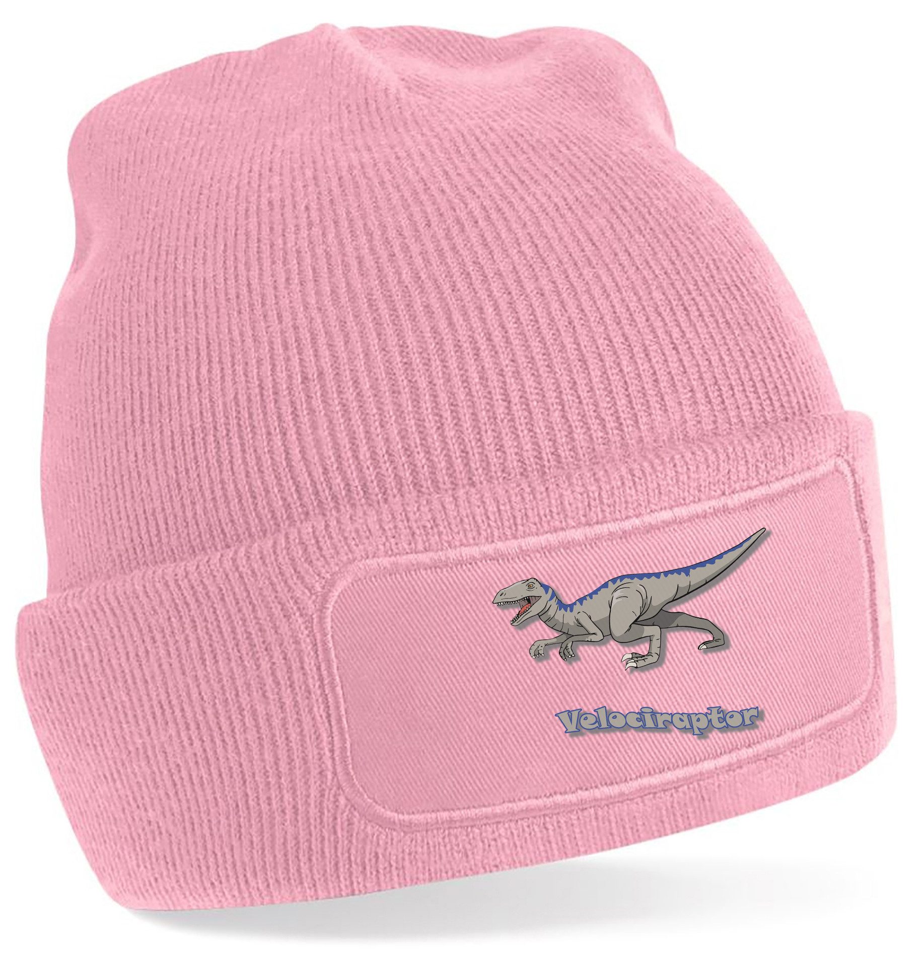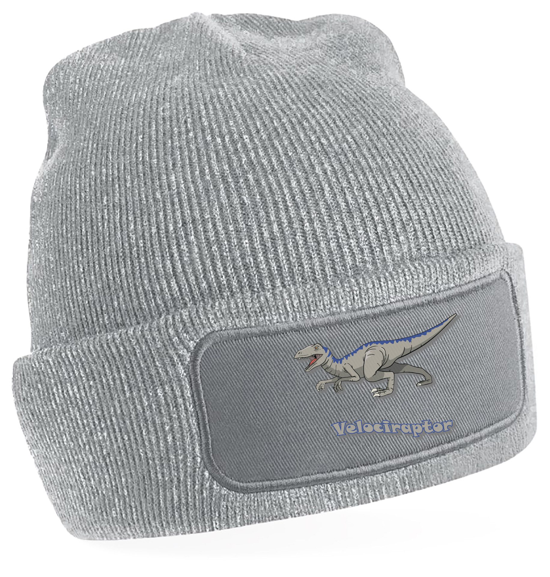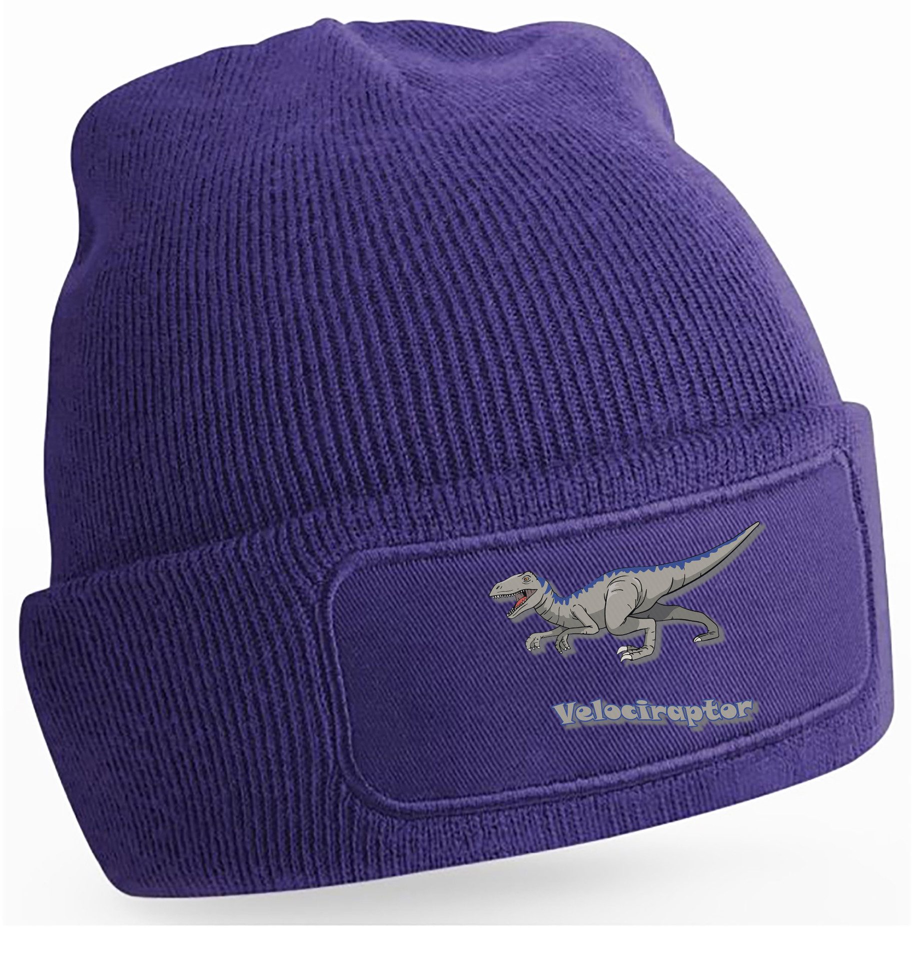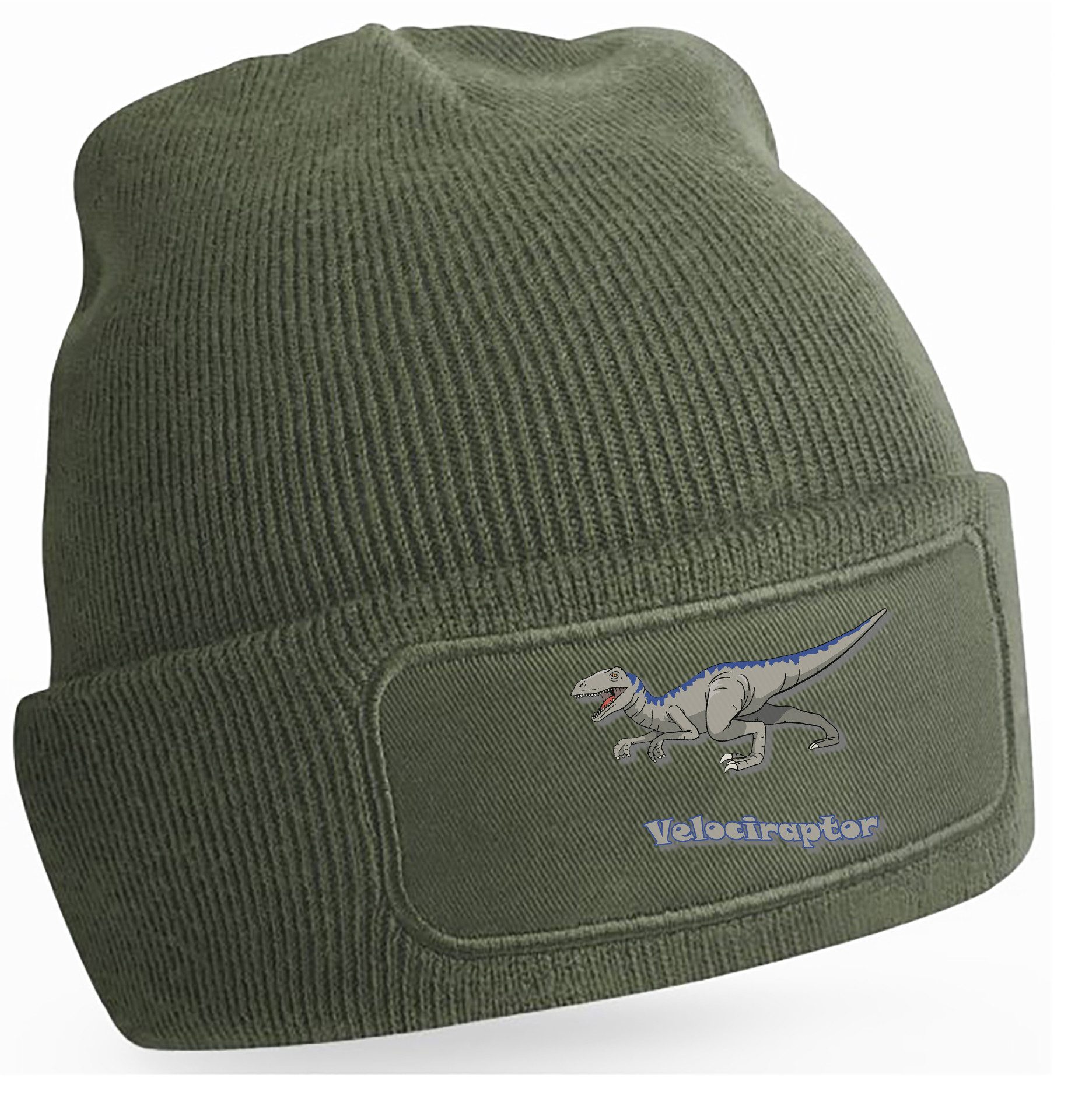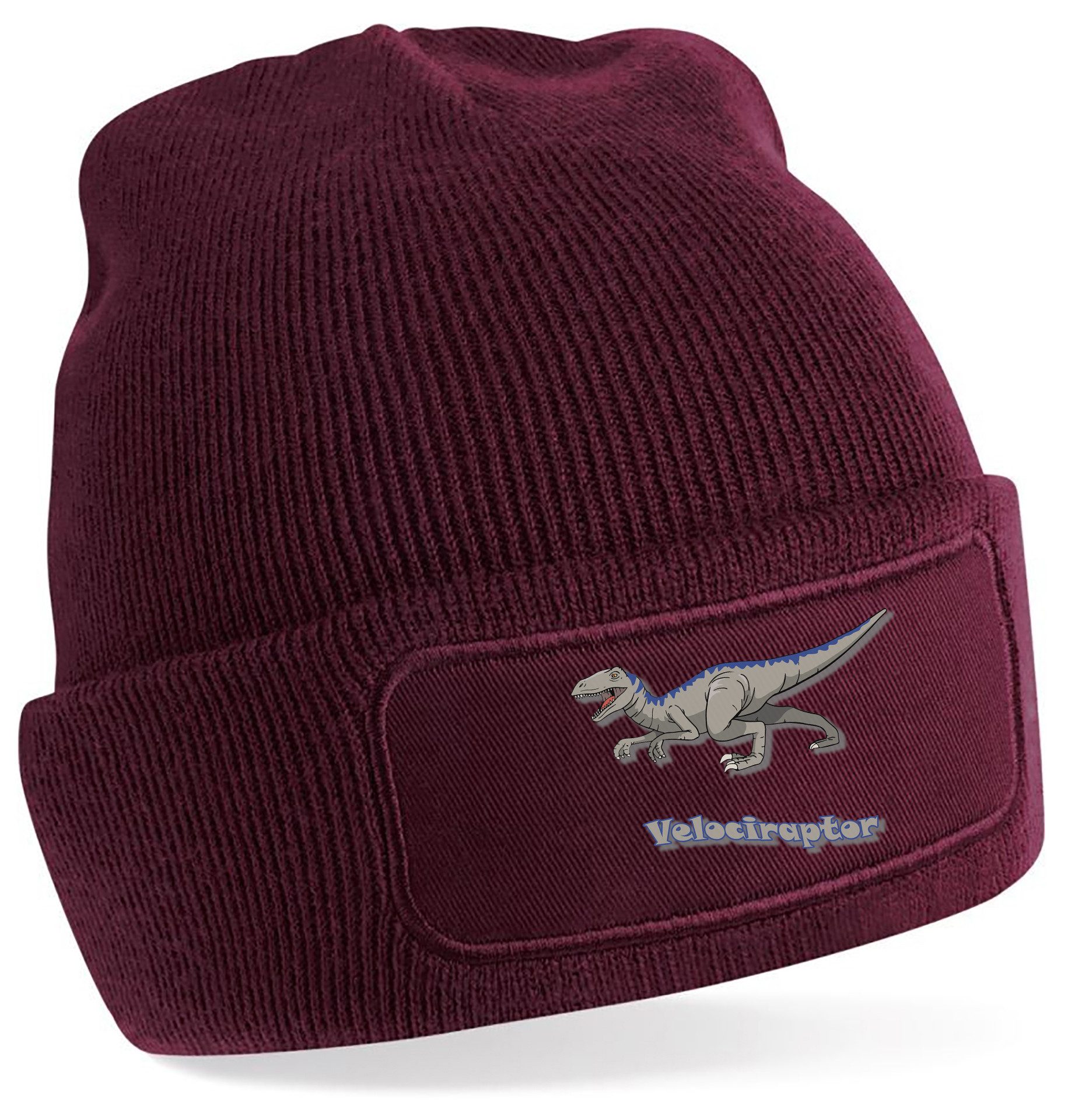 Winter-Strickmütze mit beeindruckendem Velociraptor-Aufdruck: Dynamisches Design mit kraftvollen Details und Schriftzug, perfekt für Dinosaurierfans aller Altersklassen.