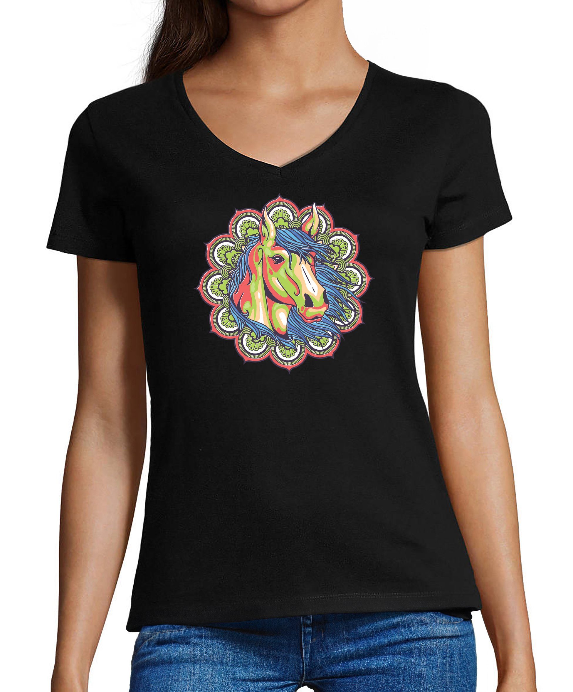 Stilvoll und selbstbewusst: Bedrucktes Damen T-Shirt mit einzigartigem Aufdruck - Pferdekopf im Mandala Stil Dieses wunderschöne bedruckte Damen T-Shirt ist ein absolutes Must-Have für Frauen, die ihren persönlichen Stil zum Ausdruck bringen möchten. Mit seinem einzigartigen Aufdruck ist es ein Blickfang, der sofort Aufmerksamkeit erregt und Ihr Outfit aufwertet. Das T-Shirt besteht aus hochwertiger Baumwolle, die nicht nur angenehm auf der Haut liegt, sondern auch für hervorragenden Tragekomfort sorgt. Es wurde sorgfältig verarbeitet und bietet eine optimale Passform, die Ihre weiblichen Kurven schmeichelt. Der Aufdruck auf dem T-Shirt ist das Highlight des Designs und macht dieses T-Shirt zu einem einzigartigen Kleidungsstück, das Sie von der Masse abhebt. Das herausragende Merkmal dieses T-Shirts ist zweifellos der einzigartige Aufdruck. Das Design wurde mit viel Liebe zum Detail entworfen und fängt die neuesten Modetrends ein. Es verleiht Ihrem Outfit eine gewisse Eleganz und Originalität, die Sie zum Blickfang in jeder Situation macht. Egal, ob Sie es zu einer Jeans, einer Shorts oder einem Rock kombinieren, dieses T-Shirt wird Ihren persönlichen Stil perfekt unterstreichen. Die hohe Qualität des Aufdrucks gewährleistet, dass er auch nach vielen Wäschen seine Farbintensität und Schärfe behält. So können Sie Ihr neues Lieblings-T-Shirt lange Zeit genießen und immer wieder tragen. Entdecken Sie Ihre Individualität und zeigen Sie Ihre Persönlichkeit mit diesem bedruckten Damen T-Shirt. Bereichern Sie Ihre Garderobe um ein einzigartiges Kleidungsstück, das Ihnen Selbstbewusstsein verleiht!