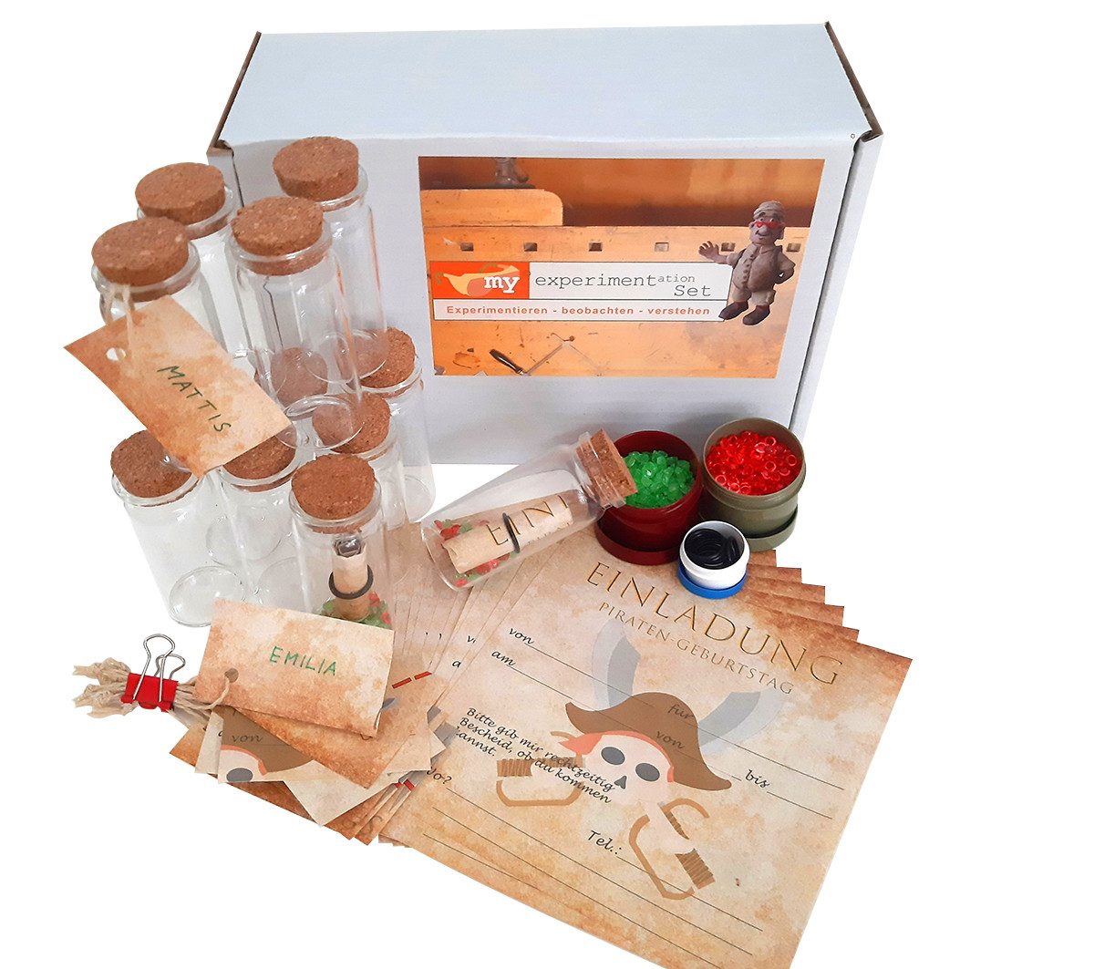 Lieferumfang | 10 kleine Glasfläschchen mit Korken (Volumen: 60 ml, Höhe: 82 mm, Durchmesser: 35 mm) 10 Einladungen (15x15 cm) + 10 Hängeetiketten und Schnüre für Namensschilder + 10 Gummiringe 2 Zusatzeinladungen und 2 Zusatzetiketten für eventuelle Schreibfehler Dekonuggets als kleiner "Schatz" zum Befüllen der Fläschchen |