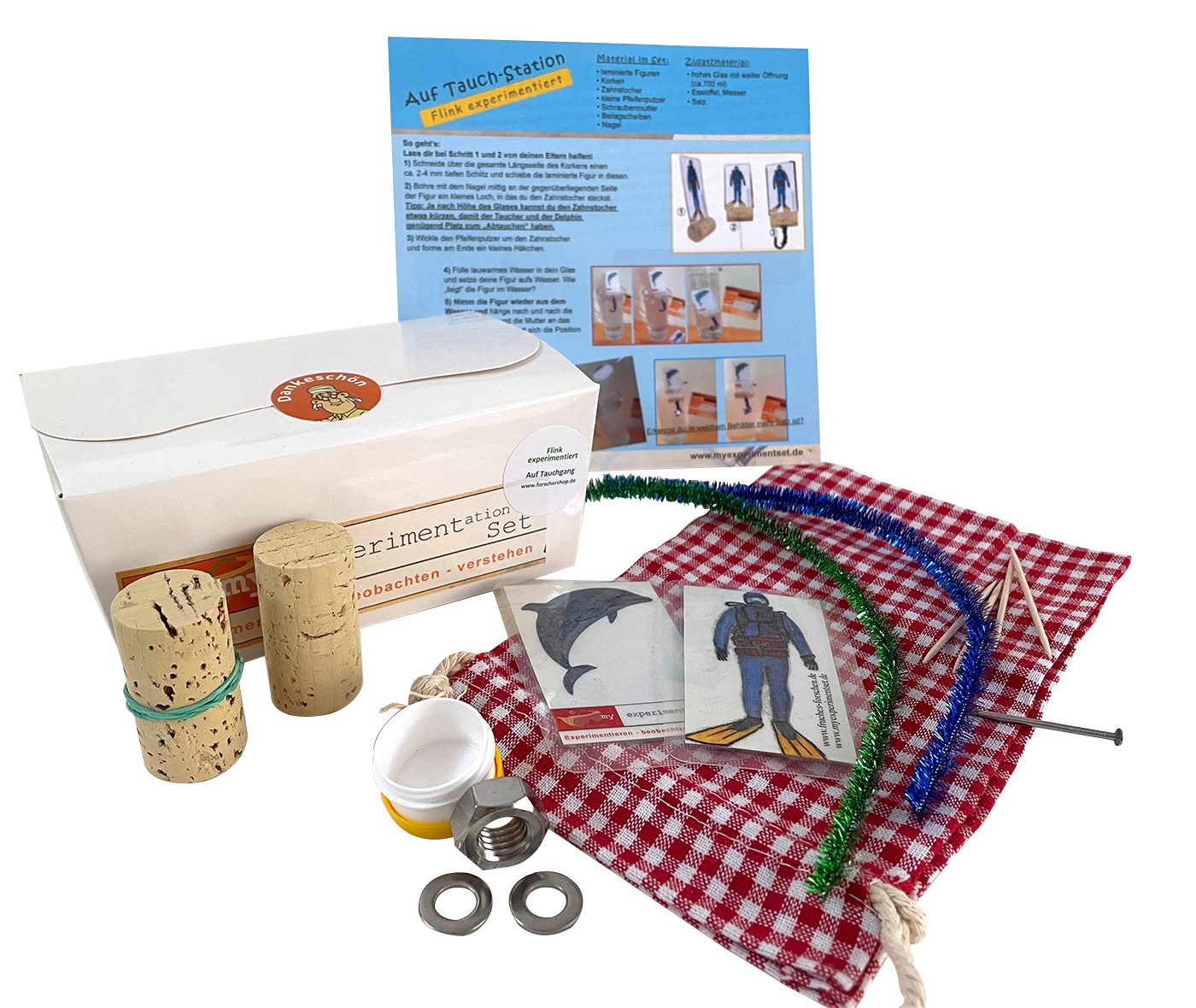 Ausstattung | Laminierter Taucher und Delfin, Korken, Pfeifenputzer, Zahnstocher, Schraubenmutter, Beilagscheiben, Nagel, Bebilderte Anleitung mit einer kindgerechten aber wissenschaftlichen Erklärung |