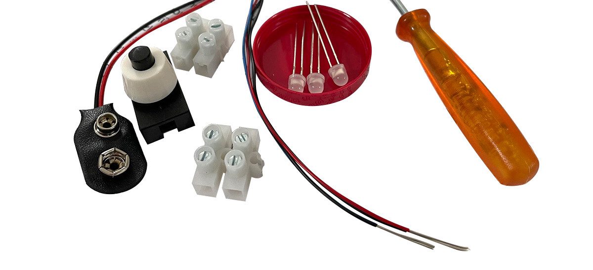 Ausstattung | LEDs mit integriertem Widerstand (Max. Strom: 20mA, Min Strom: 1,5mA, Vorwiderstand 1kOhm), Schalter, abisolierte Drähte, 4-polige Lüsterklemmen, Batterie-Clips für 9V Block-Batterie inklusive Aderendhülsen, Schraubendreher, Anleitung, ohne Batterien |