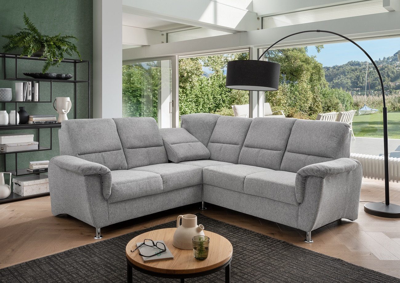 Die schlichten, chromfarbenen Metallfüße setzen stilvolle Akzente, während die durchgängig bezogene Rückenlehne maximale Gestaltungsfreiheit im Raum bietet. Dank der cleveren Ecklösung mit Funktion erleben Sie Flexibilität auf höchstem Niveau.