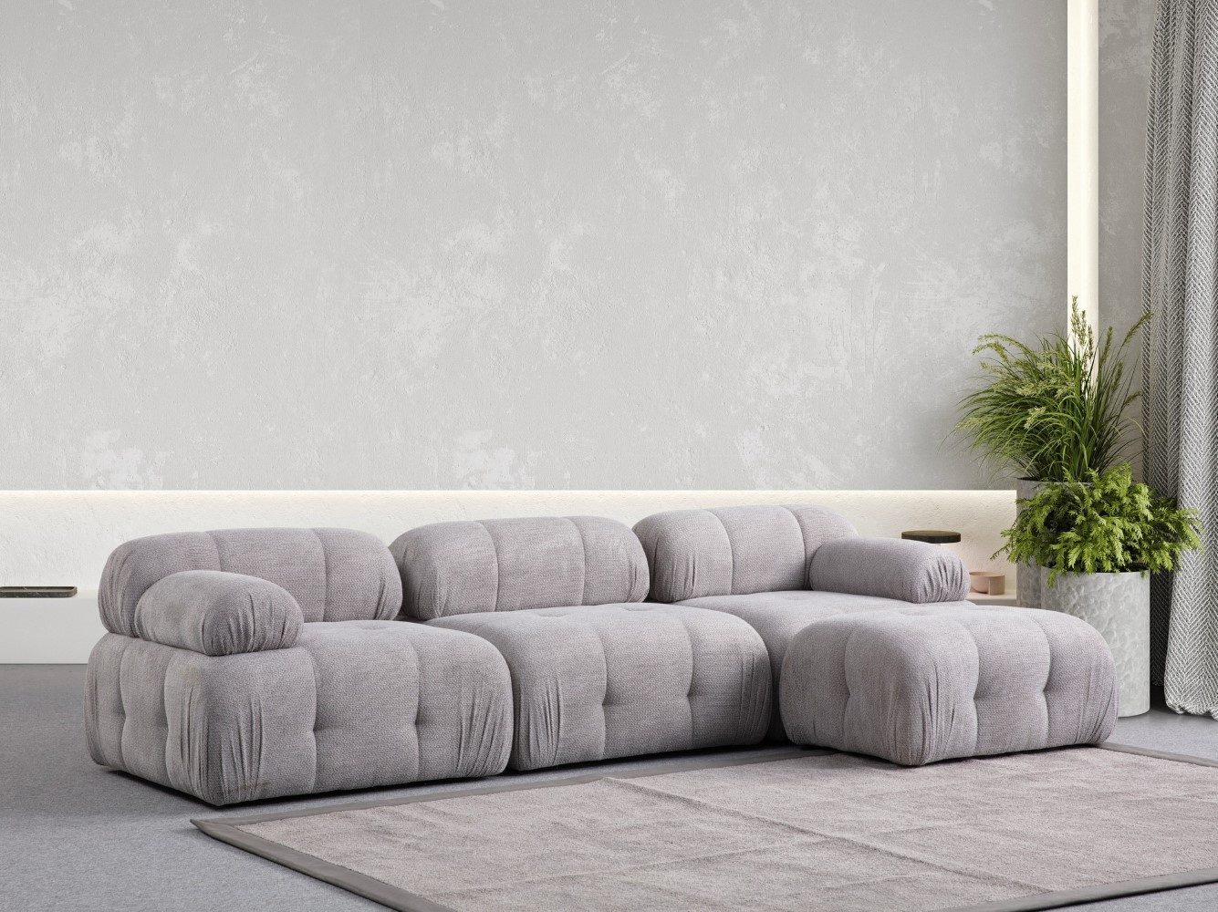 Ob als Mittelpunkt im Wohnzimmer oder als clevere Lösung in kompakten Räumen – Petite passt sich an. Bezüge regelmäßig sanft absaugen; leichte Verschmutzungen mit einem feuchten, farbneutralen Tuch abtupfen. Direkte, dauerhafte Sonneneinstrahlung vermeiden.