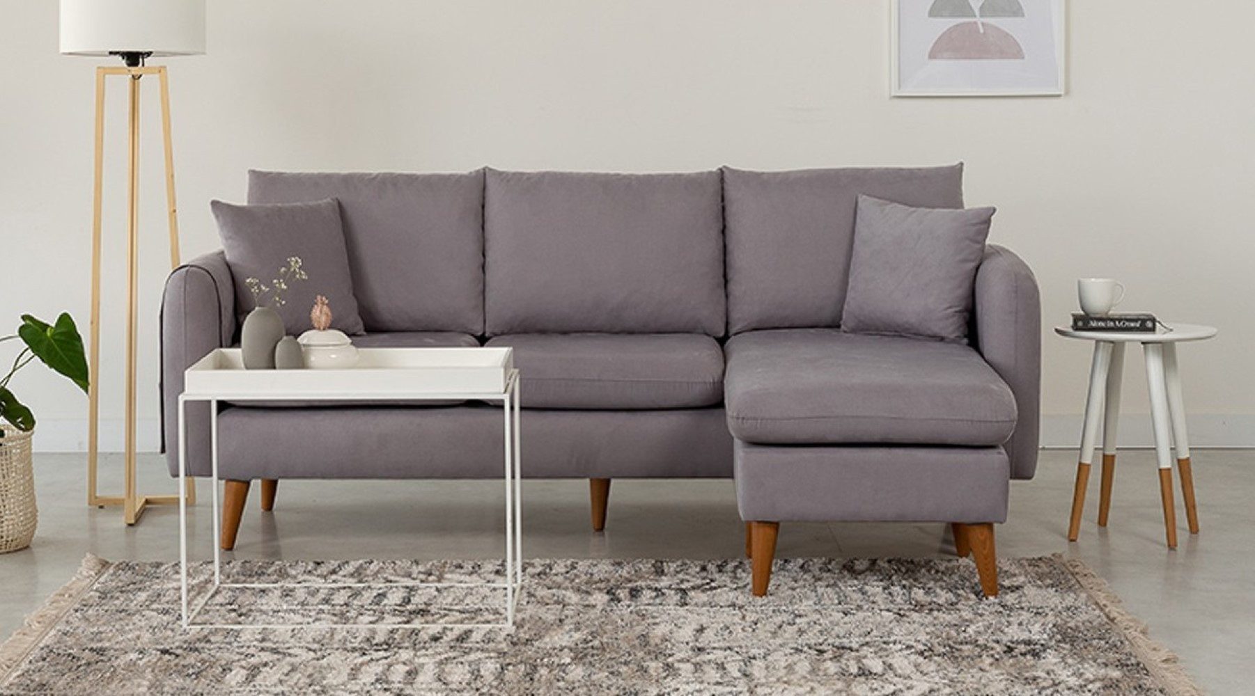 Sofia nutzt wenig Fläche clever aus: schlanke Außenmaße, klare Linien und ein angenehmer Sitz machen das Ecksofa zur idealen Lösung für kleine Wohnzimmer. Der massive Kiefernholzrahmen bildet die stabile Basis, während der pflegeleichte Strickstoff im Alltag überzeugt.