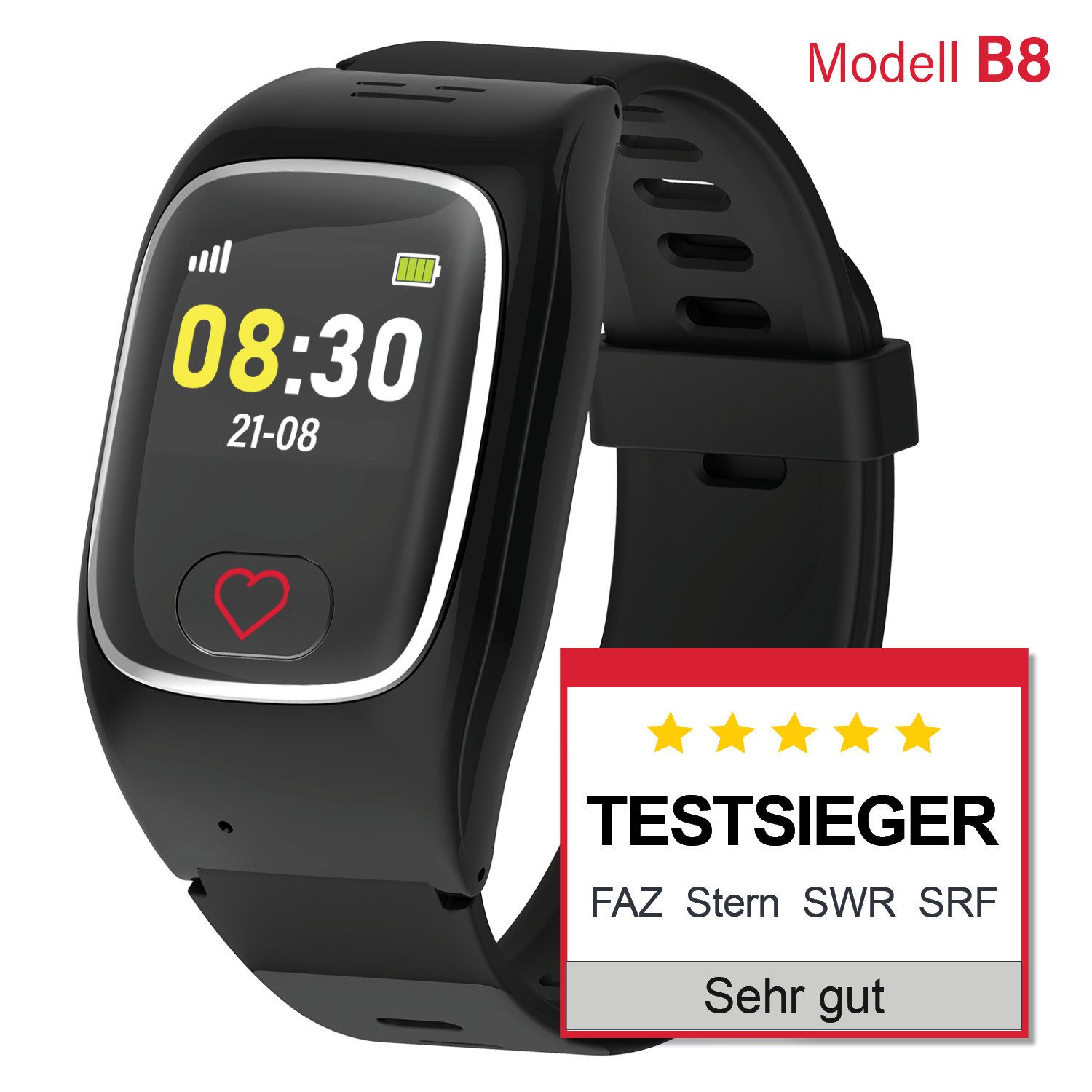 Zusatzfunktionen | Sturzerkennung, Vitaldaten-Messung, GPS-Live-Ortung, Schrittzähler Akkuwarnung Nutzung ohne Smartphone möglich |