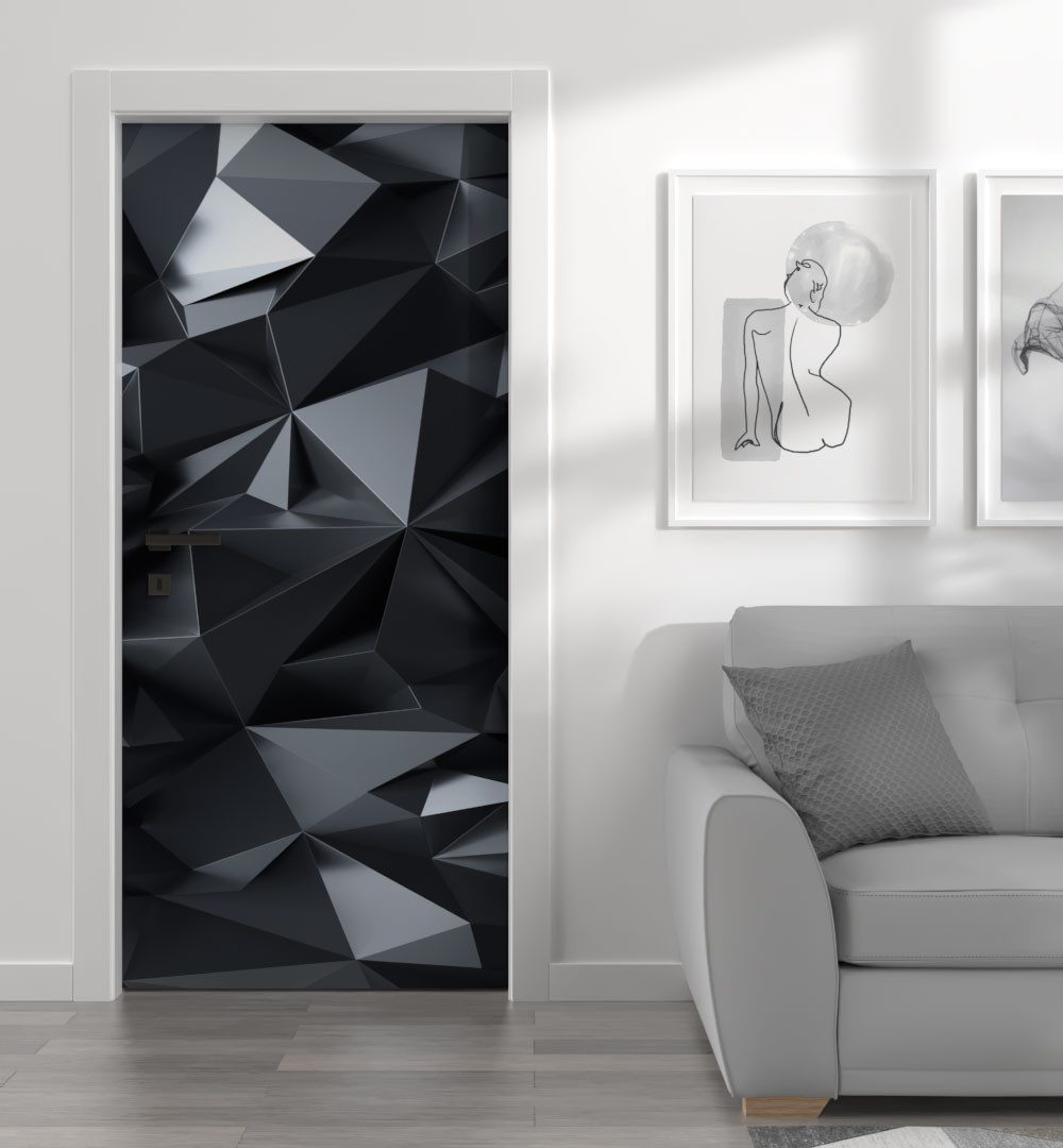 Die Türtapete Polygone Nr. 2 besteht aus einem qualitativ hochwertigen Vinyl Material und wird mittels moderner Digitaldrucktechnologie mit deinem Wunschmotiv bedruckt.