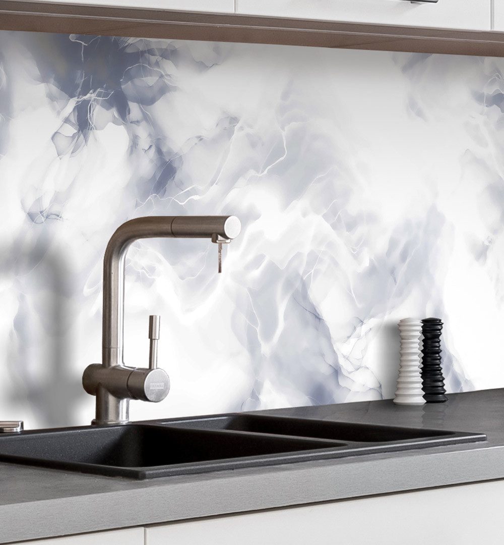 Verleihe deiner Küche charaktervolle Akzente – mit der Küchenrückwand Marmor blau selbstklebend im Mauer-Design.
