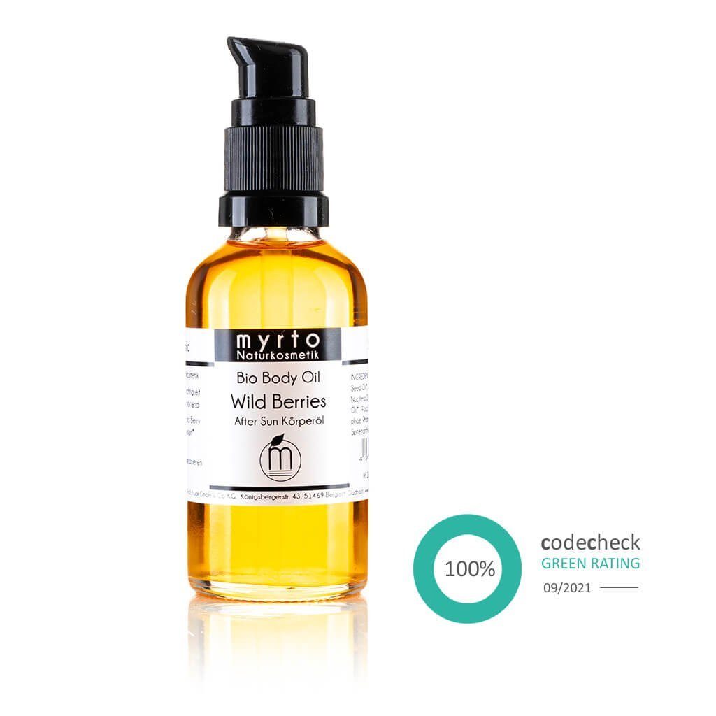 Wild Berries ist ein After Sun Körperöl ohne Duftstoffe für sensible Haut. Die naturreine Pflege regeneriert sonnengestresste, trockene und strapazierte Haut mit natürlichen Vitaminen, Antioxidantien und essentiellen, ungesättigten Fettsäuren. Das After Sun Körperöl verleiht eine leicht getönte, frische Hautfarbe. Diese regenerierende Hautpflege stärkt die Hautbarriere und verbessert die Feuchtigkeitsbindung. Das After Sun Körperöl Wild Berries enthält biologische Pflanzenöle, die die Lipidspeicher und Feuchtigkeitsdepots bei sonnengestresster Haut wieder auffüllen. Zusätzliche kraftvolle Antioxidantien von Schizandra-, Hagebutten- und Sanddornbeeren wirken der Zellschädigung und vorzeitiger Hautalterung durch Freie Radikale entgegen. Die eingesetzten Pflanzenöle sind naturbelassen, nicht raffiniert oder desodoriert. Deshalb hat jedes Öl seinen typischen Geruch – im Gegensatz zu den neutral riechenden raffinierten Ölen. Nach dem Duschen verbindet sich das Wild Berries After Sun Körperöl auf leicht feuchter Haut zu einer reichhaltigen Emulsion, die sich leicht verteilen lässt und schnell einzieht. PREMIUM QUALITÄT HANDGEFERTIGT: Jedes Produkt wird nach eigener Rezeptur in unserer myrto Manufaktur in Bergisch Gladbach handgefertigt. Die eingesetzten Rohstoffe sind vegan und von höchster Qualität. Все Pflanzenextrakte sind aus biologischem Anbau oder Wildsammlung, vorzugsweise Fair Trade. Tierversuche lehnen wir selbstverständlich ab (PETA gelistet). Wir sind Partner von animalfair. myrto-naturalcosmetics unterstützt biologische Artenvielfalt und verzichtet konsequent auf Palmöl.