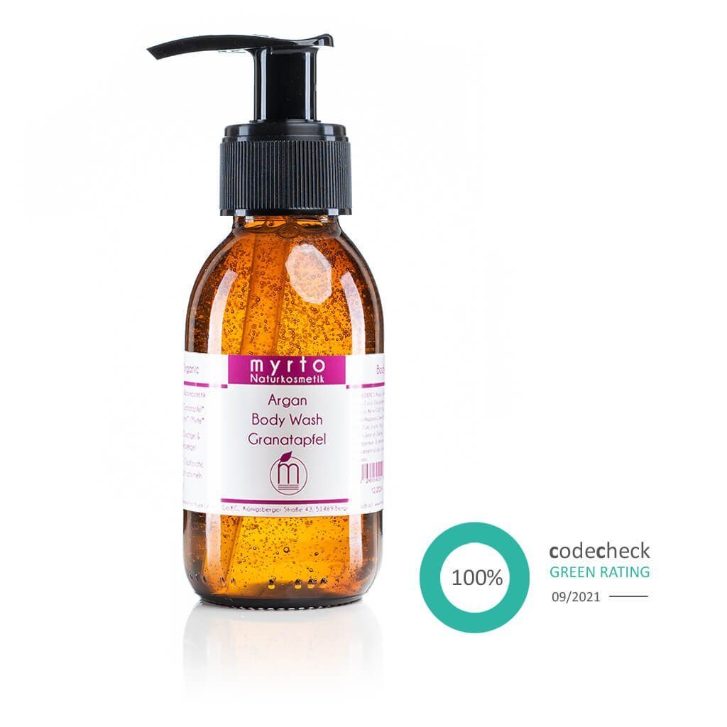 Argan Bio Body Wash Granatapfel ist ein luxuriöser, besonders mild rückfettender Duschbalsam für sensible, trockene und anspruchsvolle Haut. Arganöl, Granatapfel- und Chiasamen-Extrakt sorgen für ein verfeinertes, geklärtes Hautbild. Myrtenöl festigt und strafft das Gewebe vorbeugend gegen Cellulite. Der naturreine blumig-rosige Duft mit balsamischer Note erfrischt und vitalisiert bei Abgeschlagenheit. Das Argan Bio Body Wash schützt die hauteigene Feuchtigkeitsbarriere mit den extrem hautsanften waschaktiven Aminosäuren. Handgepresstes, fair gehandeltes Arganöl und hochreine Pflanzenextrakte aus kontrolliert biologischem Anbau regenerieren die Haut, halten sie weich und elastisch. Sensible und problematische Haut wird mit viel Feuchtigkeit und zellschützenden Antioxidantien in naturreiner Form versorgt. Als 3-in-1 Produkt bietet das Body Wash gleich mehrere weitere Anwendungsmöglichkeiten: -als rückfettendes Shampoo für sehr kurzes Haar-als Duschgel, der besonders unreine und ölige Haut porentief reinigt, ohne das natürliche Gleichgewicht der Haut zu zerstören-als mildes Rasiergel - anstelle von austrocknendem Rasierschaum - für komfortabel gleitendes Rasieren und eine beruhigte, glatte Haut PREMIUM QUALITÄT HANDGEFERTIGT: Jedes Produkt wird nach eigener Rezeptur in unserer myrto Manufaktur in Bergisch Gladbach handgefertigt. Die eingesetzten Rohstoffe sind vegan und von höchster Qualität. Все Pflanzenextrakte sind aus biologischem Anbau oder Wildsammlung, vorzugsweise Fair Trade. Tierversuche lehnen wir selbstverständlich ab (PETA gelistet). Wir sind Partner von animalfair. myrto-naturalcosmetics unterstützt biologische Artenvielfalt und verzichtet konsequent auf Palmöl.