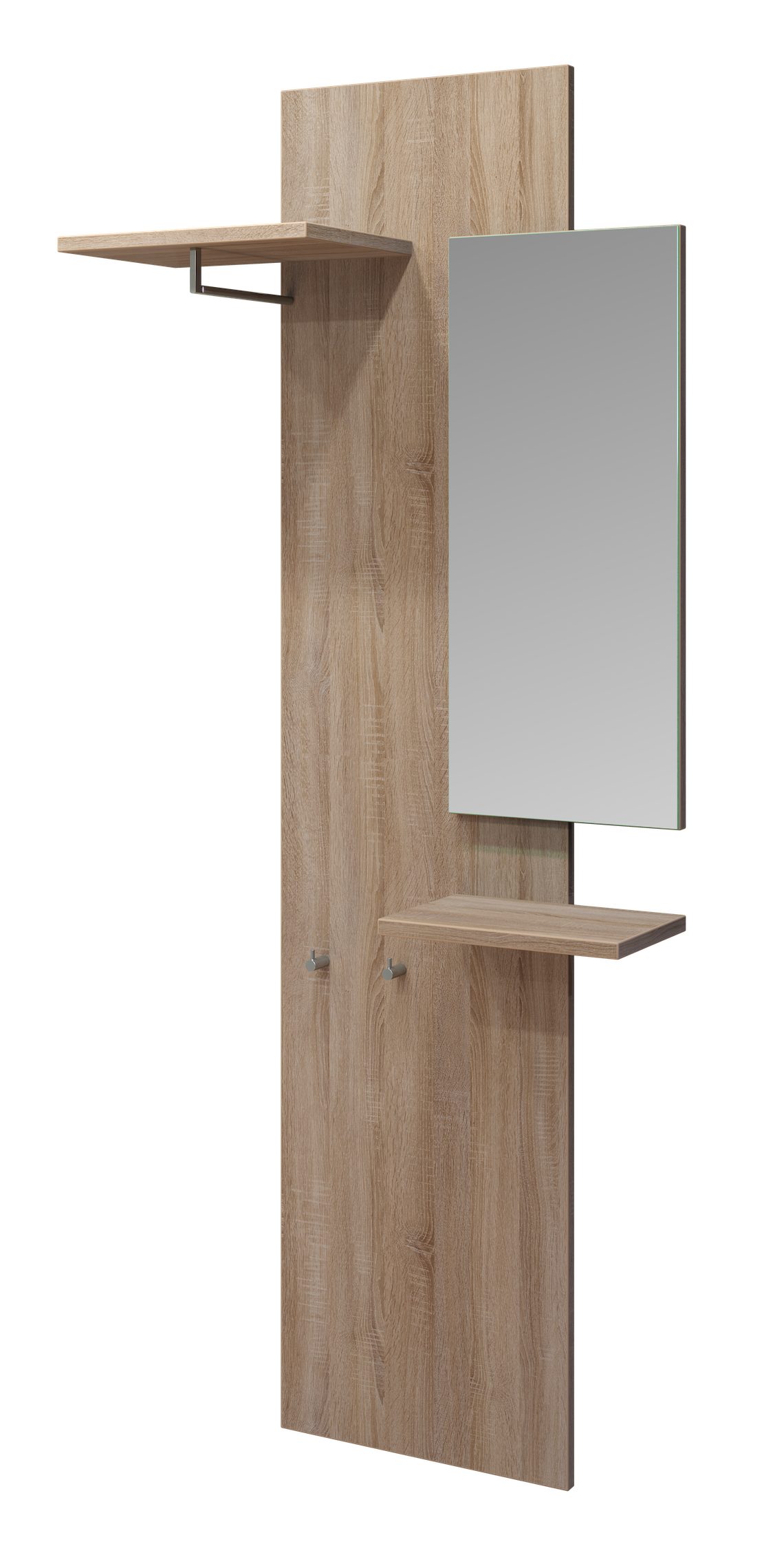 Die Garderobe Danica besticht durch ihre Asymmetrie sowie zwei Ablagen, Kleiderstange und einem Spiegel. Sie haben somit genügend Platz für mehrere Jacken, Schlüssel, Geldbörse und auch einem Hut. Zusätzlich lassen sich an den separaten Haken noch Taschen aufhängen.
