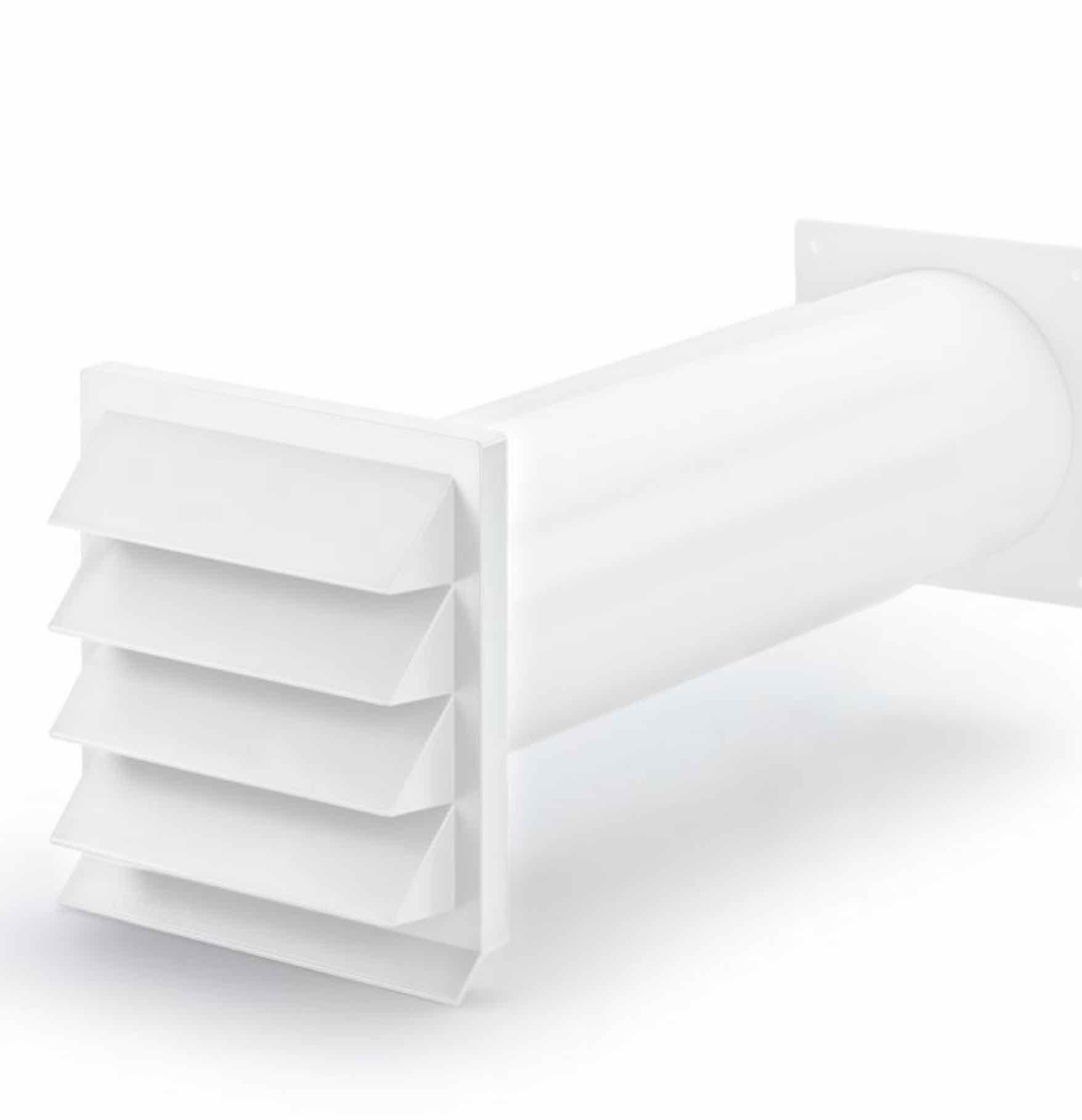 Die teleskopierbare Mauerdurchführung eignet sich ideal zum Anschluss von Rundrohren und ermöglicht eine individuelle Anpassung an verschiedene Wandstärken. Die Rückstauklappe verhindert das Eindringen von Luft aus dem Außenbereich durch das Rohr in die Küche.