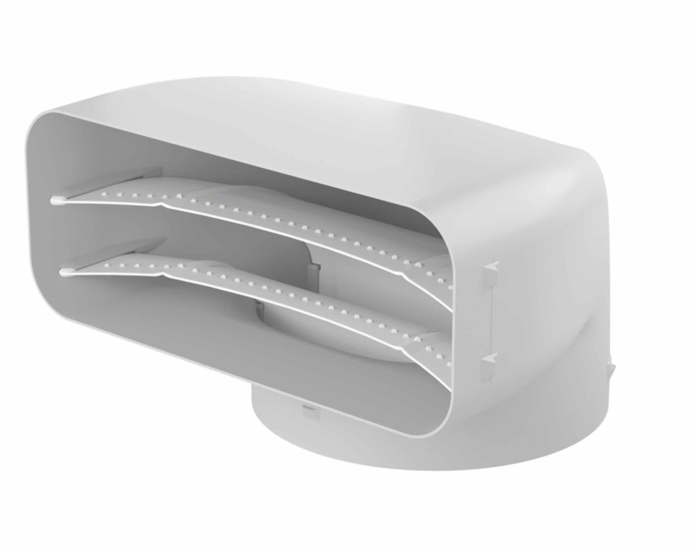 Das Umlenkstück ist für den Anschluss von runden oder flachen Abluftkanälen geeignet und ermöglicht auch den Anschluss eines Flexkanals.
