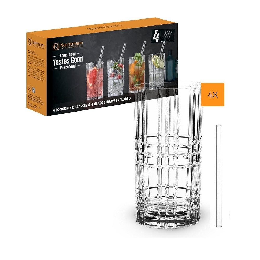 Nachtmann "Square" Longdrink Glas 4er Set + Trinkhalme