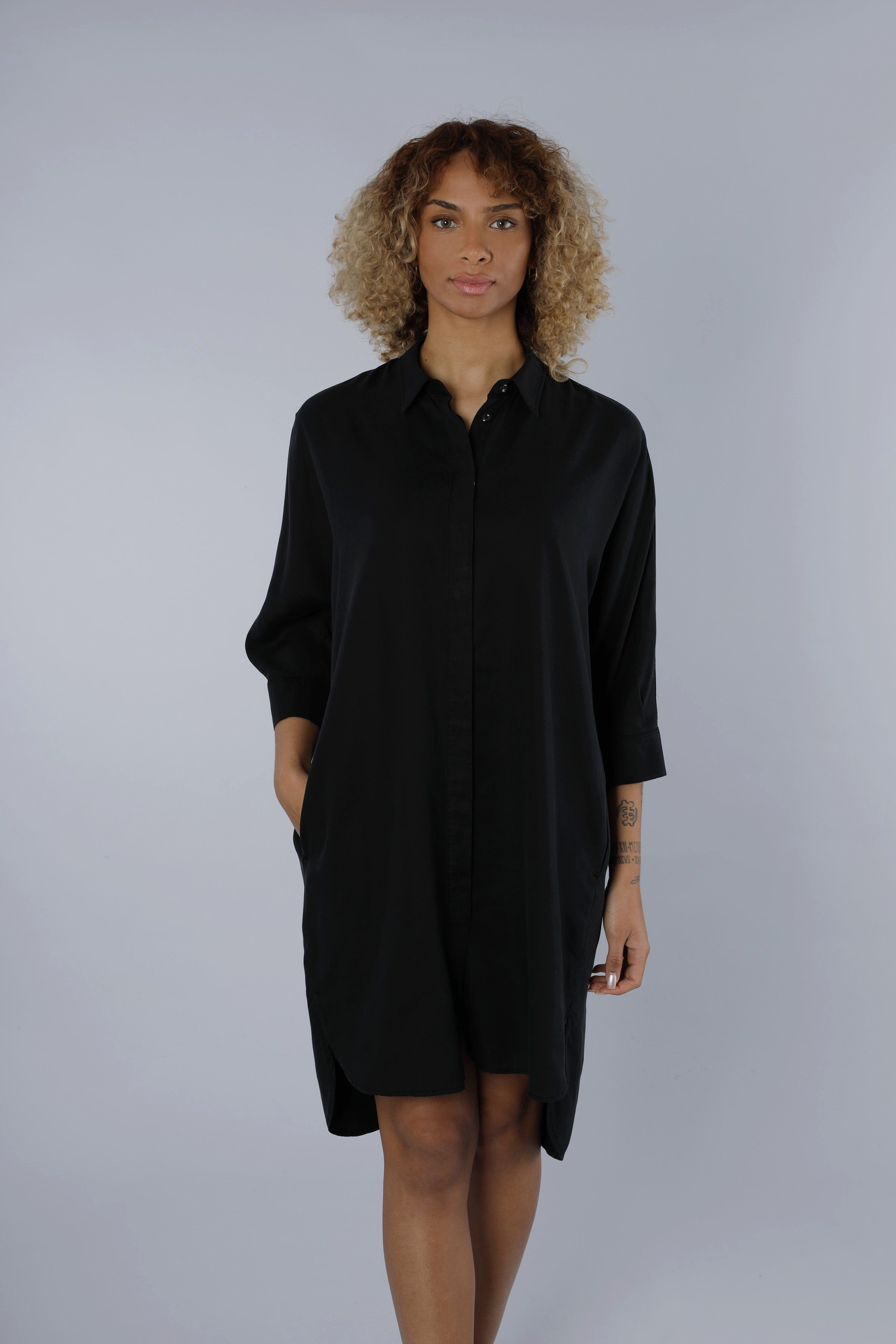 Entdecken Sie das elegante Kleid der Marke Nadine H. Das Button-down-Design mit versteckten Knöpfen verleiht dem Kleid eine raffinierte Note. Der Kragen und der leicht verlängerte Rücken sorgen für einen eleganten Look. Versteckte Seitentaschen an der Naht bieten praktische Aufbewahrungsmöglichkeiten. Ein vielseitiges und stilvolles Kleid für jeden Anlass.