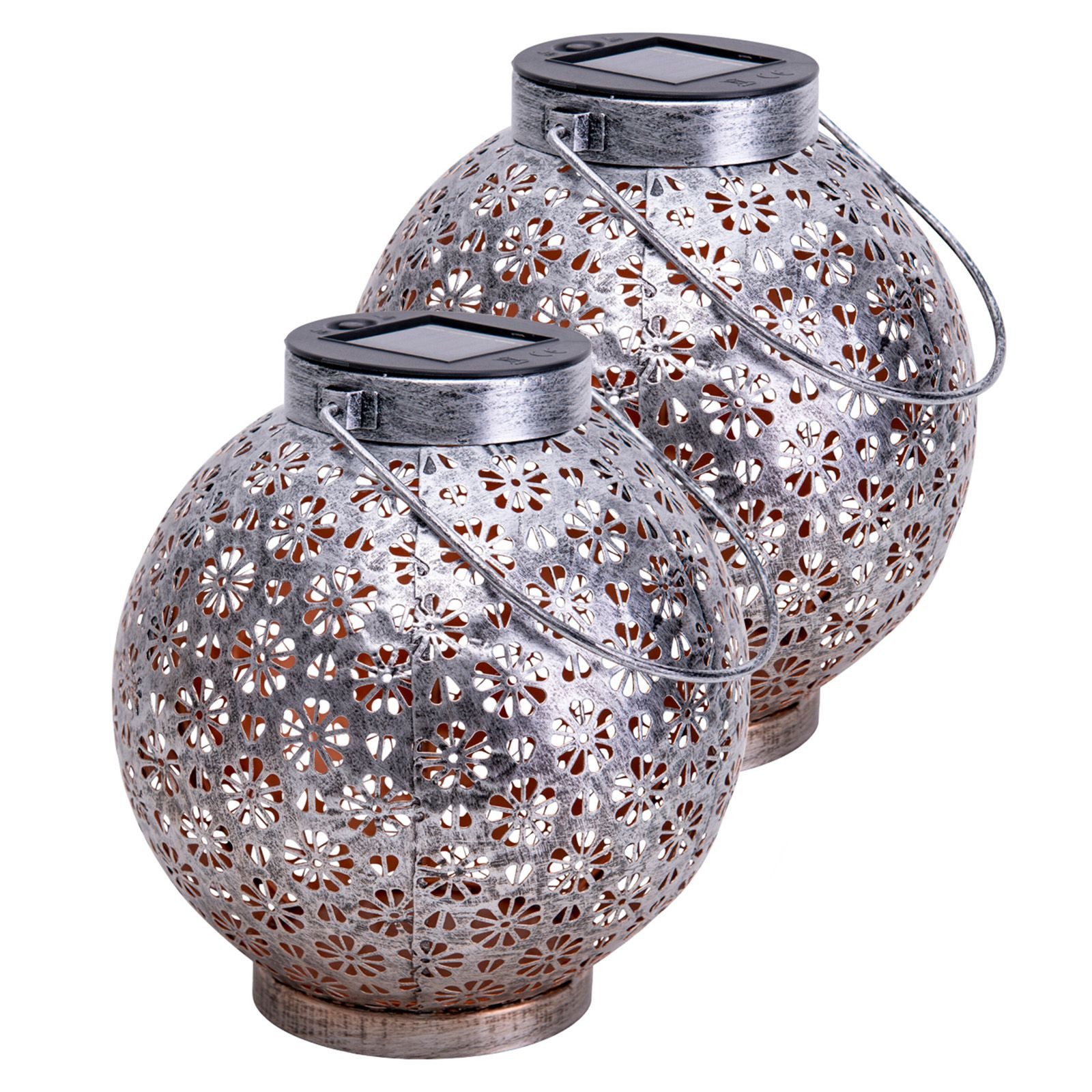 Das 2er-Set LED Deko-Solarleuchte verschönert deine Terrasse, den Eingangsbereich oder lauschige Plätzchen im Garten. Das Durchbruchmuster des Metallschirmes wirft ein schönes, warmweiße Blütenmeer aus Licht auf die Umgebung.