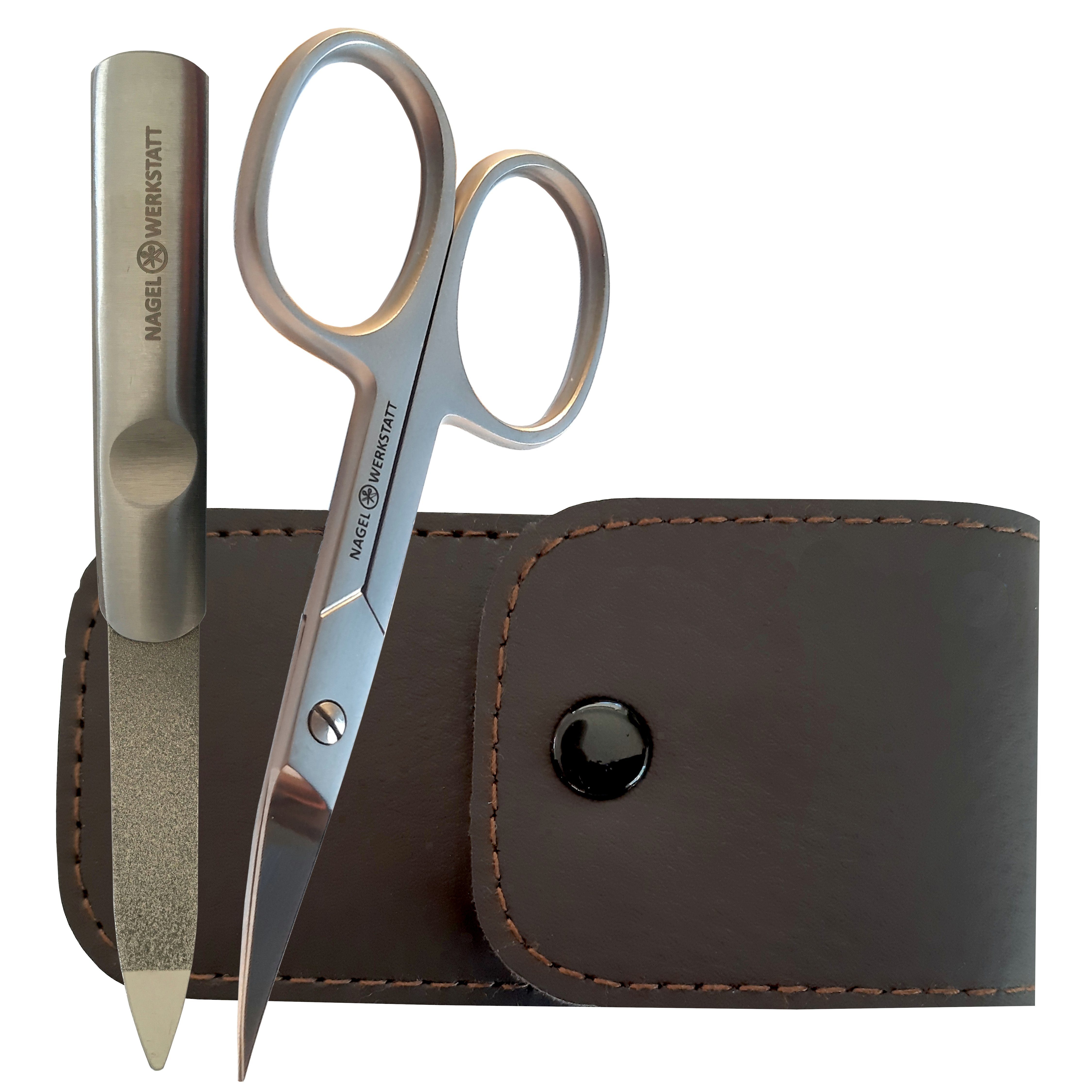 Lieferumfang | 1x Nagelwerkstatt Nagelschere - 1x Nagelfeile - 1x Etui aus Kunstleder |