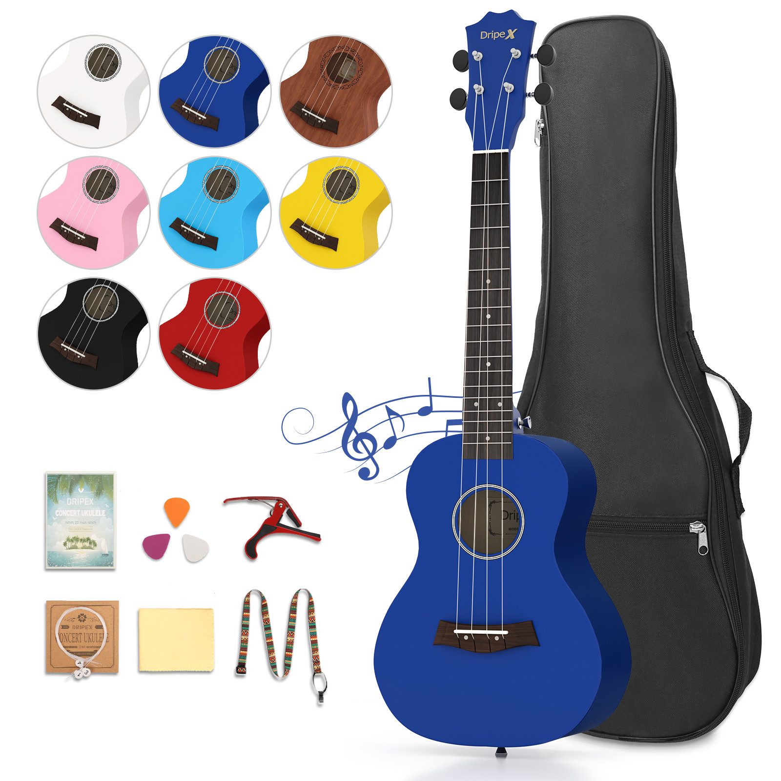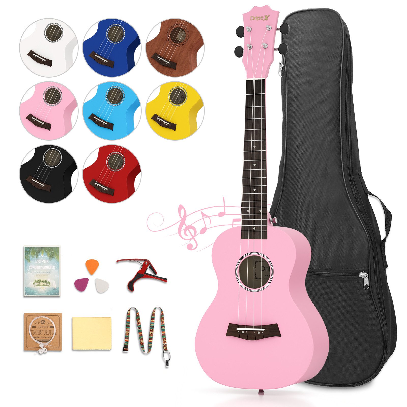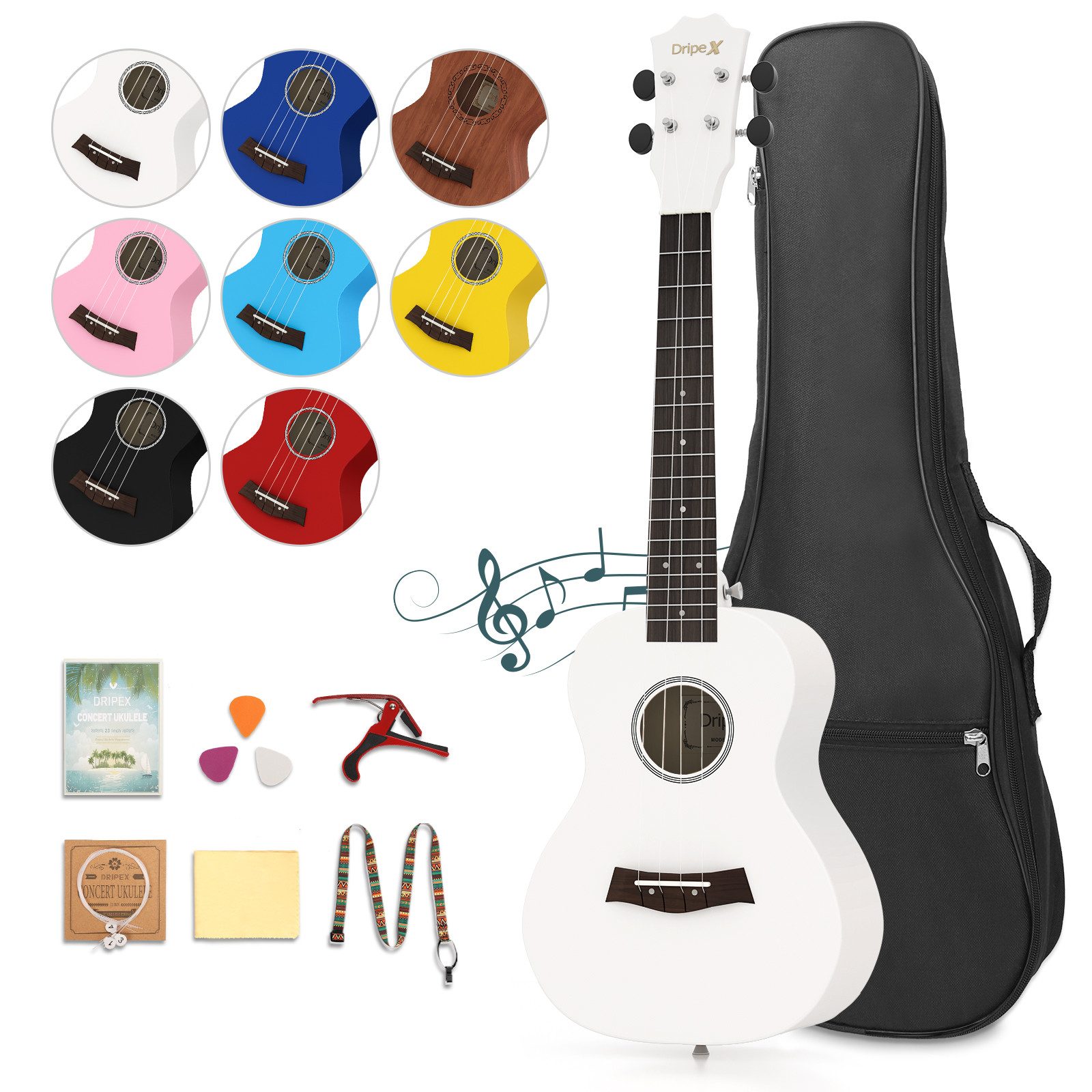 Ukulele Anfänger Set mit 3 farbigen Plektren, praktischen Tasche, Lehrbuch. Super leicht transportabel - die Ukulele in der Ukulele Bag mitnehmen und spielen wo immer man ist