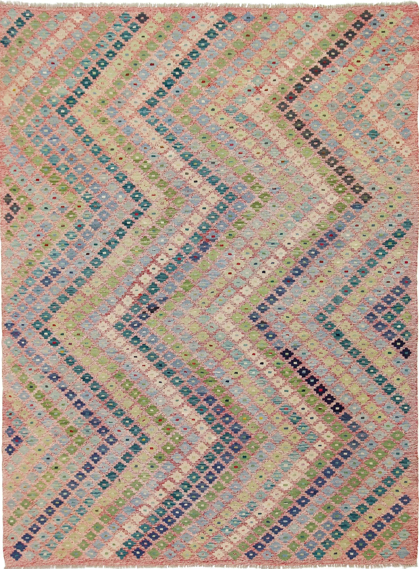 Dieser Kelim wurde von Hand aus natürlicher Wolle gewebt. Kelims erfreuten sich in den letzten Jahren großer Beliebtheit aufgrund ihrer lebendigen Farben und ihrer zeitlosen geometrischen Designs. Darüber hinaus verkörpert dieser Kelim eine jahrhundertealte Handwerkskunst. Er stammt aus dem Land Afghanistan, das für eine lange Tradition der Teppichknüpfung und -weberei bekannt ist. Dieser Teppich wiegt nur 9.00 kg und ist damit leicht genug, um ihn schnell in einem anderen Raum zu platzieren oder ihn sogar als Decke oder Wandteppich zu verwenden. Der Ursprung dieses Teppichs wird in einem separaten Zertifikat bestätigt.