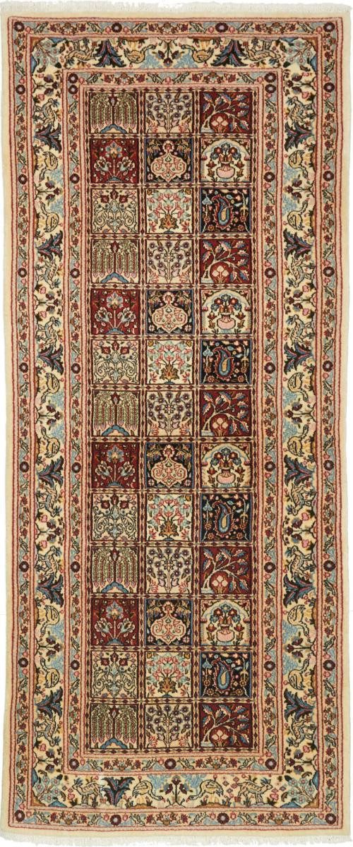 Dieser persische Moud Teppich wurde von Hand geknüpft, auf die traditionellste Art und Weise, Teppiche herzustellen. Mit seiner zertifizierten Herkunft verkörpert der Moud Teppich ein Höchstmaß an Kunsthandwerk und die wahrscheinlich aufwändigste Art, einen Teppich herzustellen. Er besitzt eine Dichte von 200000 / m² und ist damit ein sehr feines Kunstwerk mit einer langen Lebensdauer. Der Teppich wurde über einen Zeitraum von mehreren Monaten geknüpft und hat eine Размер von 202 mal 82. Dank der alten Handwerkskunst hat er eine Dicke von nur 12 mm, ein Indikator für hohe Qualität. Der Teppich besteht aus Wolle mit Seide und wurde mit natürlichen Farbstoffen gefärbt. Dank des natürlichen Materials ist dieser Perserteppich ideal auch für Fußbodenheizungen und Kinder. Er wiegt 6.00 kg und befindet sich im perfekten Zustand. Die Herkunft des Teppichs wird von unseren Experten durch ein offizielles Zertifikat bestätigt.