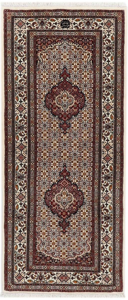 Dieser persische Moud Teppich wurde von Hand geknüpft, auf die traditionellste Art und Weise, Teppiche herzustellen. Mit seiner zertifizierten Herkunft verkörpert der Moud Teppich ein Höchstmaß an Kunsthandwerk und die wahrscheinlich aufwändigste Art, einen Teppich herzustellen. Er besitzt eine Dichte von 350000 / m² und ist damit ein sehr feines Kunstwerk mit einer langen Lebensdauer. Der Teppich wurde über einen Zeitraum von mehreren Monaten geknüpft und hat eine Размер von 202 mal 85. Dank der alten Handwerkskunst hat er eine Dicke von nur 12 mm, ein Indikator für hohe Qualität. Der Teppich besteht aus Handgesponnene Wolle und wurde mit natürlichen Farbstoffen gefärbt. Dank des natürlichen Materials ist dieser Perserteppich ideal auch für Fußbodenheizungen und Kinder. Er wiegt 6.00 kg und befindet sich im perfekten Zustand. Die Herkunft des Teppichs wird von unseren Experten durch ein offizielles Zertifikat bestätigt.