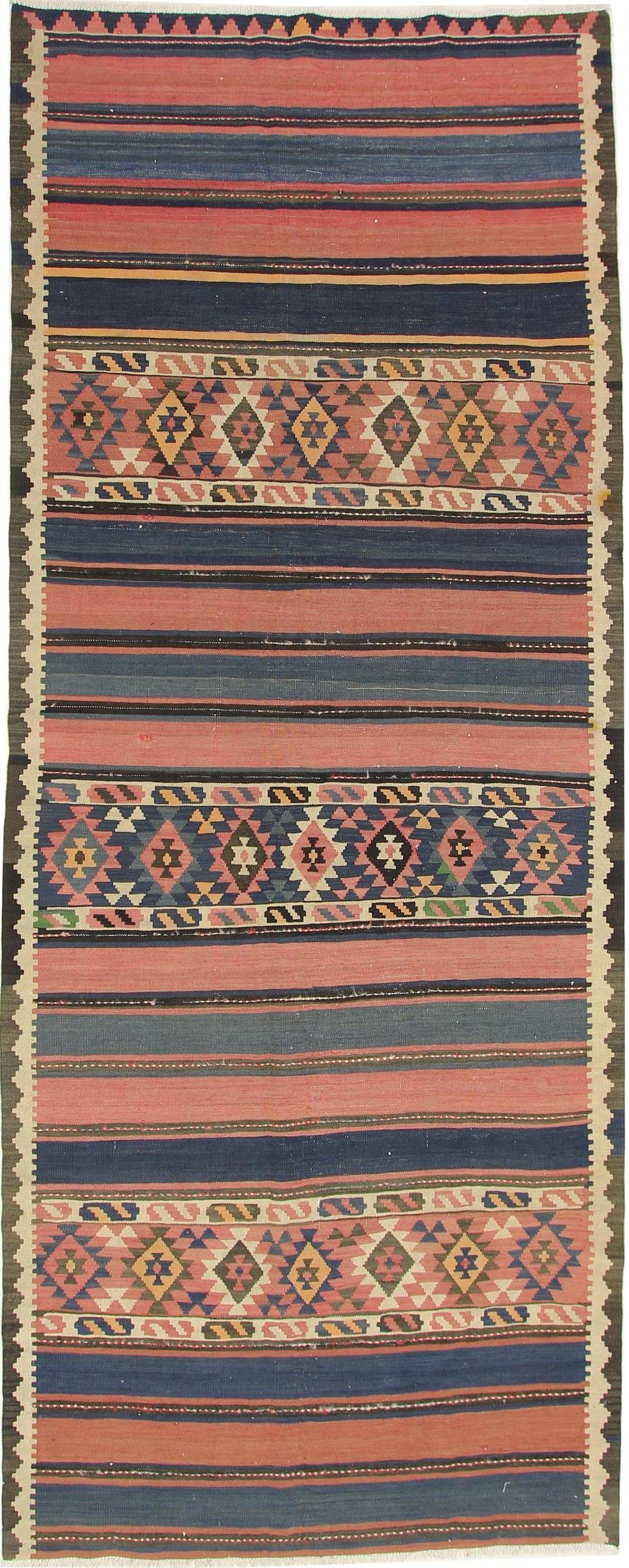 Dieser Kelim wurde von Hand aus natürlicher Wolle gewebt. Kelims erfreuten sich in den letzten Jahren großer Beliebtheit aufgrund ihrer lebendigen Farben und ihrer zeitlosen geometrischen Designs. Darüber hinaus verkörpert dieser Kelim eine jahrhundertealte Handwerkskunst. Er stammt aus dem Land Persien/Iran, das für eine lange Tradition der Teppichknüpfung und -weberei bekannt ist. Dieser Teppich wiegt nur 8.00 kg und ist damit leicht genug, um ihn schnell in einem anderen Raum zu platzieren oder ihn sogar als Decke oder Wandteppich zu verwenden. Der Ursprung dieses Teppichs wird in einem separaten Zertifikat bestätigt.