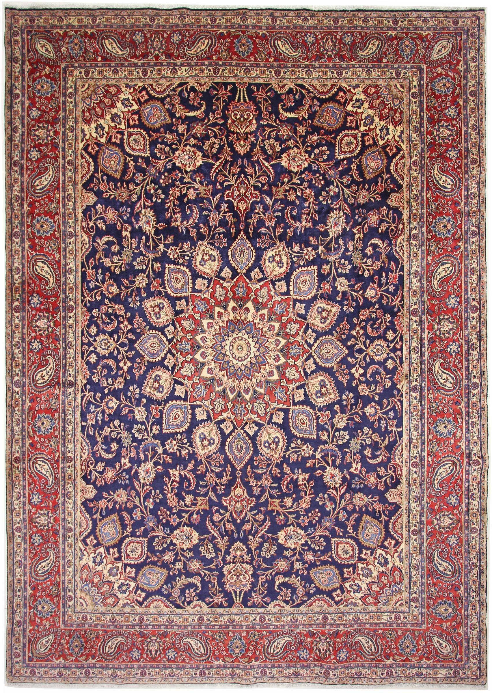 Dieser Hamadan Teppich stammt aus Persien und wurde von Nomaden in einem kleineren Dorf geknüpft. Seine Размер ist 425 mal 309 mit einem Gewicht von 39.00 kg. Dank seiner Herkunft wurde der Hamadan Teppich in monatelanger Handarbeit und in traditioneller Handwerkskunst gefertigt. Mit seinen geometrischen Mustern hat diese Art von persischem Teppich in den letzten Jahren wieder eine hohe Popularität erlangt. Mit einer Florhöhe von 8 mm und einer Knotendichte von 250000 / m² wurde der Teppich zu einem außergewöhnlich hohen Maß an Qualität und Robustheit gefertigt. Nomaden verwenden natürliche Farbstoffe für die Farben dieses Teppichs aus Wolle. Es befindet sich im perfekten Zustand. Sie werden mit diesem einzigartigen und zeitlosen Teppich von höchster Handwerkskunst garantiert sehr lange Freude haben.