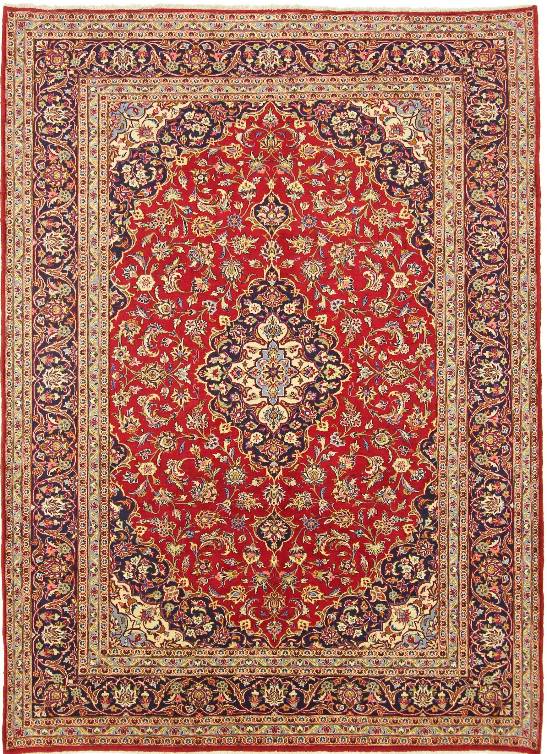 Dieser persische Keshan Teppich wurde von Hand geknüpft, auf die traditionellste Art und Weise, Teppiche herzustellen. Mit seiner zertifizierten Herkunft verkörpert der Keshan Teppich ein Höchstmaß an Kunsthandwerk und die wahrscheinlich aufwändigste Art, einen Teppich herzustellen. Es besitzt eine Dichte von 200000 / m² und ist damit ein sehr feines Kunstwerk mit einer langen Lebensdauer. Der Teppich wurde über einen Zeitraum von mehreren Monaten geknüpft und hat eine Размер von 349 mal 251. Dank der alten Handwerkskunst hat er eine Dicke von nur 12 mm, ein Indikator für hohe Qualität. Der Teppich besteht aus Wolle und wurde mit natürlichen Farbstoffen gefärbt. Dank des natürlichen Materials ist dieser Perserteppich ideal auch für Fußbodenheizungen und Kinder. Er wiegt 31.00 kg und befindet sich im perfekten Zustand. Die Herkunft des Teppichs wird von unseren Experten durch ein offizielles Zertifikat bestätigt.