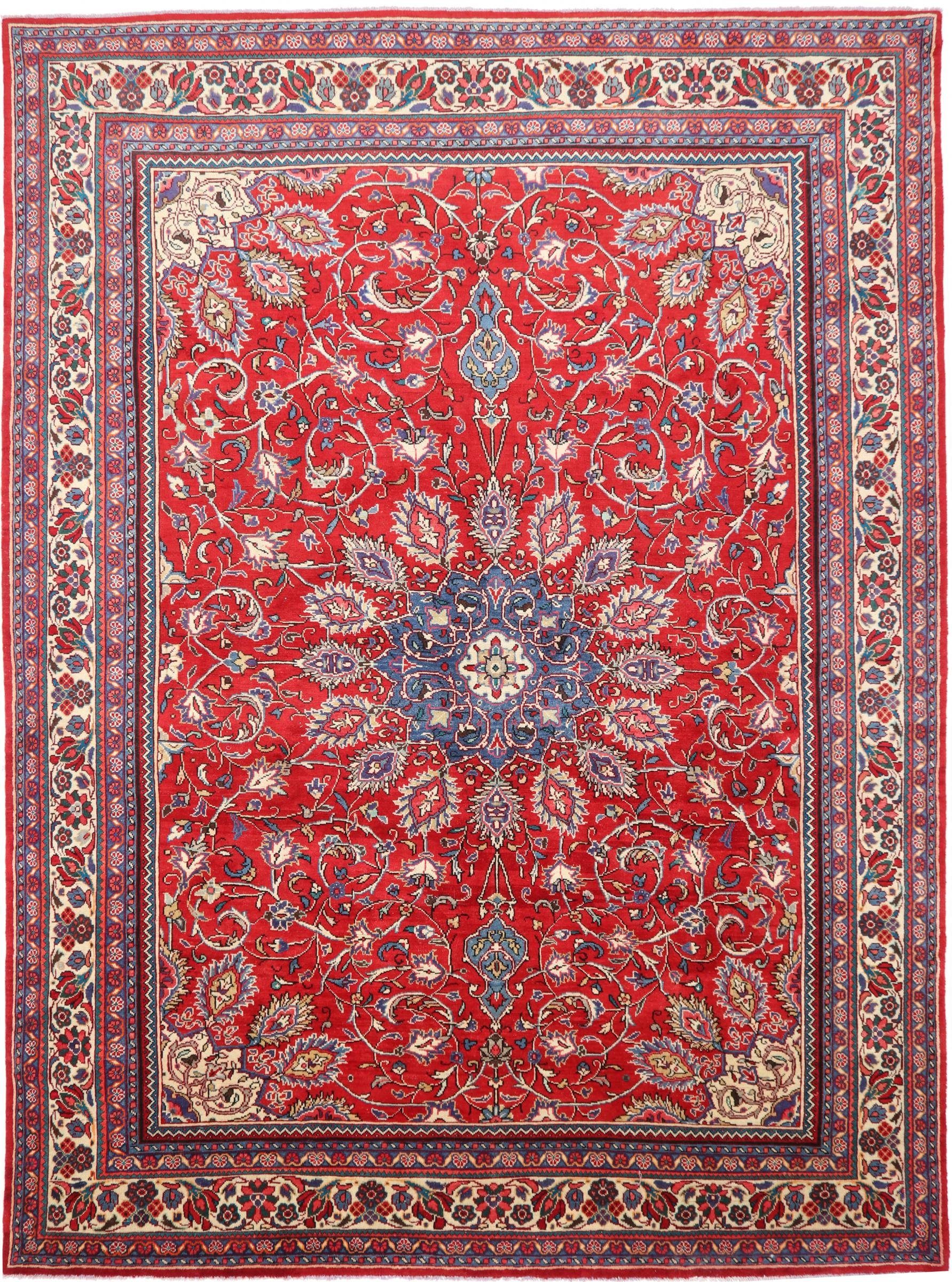 Dieser persische Mahal Teppich wurde von Hand geknüpft, auf die traditionellste Art und Weise, Teppiche herzustellen. Mit seiner zertifizierten Herkunft verkörpert der Mahal Teppich ein Höchstmaß an Kunsthandwerk und die wahrscheinlich aufwändigste Art, einen Teppich herzustellen. Es besitzt eine Dichte von 90000 / m² und ist damit ein sehr feines Kunstwerk mit einer langen Lebensdauer. Der Teppich wurde über einen Zeitraum von mehreren Monaten geknüpft und hat eine Размер von 427 mal 316. Dank der alten Handwerkskunst hat er eine Dicke von nur 12 mm, ein Indikator für hohe Qualität. Der Teppich besteht aus Wolle und wurde mit natürlichen Farbstoffen gefärbt. Dank des natürlichen Materials ist dieser Perserteppich ideal auch für Fußbodenheizungen und Kinder. Er wiegt 47.00 kg und befindet sich im guten Zustand. Die Herkunft des Teppichs wird von unseren Experten durch ein offizielles Zertifikat bestätigt.
