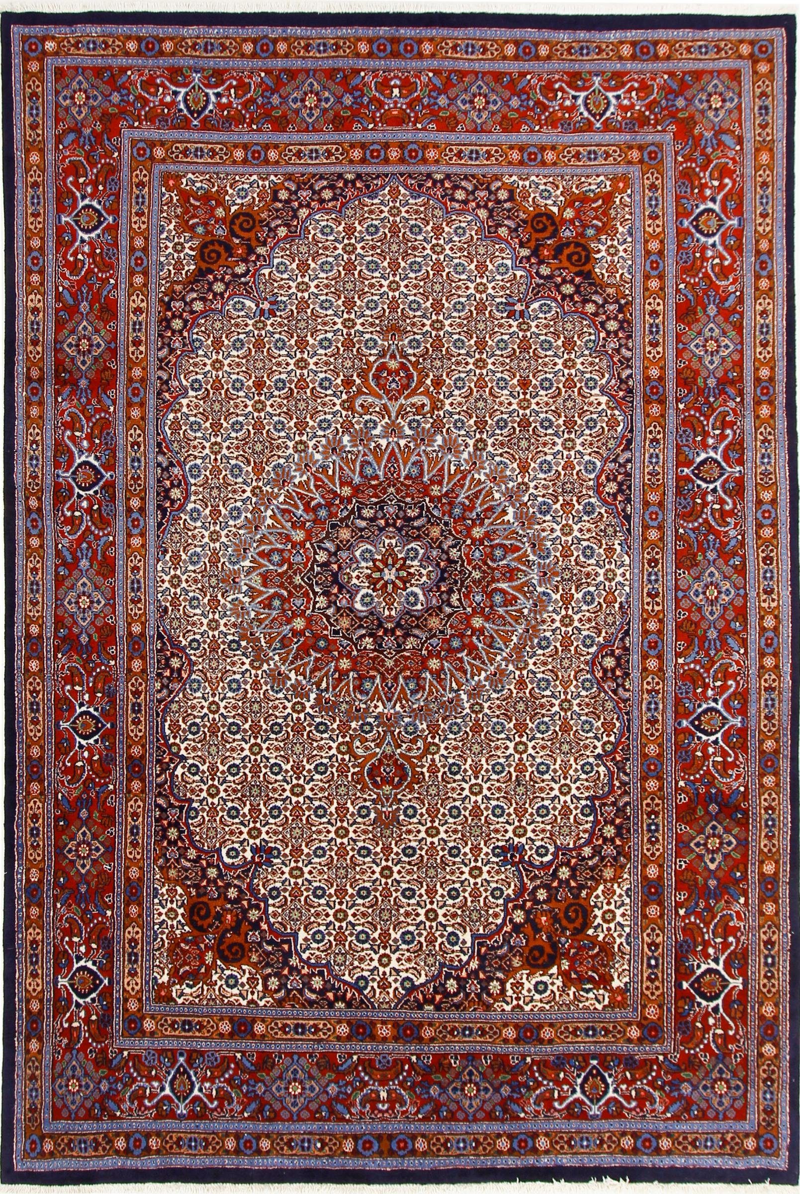 Dieser persische Moud Teppich wurde von Hand geknüpft, auf die traditionellste Art und Weise, Teppiche herzustellen. Mit seiner zertifizierten Herkunft verkörpert der Moud Teppich ein Höchstmaß an Kunsthandwerk und die wahrscheinlich aufwändigste Art, einen Teppich herzustellen. Es besitzt eine Dichte von 300000 / m² und ist damit ein sehr feines Kunstwerk mit einer langen Lebensdauer. Der Teppich wurde über einen Zeitraum von mehreren Monaten geknüpft und hat eine Размер von 296 mal 200. Dank der alten Handwerkskunst hat er eine Dicke von nur 12 mm, ein Indikator für hohe Qualität. Der Teppich besteht aus Wolle und wurde mit natürlichen Farbstoffen gefärbt. Dank des natürlichen Materials ist dieser Perserteppich ideal auch für Fußbodenheizungen und Kinder. Er wiegt 21.00 kg und befindet sich im perfekten Zustand. Die Herkunft des Teppichs wird von unseren Experten durch ein offizielles Zertifikat bestätigt.