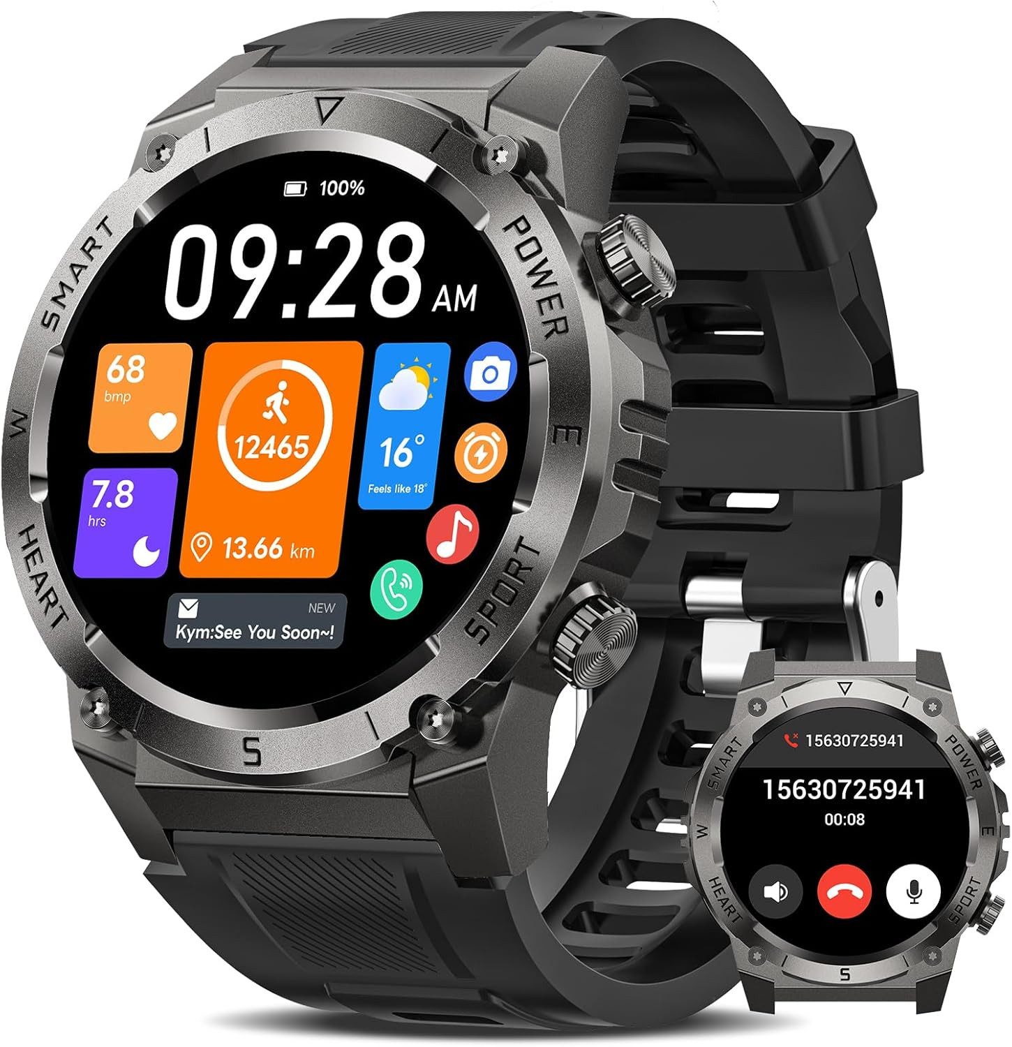 Nimm Anrufe direkt über die Uhr an, empfange WhatsApp/Facebook-Nachrichten, nutze SOS, Sprachassistent, Wetterfunktionen, Bewegungserinnerungen & Musiksteuerung.