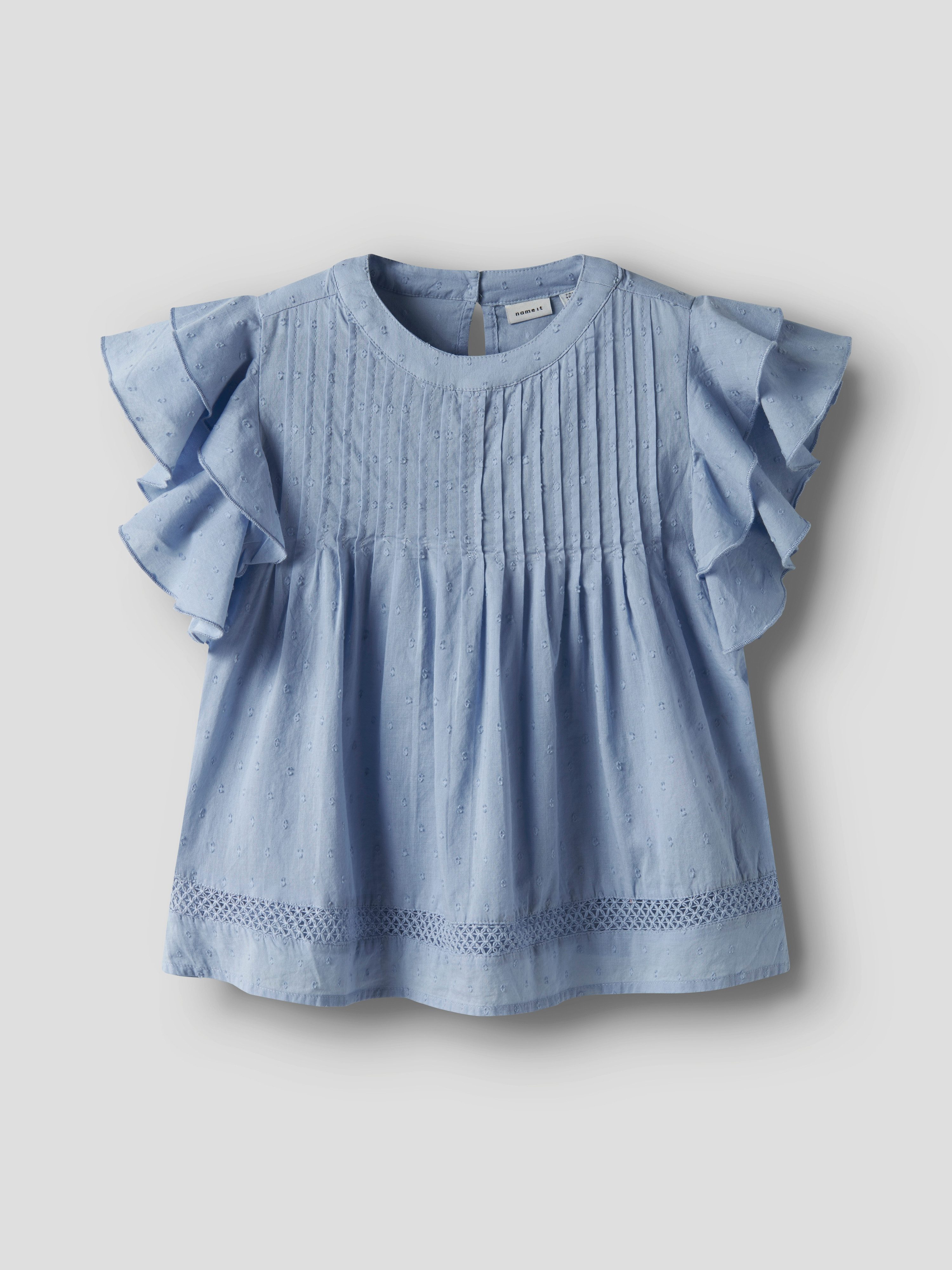 Die Kurzarmbluse »NKFFARIDE SS TOP NOOS« von Name It ist sowohl bei schicken Anlässen als auch auf Familienfeiern eine gute Option. Die kurzen Flügelärmel sind weit geschnitten, haben eine flügelähnliche Form und sind deshalb sehr bequem. Sie enden in einem Volant-Abschluss. Die Bluse hat einen Rundhalsausschnitt und ist normal lang sowie locker geschnitten, sodass der Tragekomfort nicht zu kurz kommt.