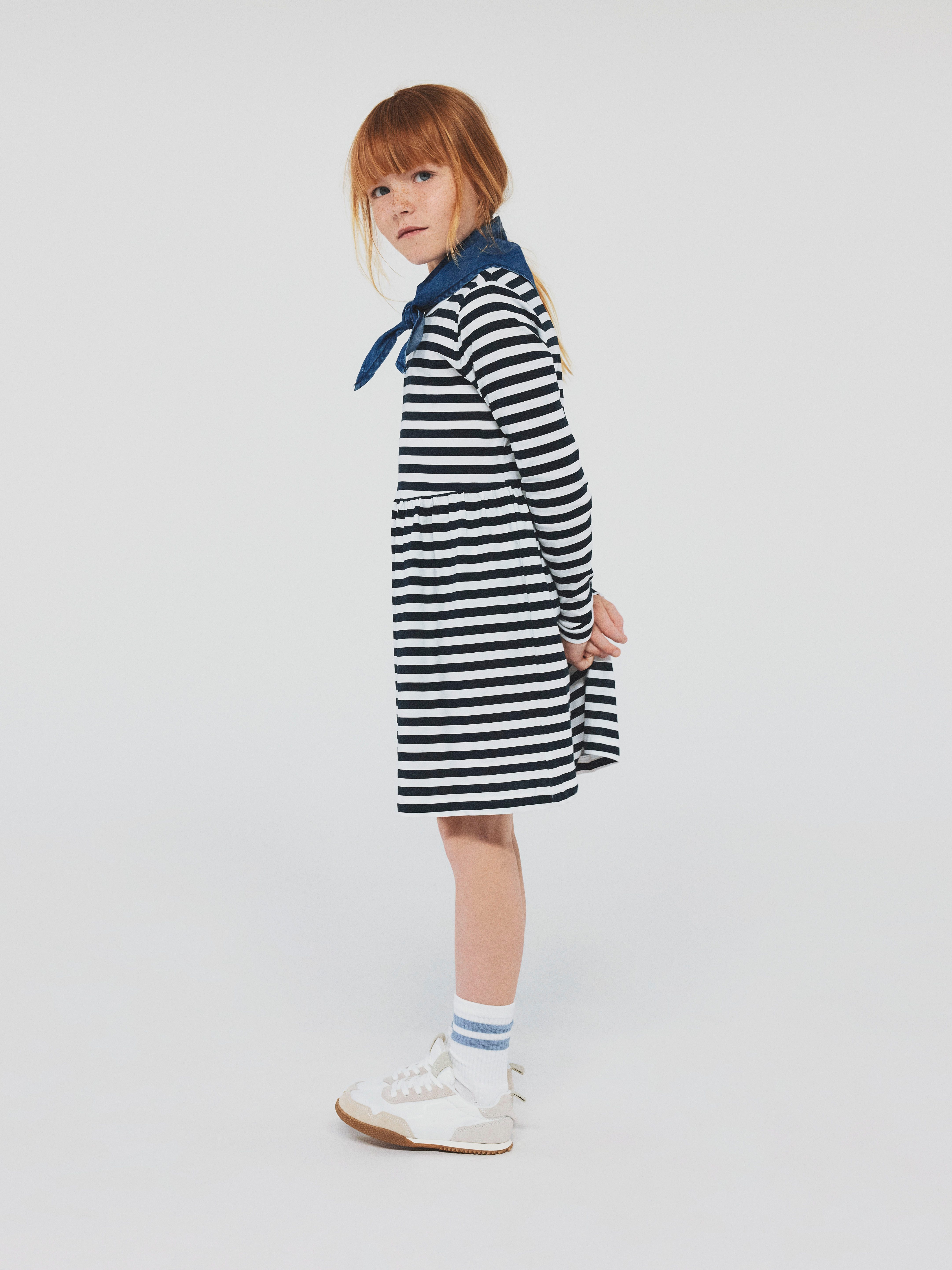 Wenn es auf den Spielplatz geht, kann dieses Kleid zu einer Strumpfhose getragen werden. Ein Jäckchen wärmt, wenn es kühler wird.