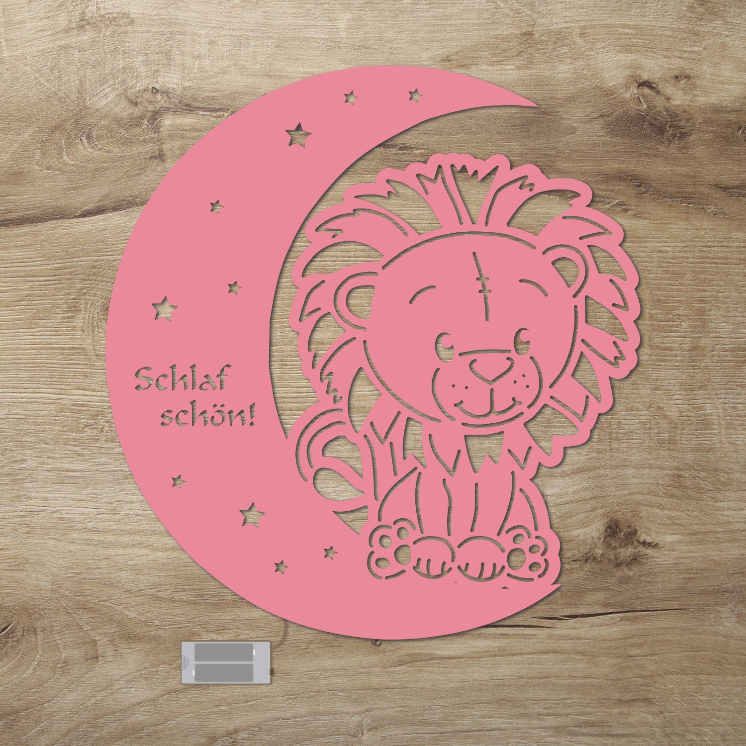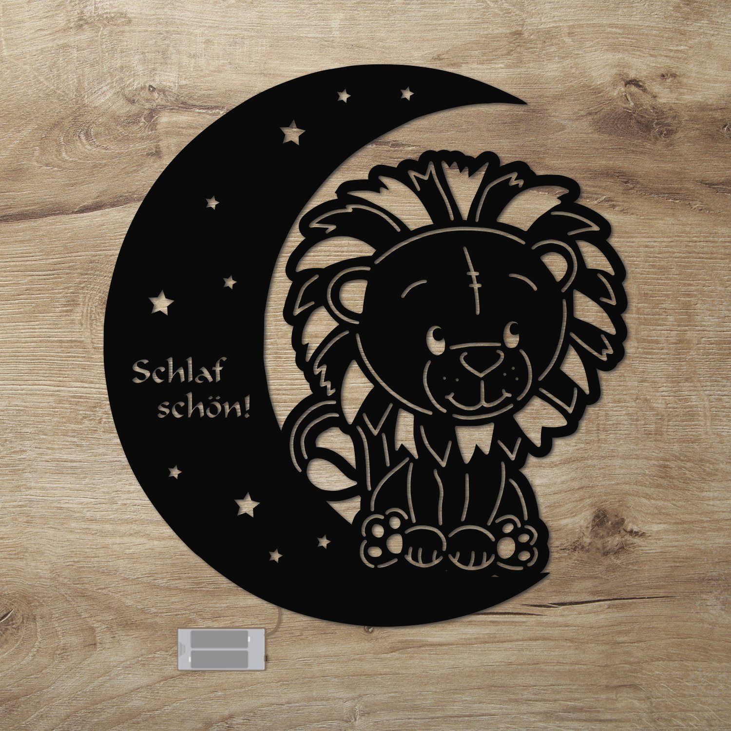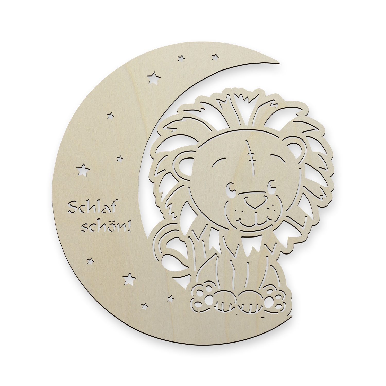 Dieses 'Schlaf schön' Nachtlicht aus Holz ist Dekoration und Schlummerlicht in Einem: Tagsüber verziert der niedliche Löwe auf dem Mond die Wand und regt die kindliche Fantasie an, nachts dient er, dank LED-Hinterleuchtung, als sanfte Lichtquelle. Die 'Schlaf schön' Lampe leuchtet deinem Kind den Weg zur Tür und hilft beim Einschlafen, wenn es sich noch vor der Dunkelheit fürchtet.