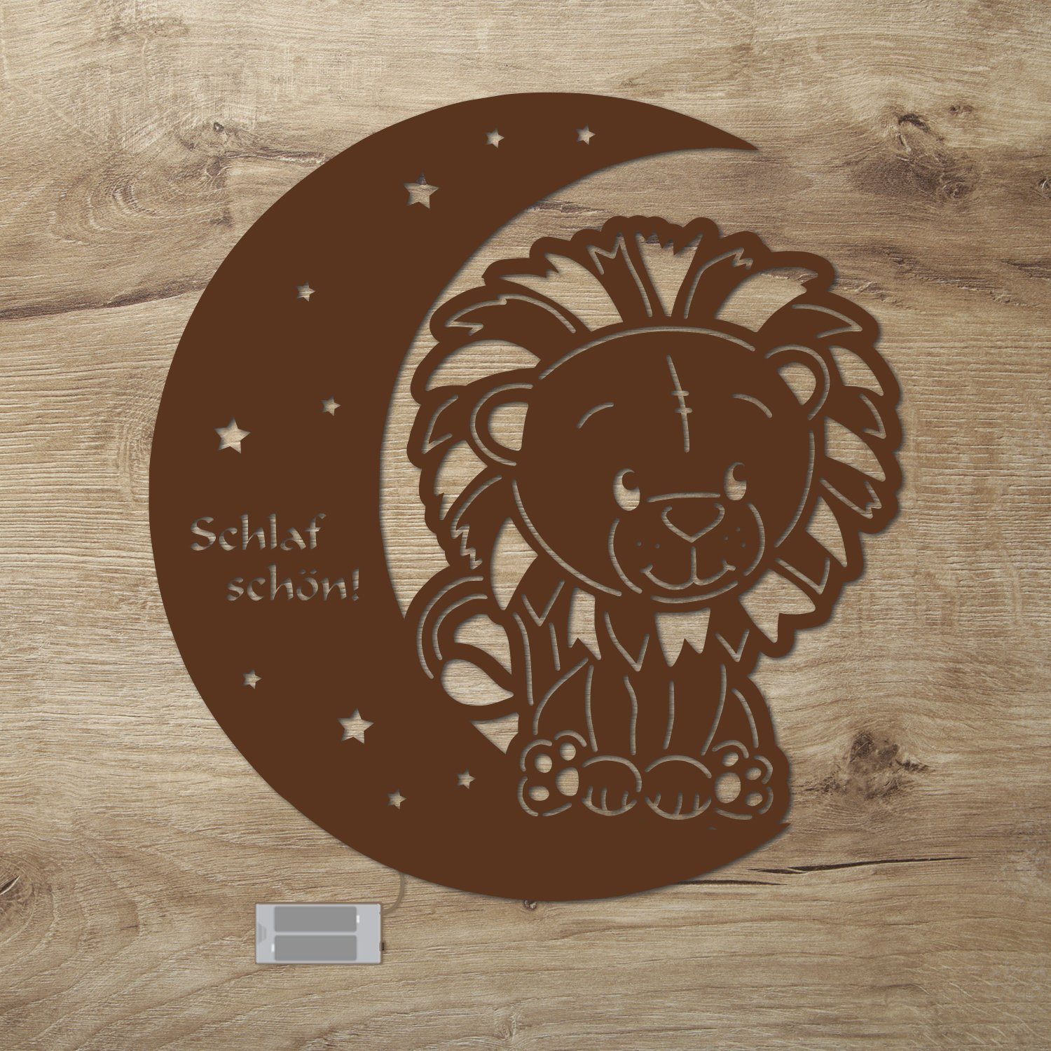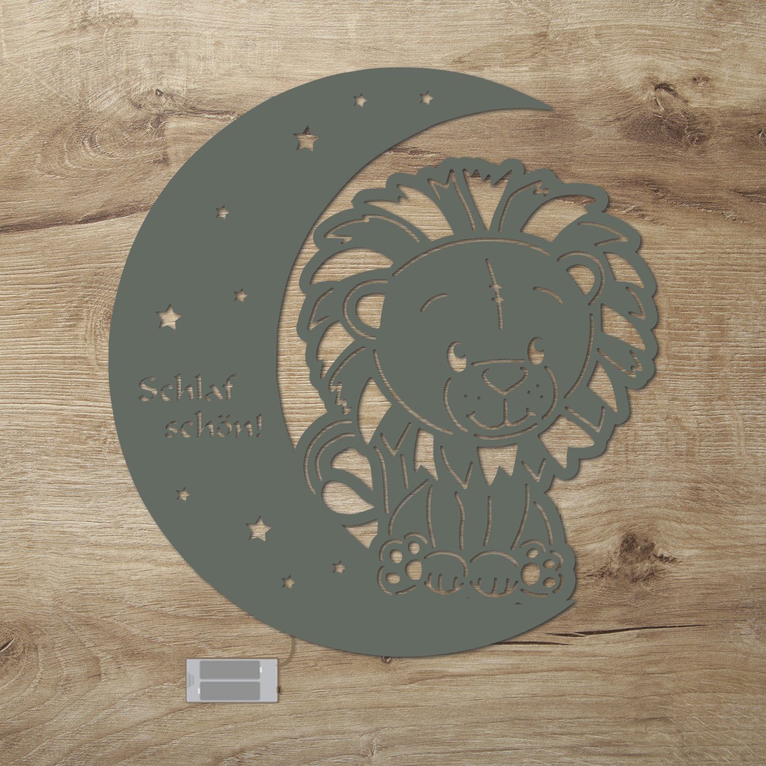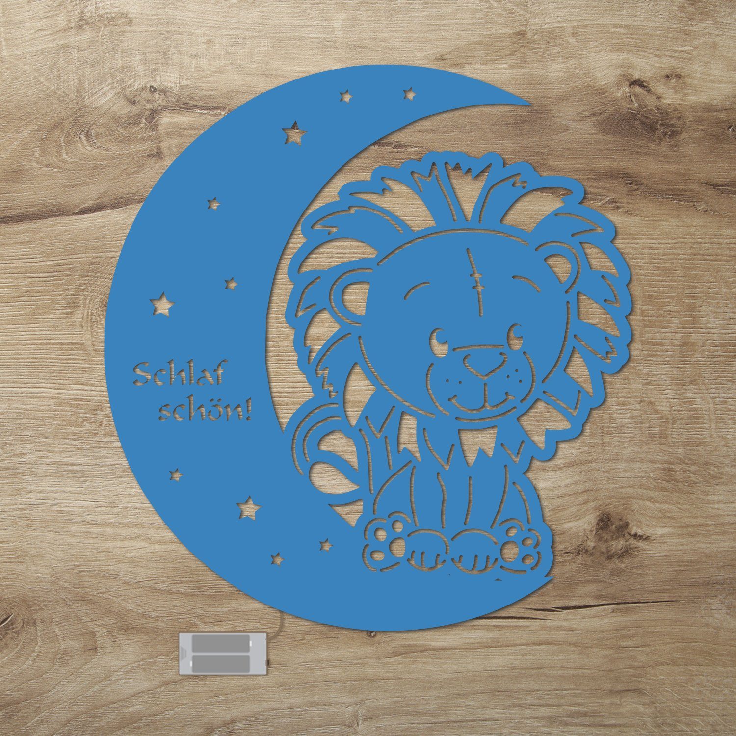 Dieses 'Schlaf schön' Nachtlicht aus Holz ist Dekoration und Schlummerlicht in Einem: Tagsüber verziert der niedliche Löwe auf dem Mond die Wand und regt die kindliche Fantasie an, nachts dient er, dank LED-Hinterleuchtung, als sanfte Lichtquelle. Die 'Schlaf schön' Lampe leuchtet deinem Kind den Weg zur Tür und hilft beim Einschlafen, wenn es sich noch vor der Dunkelheit fürchtet.