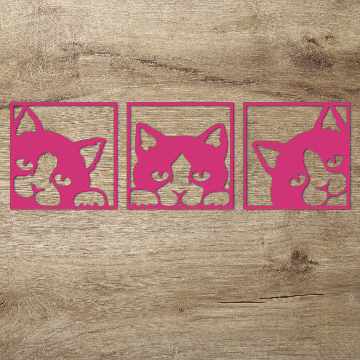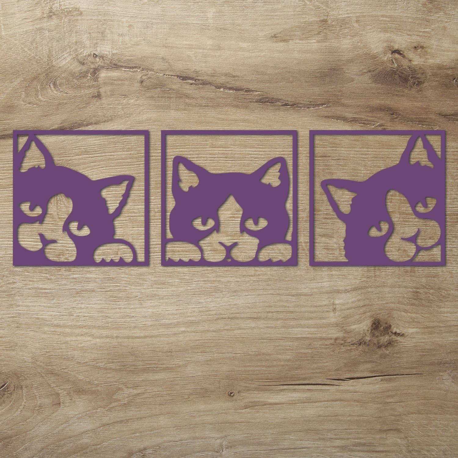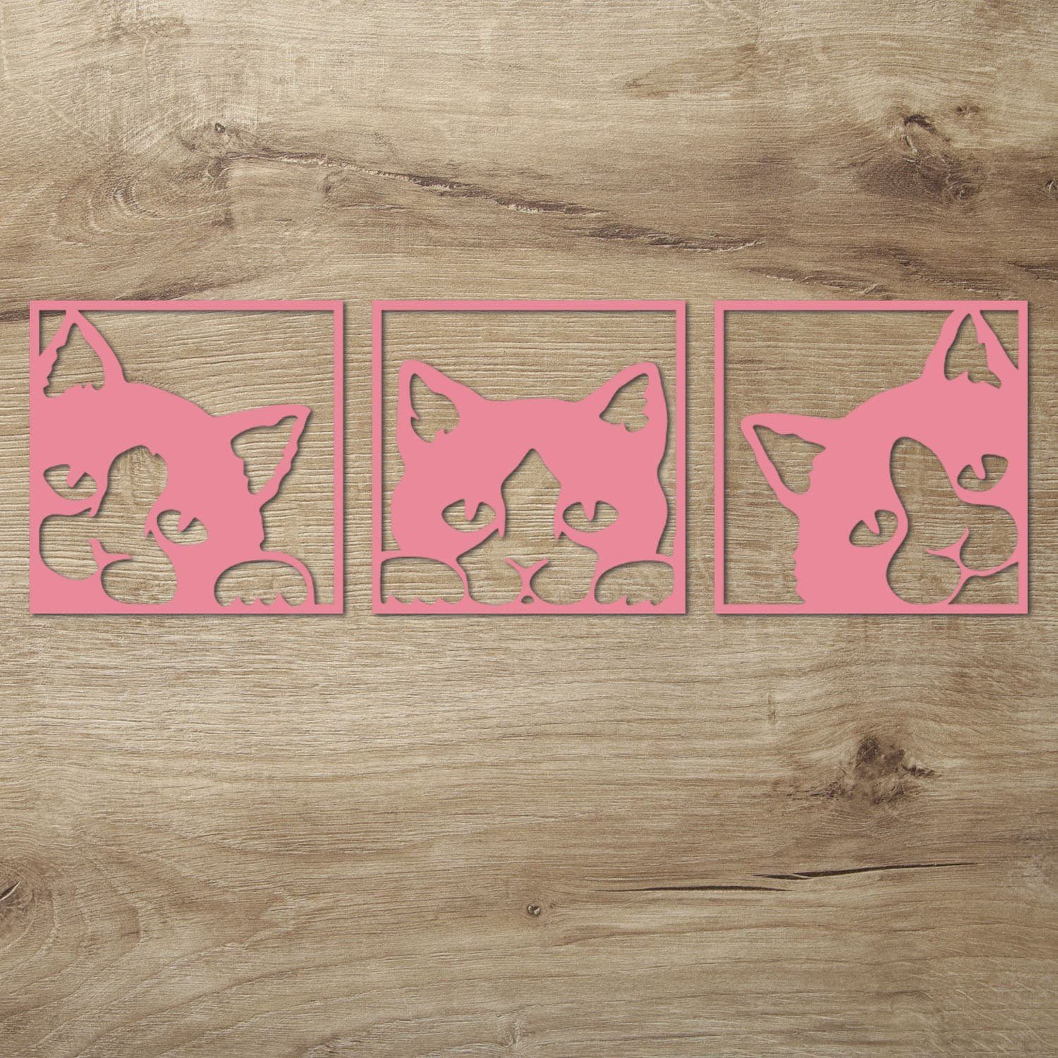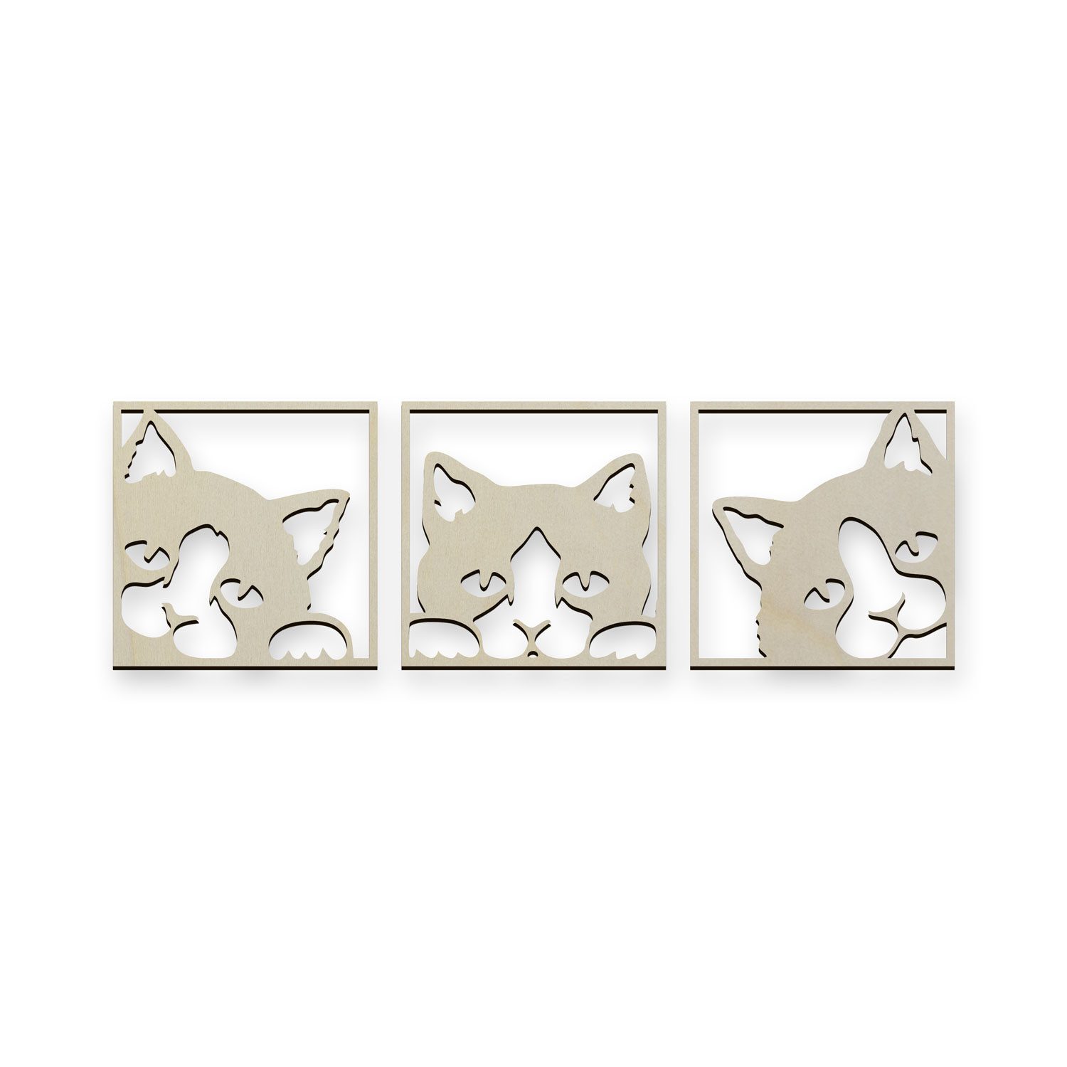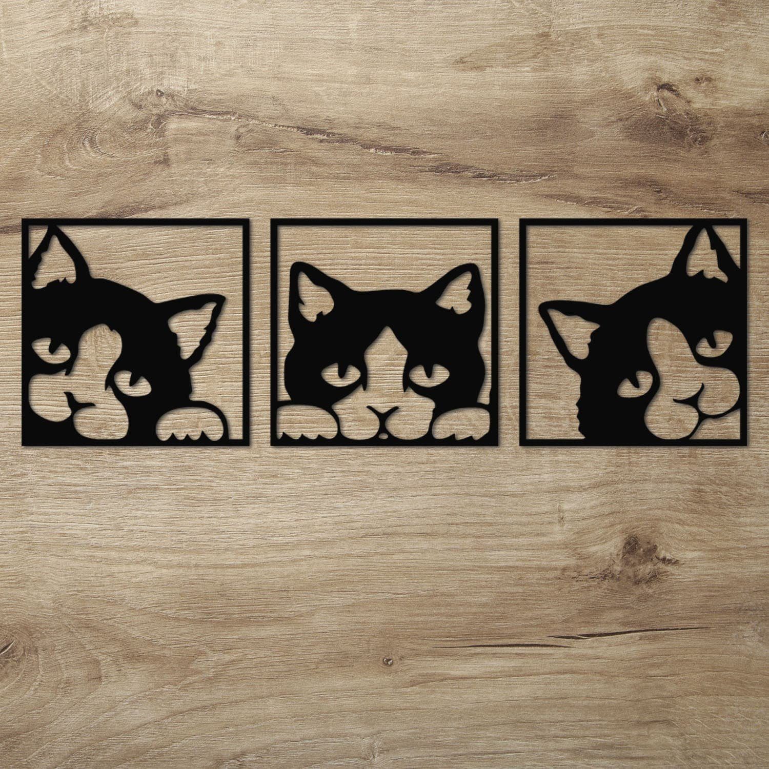 Diese Wanddeko Idee für Katzen Fans ist auch ein tolles Geschenk zum Geburtstag, Muttertag oder Weihnachten. Mit der dezenten Gestaltung passt es zu jedem erdenklichen Wohnstil. Die 3 Einzelbilder werden mit modernster Lasercut Technik sauber und präzise aus 6 mm starkem Pappelsperrholz herausgearbeitet.